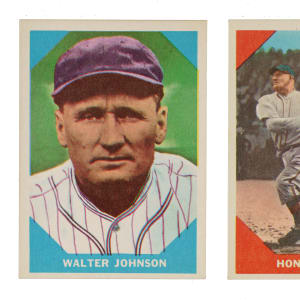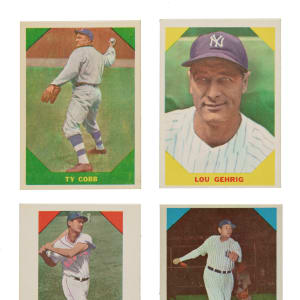 Presented is a complete 79-card set of 1960 Fleer All-Time Greats. This is a very attractive set of one of card collecting's all-time great sets (no pun intended!) featuring old-timers, which was no doubt the introduction to baseball history for countless thousands of youngsters. Condition is 77% Ex to Ex-Mt (including a few Nr/Mt) and 23% Vg to Vg-Ex (including a couple slightly lesser). Keys: #3 Ruth (Ex), 6 Johnson (Ex), 28 Gehrig (Vg-Ex+), 42 Cobb (Nr/Mt), 62 Wagner (Vg-Ex), and 72 T. Williams (Ex-Mt). In 1960, Fleer would have preferred to put out a set featuring current stars, but was unable to do so due to Topps' ironclad contracts with all the modern players (except Ted Williams), so Fleer came up with the idea for this old-timers set to keep its foot in the trading-card game. This is a very attractive mid-grade complete set of this historic, classic, and often overlooked Fleer issue. Total: 79 cards.