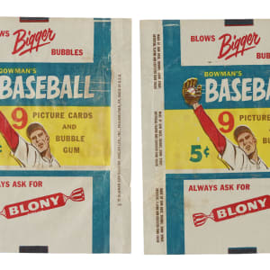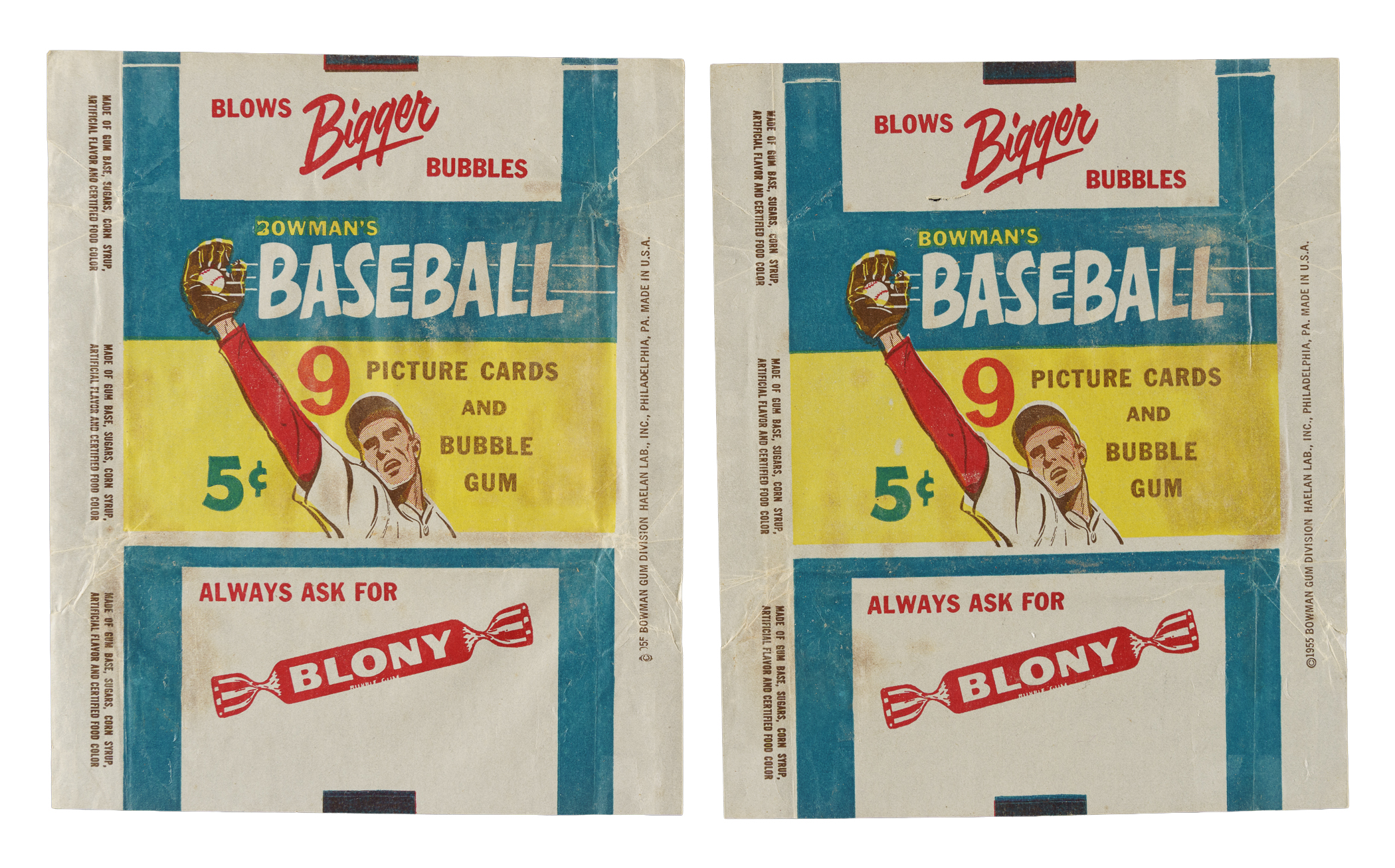 Pair of original 1955 Bowman Five-Cent Wrappers. Condition is Fr-Gd due to staining on reverse and Pr-Fr.