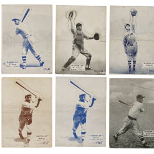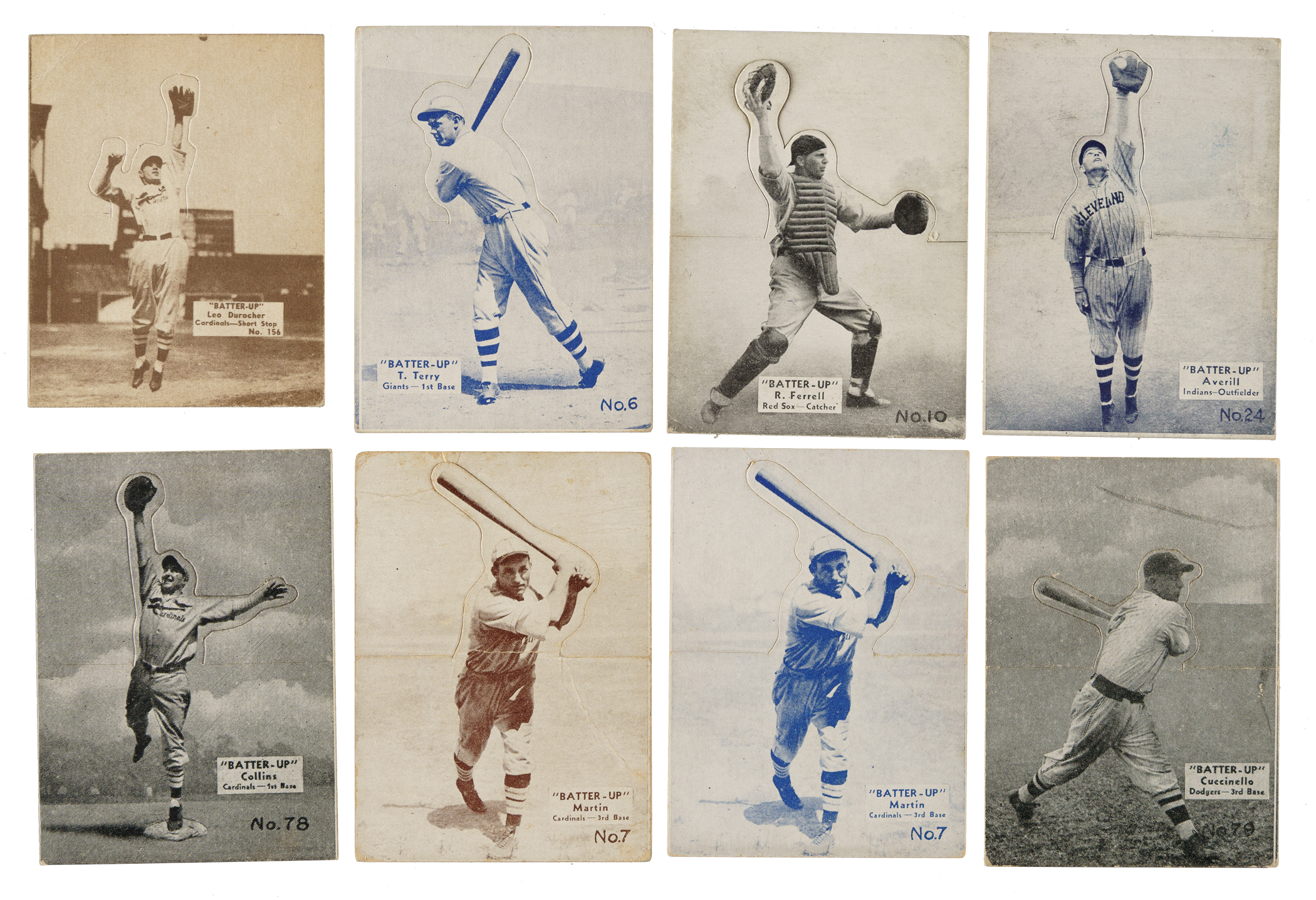 Presented is a collection of eight 1934-1936 R318 Batter-Up baseball cards highlighted by Durocher, Terry, Ferrell, and Averill. Condition ranges from Pr to Vg-Ex (averaging Gd/Vg). This collection consists of the following: #6 Terry (ink mark on reverse, otherwise Gd-Vg), two 7 (one blue and one brown), 10 Ferrell (Gd), 24 Averill (Vg), 78, 79, and 156 Durocher (Gd+). Total: 8 cards.