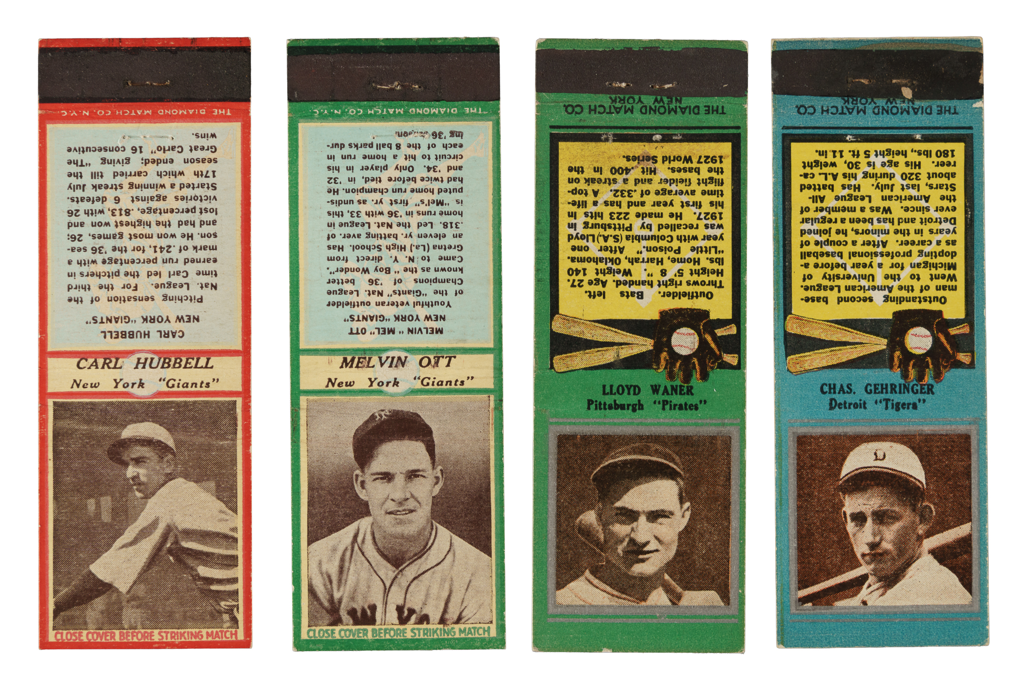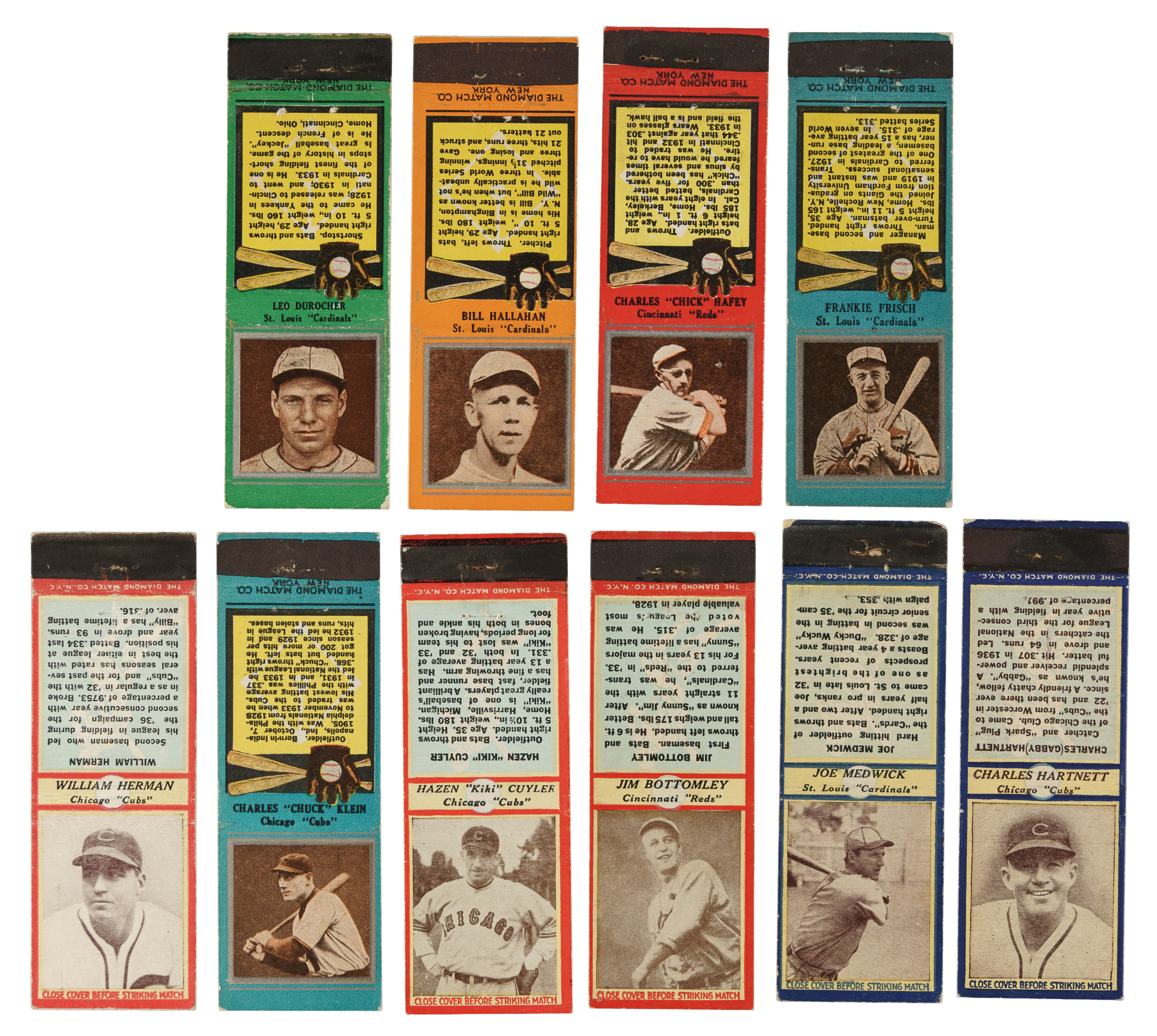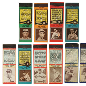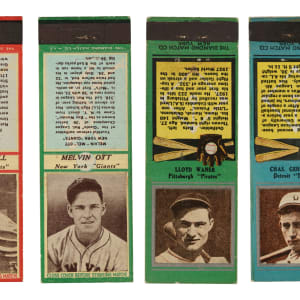 Presented is a collection of fourteen 1934 to 1937 Diamond Matchbooks highlighted by Mel Ott, Lloyd Waner, and Carl Hubbell. This collection consists of the following: 1) 1934 U1 (7 cards): Durocher (pencil on reverse, otherwise Gd+), Frisch (pencil on reverse, otherwise Vg-Ex), Gehringer (Vg), Hafey (Vg-Ex), Hallahan (pencil and rubber stamp on reverse, otherwise Vg), Klein (Vg), and Waner (pencil on reverse, otherwise Vg-Ex). 2) 1935-1936 U3-1 (3 cards): Bottomley (pencil/pen on reverse, otherwise Vg-Ex), Cuyler (Gd), and Medwick (ink on reverse, otherwise Gd+). 3) 1936 U4 (2 cards): Hubbell (Vg-Ex) and Ott (Gd). 4) 1937 U3-2 (2 cards): Hartnett (rubber stamp on reverse, otherwise Vg) and Herman (Vg). Total: 14 cards.