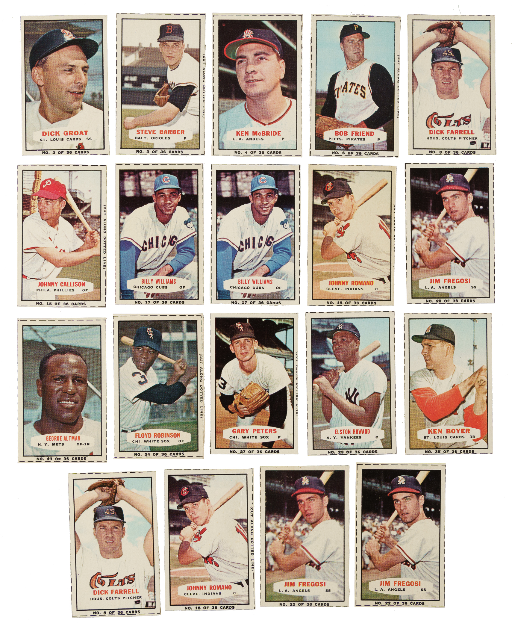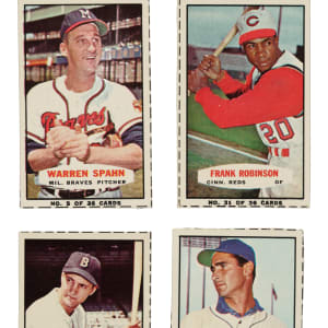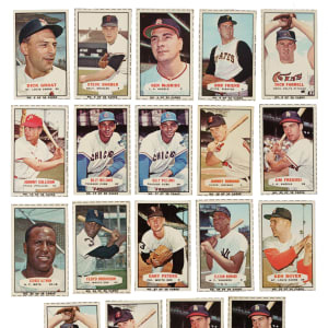 Presented is a near-complete set of 1964 Bazooka consisting of eighteen different cards, out of thirty-six in the set, plus five duplicates. Missing the following eighteen cards for completion: #1 Mantle, 7, 9 Aaron, 10, 11, 12 Mays, 13, 14 Clemente, 19, 20, 21 McCovey, 25, 26, 28, 30 B. Robinson, 33, 34 Kaline, and 36. The following grades are without respect to the neatness of the cut on the box cards as professional grading companies require that all of the borders be present in order for a card to receive a numerical grade, and many of these cards would qualify only for "Authentic" because they are cut inside of, or too close to, the borders. Condition ranges from Gd to Nr/Mt (averaging Vg-Ex/Ex), including a couple lesser. Keys: #5 Spahn (Nr/Mt), 16 Yastrzemski (Vg), two 17 Williams (Nr/Mt and Ex), 31 F. Robinson (Vg+), and 32 Koufax (Gd+). Duplicates (5): #8, 17 B. Williams, 18, and two 22. This is a very attractive partial set of these unusual, scarce, and underrated Bazooka Bubble Gum package-design cards. Total: 23 cards.