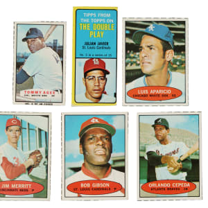 Presented is a collection of six 1967 to 1971 Bazooka baseball cards highlighted by Aparicio, Gibson, and Cepeda. The following grades are without respect to the neatness of the cut on the box cards as professional grading companies require that all of the borders be present in order for a card to receive a numerical grade, and many of these cards would qualify only for "Authentic" because they are cut inside of, or too close to, the borders. This collection consists of the following: 1) 1967 Bazooka (1 card): #2 (pencil on reverse, otherwise Ex). 2) 1968 Bazooka Tipps (1 card): #5 (100/0 L/R, otherwise Vg-Ex, just left side/player photo portion of box, no cartoon). 3) 1971 Bazooka (4 cards): Aparicio (Ex-Mt), Cepeda (Ex-Mt), Gibson (Vg), and Merritt (Pr). Total: 6 cards.