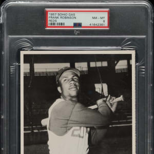 Graded NM-MT 8 by PSA. This is the only example graded at this level by PSA with just one higher. Rarely offered high-grade example of Hall of Famer Frank Robinson from the 1957 Sohio Gas Cincinnati Redlegs picture premiums set. Issued as promotional vehicle for Standard Oil of Ohio service stations, each premium measures approximately 5 x 7 inches and features popular Reds team members in action poses. Frank Robinson is the key to the set as it is an early item from his spectacular career. This is a scarce regional issue that is sure to be of great interest to Cincinnati Reds and Frank Robinson collectors.