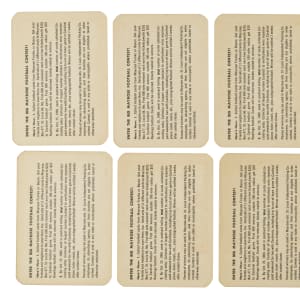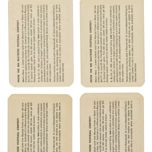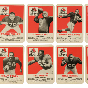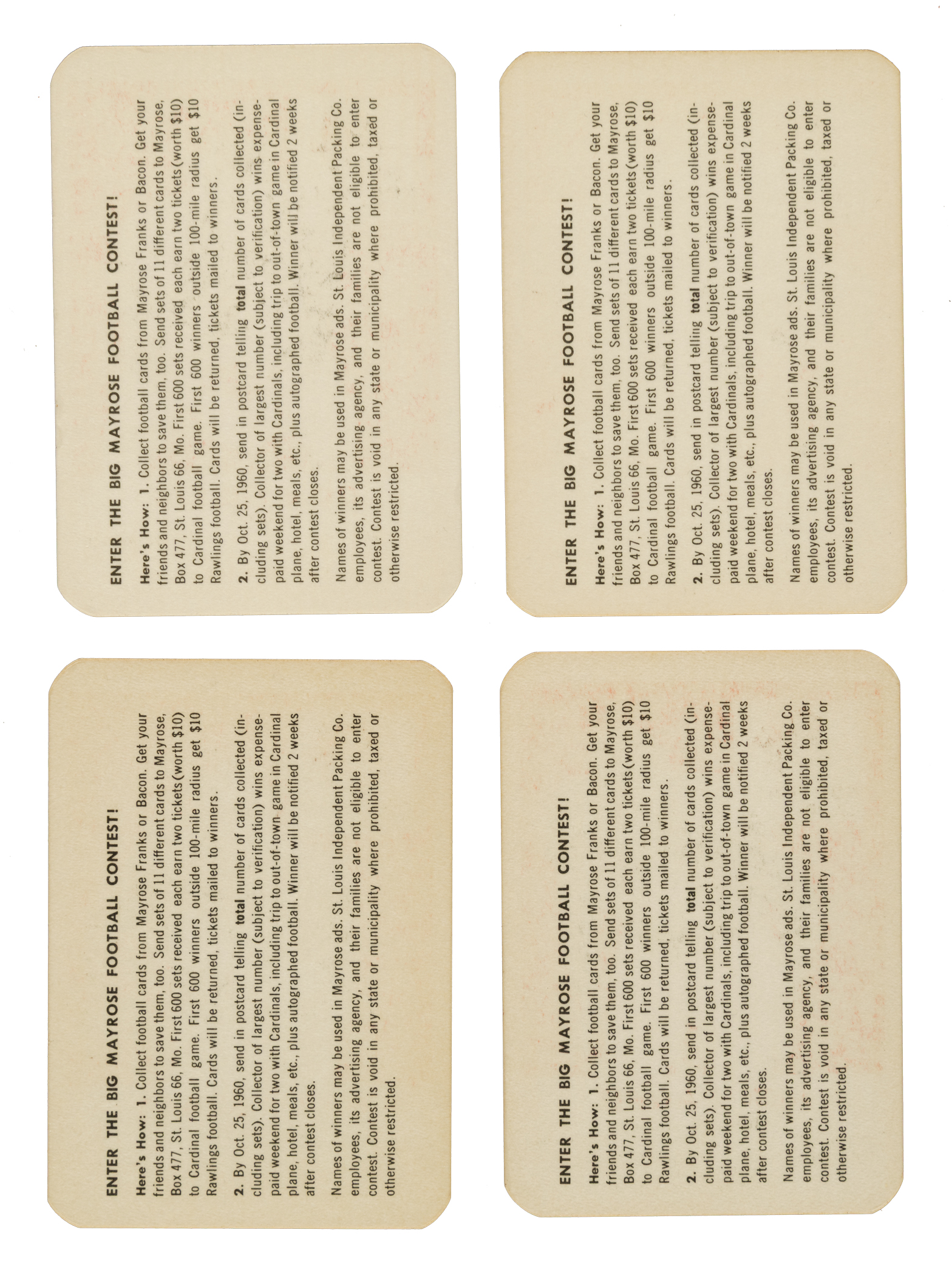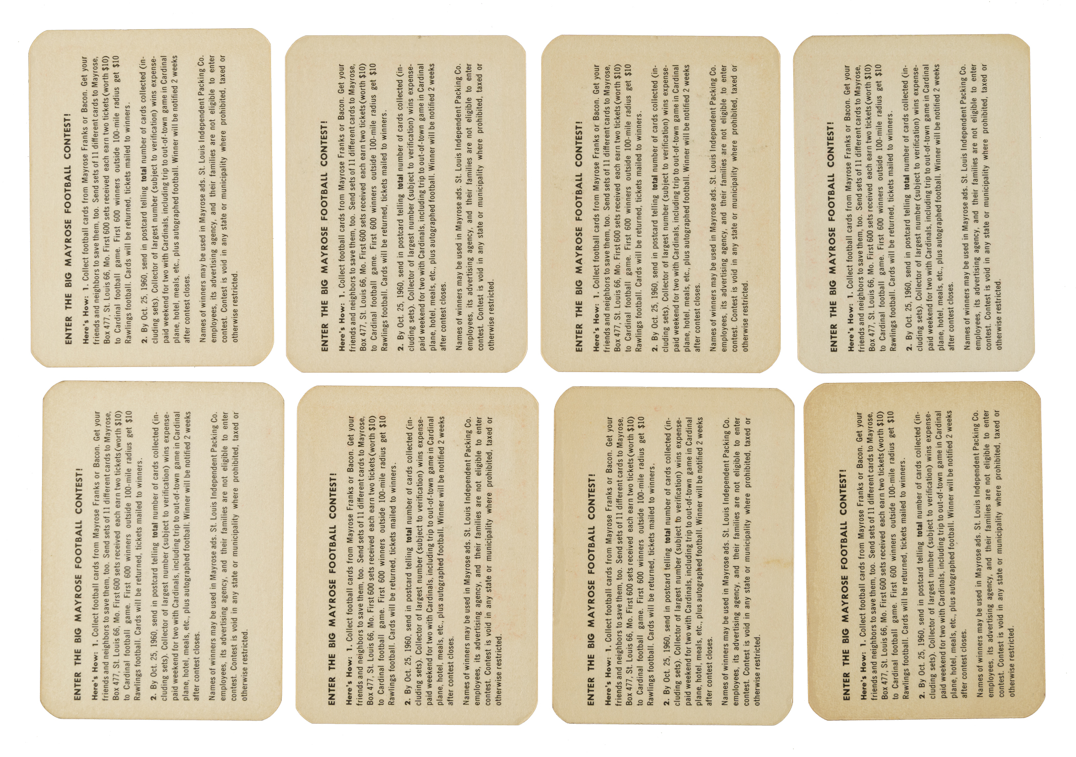 Presented is a complete set of 1960 Mayrose Cardinals football cards plus one duplicate #7. One card was issued with each package of Mayrose meats. Because of the product with which they were packaged, heavy grease stains and creases are common with this issue, making it all the more difficult to assemble a high-grade set. All the cards are bright, crisp and incredibly fresh across the board. Condition ranges from Ex-Mt to Mint (averaging Nr/Mt/Nr/Mt-Mt). An outstanding opportunity to acquire an extremely attractive complete set of this scarce 1960s regional issue. Total: 12 cards.