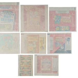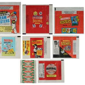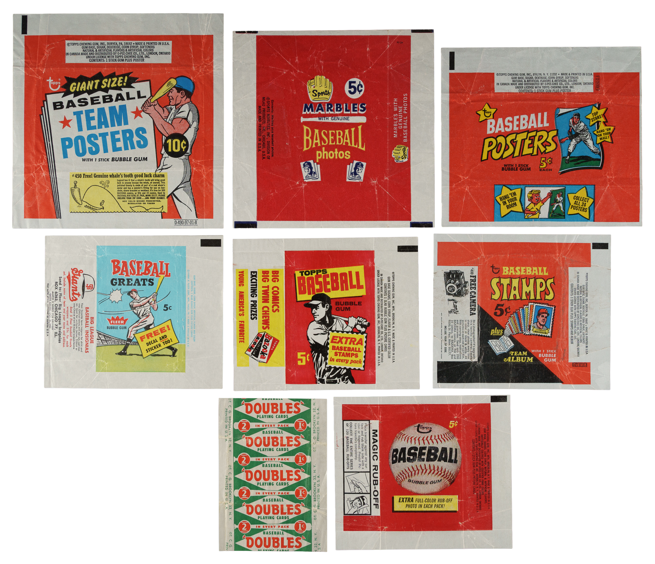 Collection of eight 1951 to 1969 Topps, Leaf, and Fleer Wrappers. This collection consists of the following: 1) 1951 Topps (1 wrapper): Condition is Vg. 2) 1960 Leaf (1 wrapper): Condition is Fr due to tear. 3) 1961 Fleer (1 wrapper): Condition is Gd due to small tear. 4) 1961 Topps (1 wrapper): Condition is Gd+ due to small tear. 5) 1966 Topps (1 wrapper): Condition is Gd+ due to small tear. 6) 1968 Topps Posters (1 wrapper): Condition is Vg. 7) 1969 Topps Stamps (1 wrapper): Condition is Gd due to small tear. 8) 1969 Topps Team Posters (1 wrapper): Condition is Vg-Ex. Total: 8 wrappers.