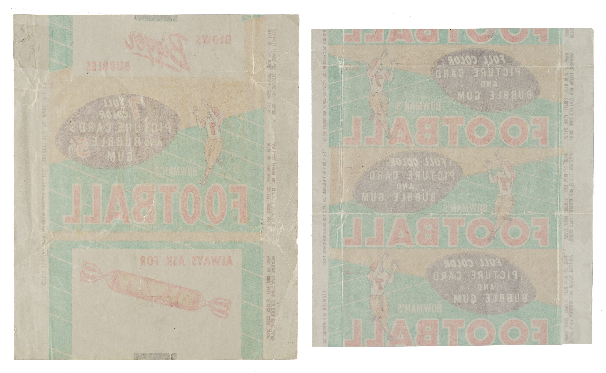 Pair of original 1954 Bowman Football Wrappers. Condition is Vg-Ex and repaired with tape, otherwise Fr.