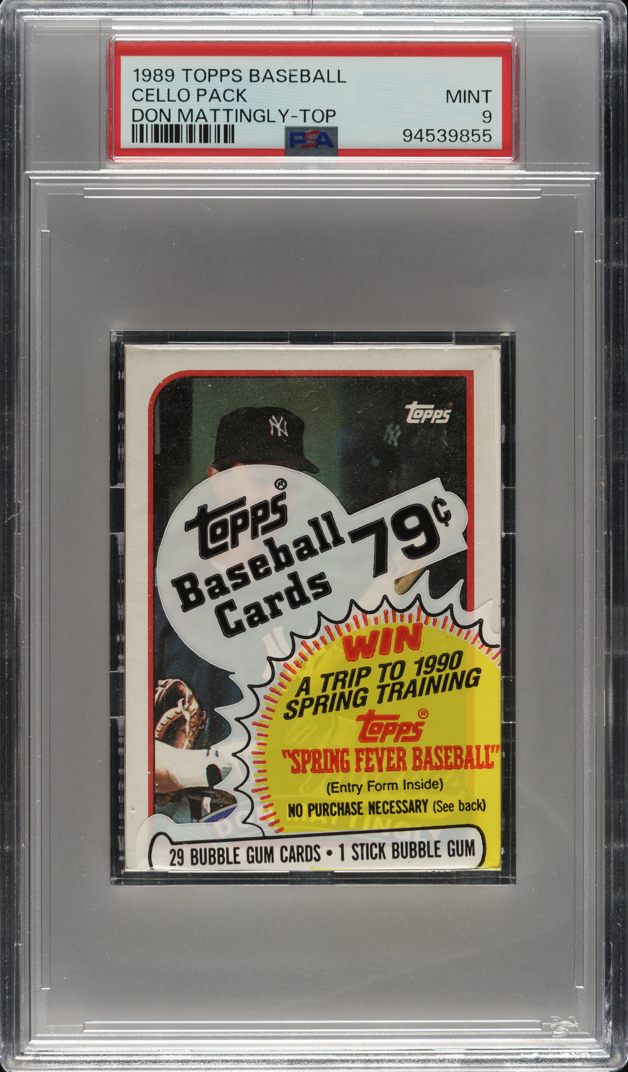 Lot # 3770: 1989 Topps Unopened Cello Pack PSA MINT 9 - Don Mattingly on Top