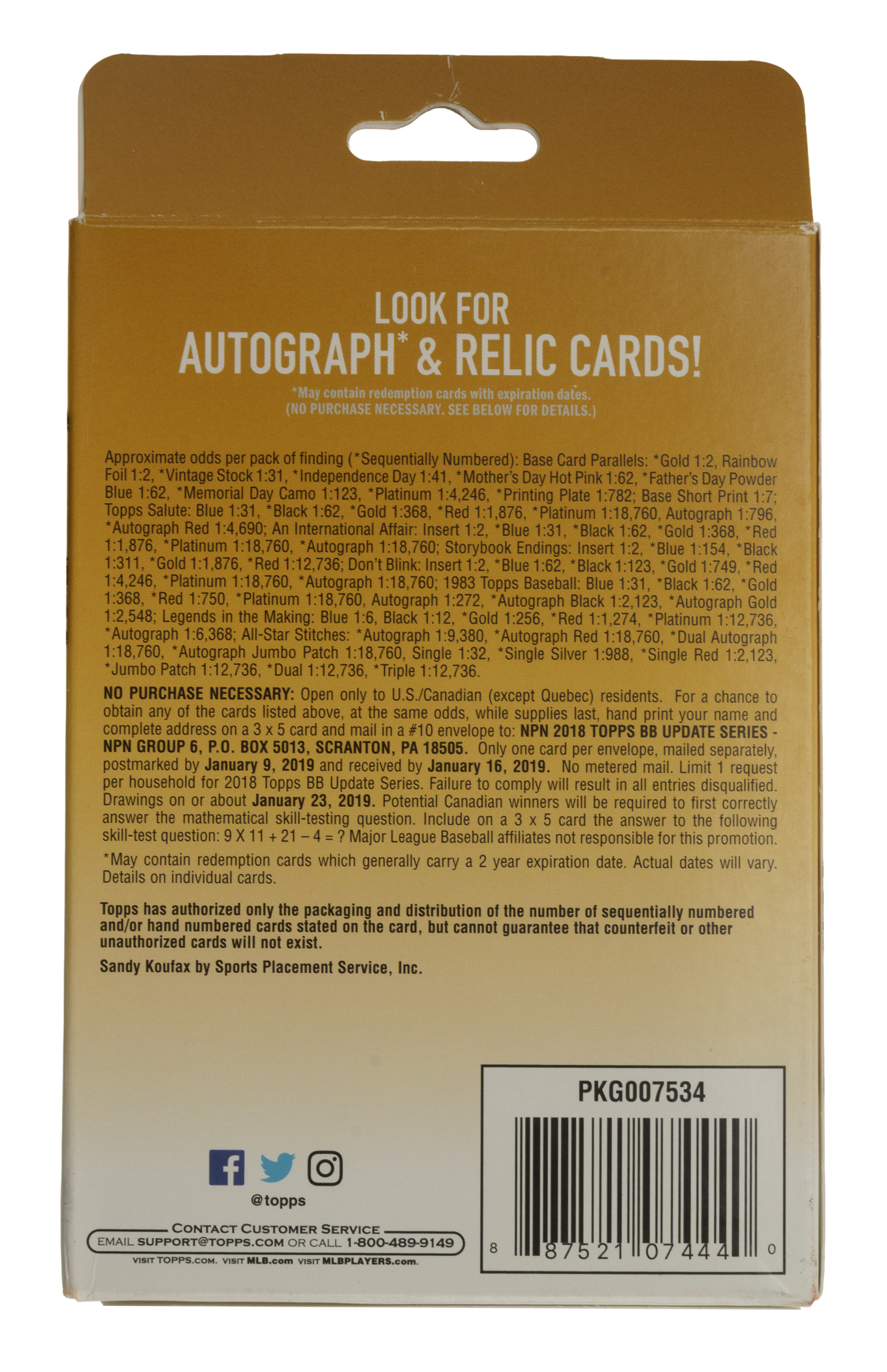Lot # 3780: 2018 Topps Update Factory Sealed Unopened Hanger Box (72 Cards) - Shohei Ohtani, Juan Soto, and Ronald Acuna Jr. Rookie Year