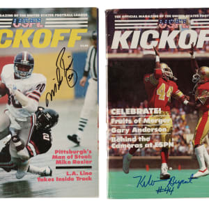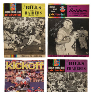 Presented is a collection of seven 1965 to 1984 signed American Football League and United States Football League programs, highlighted by Lance Alworth and Billy Shaw. Condition ranges Good to Excellent. This collection consists of the following: LanceAlworth (HOF'78, "Bambi"), Kelvin Bryant, Tom Flores, Chuck Fusina, Mike Rozier, and two Billy Shaw (both "HOF 99"). Total: 7 programs. Auction LOA from James Spence/JSA. The size/weight of this item requires that there will be an additional shipping charge for this lot.