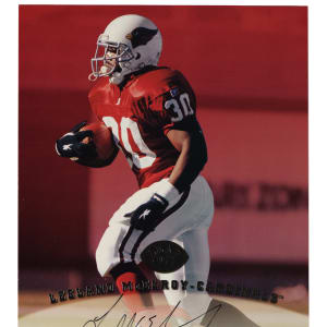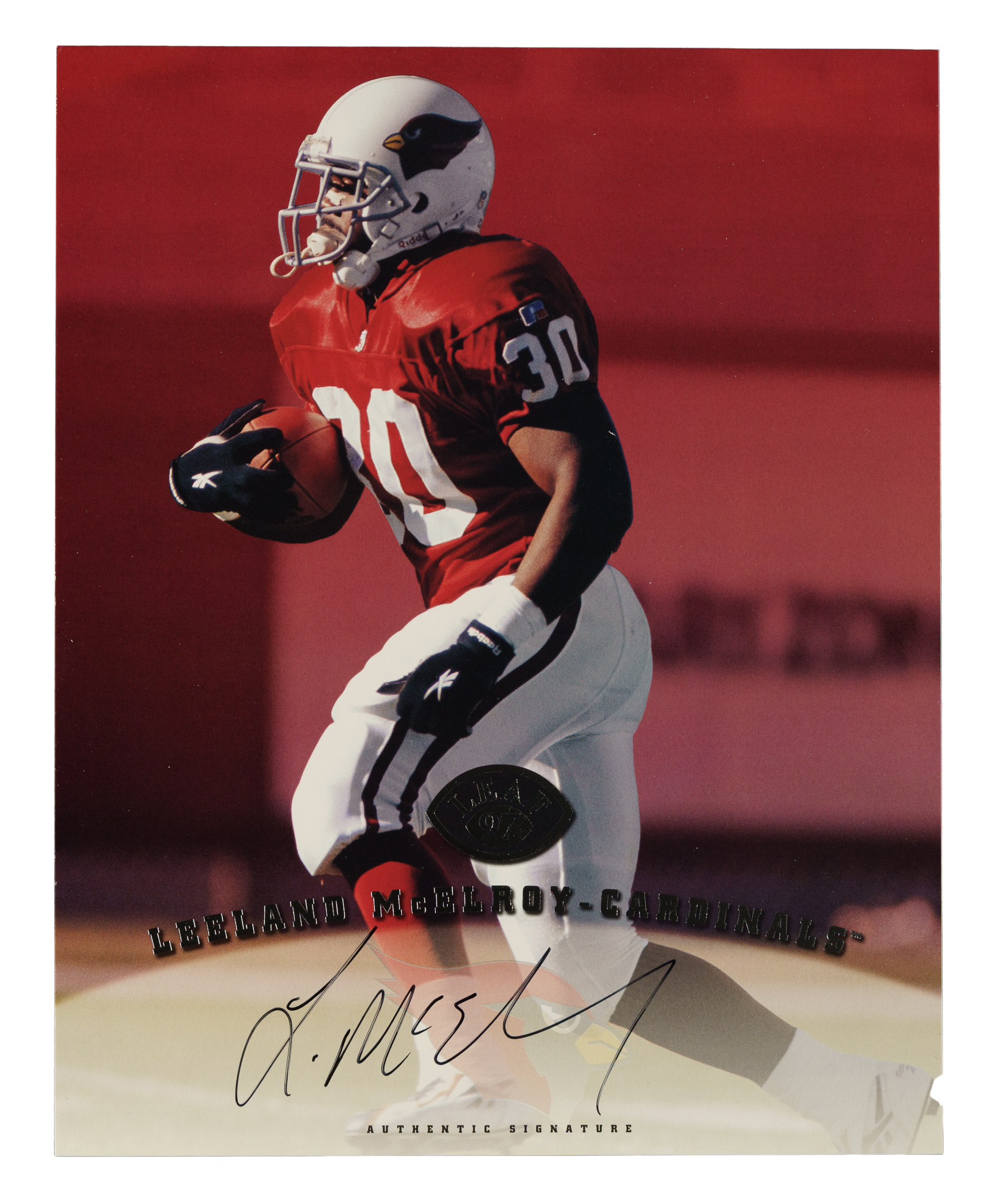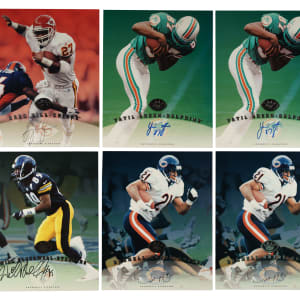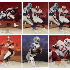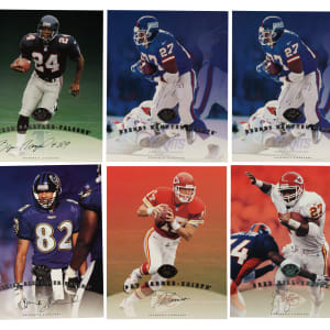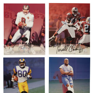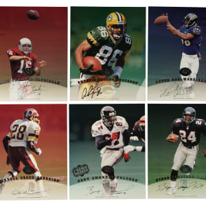 Presented is a collection of fifty 1997 Leaf Signature football cards with twenty-nine signed, highlighted by Steve Young, Terrell Owens, and Tiki Barber rookie! Condition ranges from Vg-Ex to Nr/Mt (averaging Ex/Ex-Mt). This collection consists of the following: 1) Signed (29 cards): D. Alexander, two Autry, Barber RC (Ex-Mt), Barnes, Blackwell, Boulware, Bruce (Ex), Centers, Emanuel, A. Freeman, Grbac, D. Green, two Y. Green, two Hampton, two Hanspard, Harrison (Vg-Ex+), two Hearst, two Hill, McElroy, Owens (Ex-Mt), Plummer RC, Stokes, and Young (Vg-Ex). 2) Unsigned (21 cards): Abdul-Jabbar, T. Allen, Alstott, Barber RC, T. Brown, Conway, T. Davis, Dillon, Elway, Esiason, Frerotte, Hostetler, Kelly, Kennison, Marino, Moore, Plummer RC, C. Sanders, Shannon Sharpe, M. Westbrook, and Young. Total: 50 cards. Auction LOA from James Spence/JSA. The size/weight of this item requires that there will be an additional shipping charge for this lot.