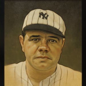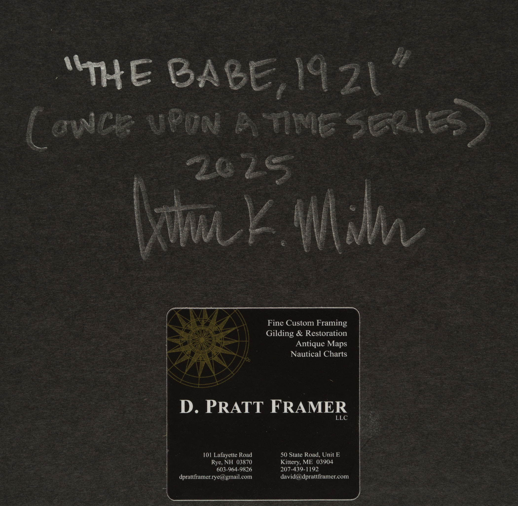 Original mixed media on canvas (mounted to board) painting of Babe Ruth by world-renowned sports artist Arthur K. Miller. Signed by the artist in the lower-right corner. In addition to his signature on the front, Miller has also signed, dated, "2025," and titled the piece, "The Babe, 1921 (Once Upon A Time Series)" on the reverse. Arthur K. Miller is an award-winning portrait artist specializing in historical sports figures and Pop Culture icons. His work has been exhibited and collected internationally for over 30 years, including an unprecedented five-year solo exhibition at the National Baseball Hall of Fame & Museum. His exacting portraits are featured in many permanent collections, including those of the Baseball Hall of Fame, the New York Historical Society, and the Louisville Slugger Museum. Miller’s sports portraits also regularly appear on the cover of the Sports Market Report (SMR). Mint condition. 15 x 22 inches. Framed to total dimensions of 17 x 23.5 inches. The size/weight of this item requires that there will be an additional shipping charge for this lot.