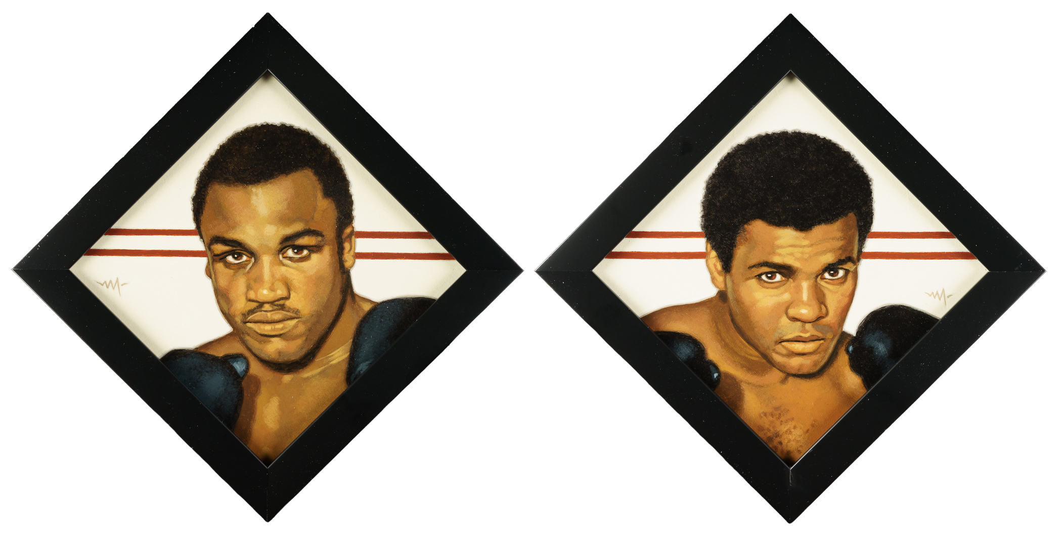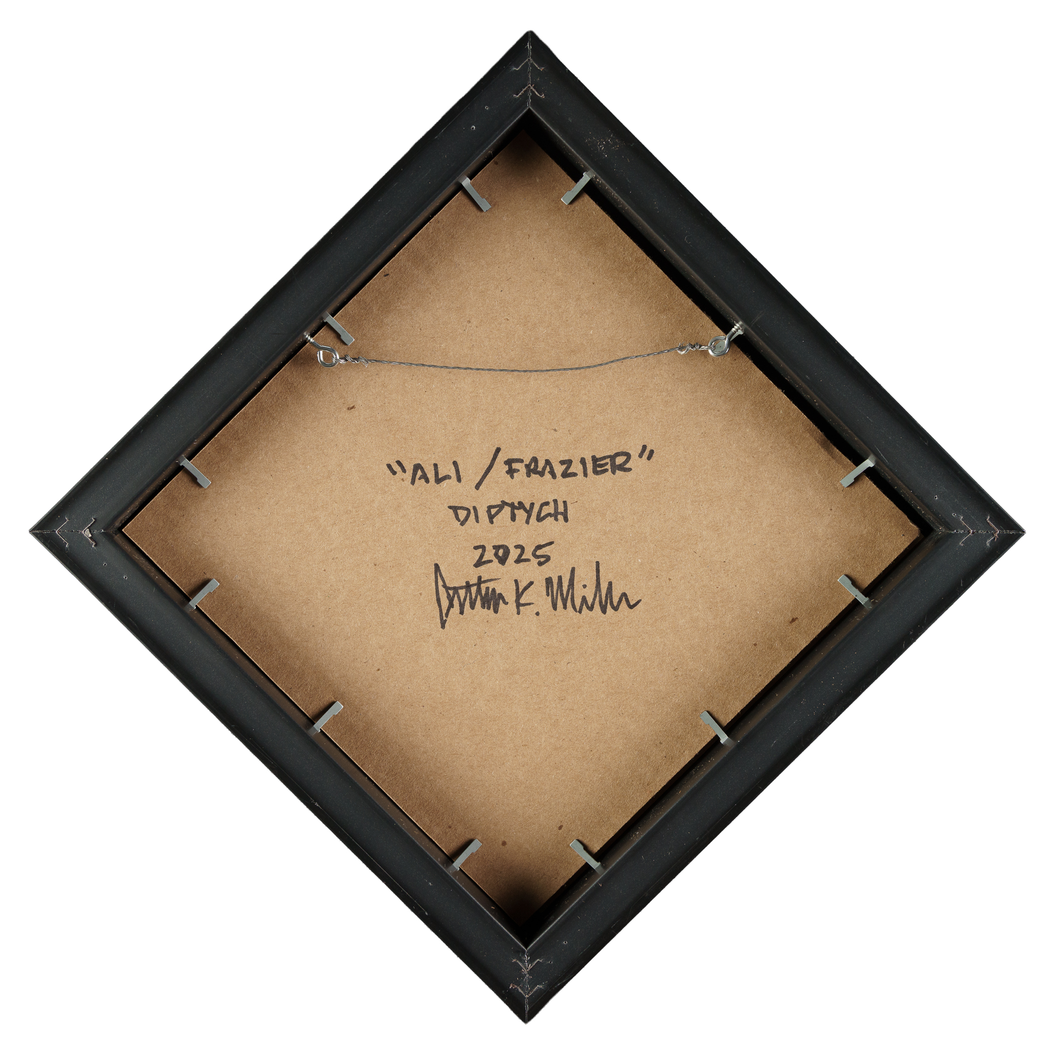 Pair of original mixed media on canvas (mounted to board) paintings of Joe Frazier and Muhammad Ali by renowned sports artist Arthur K. Miller. Signed by the artist along the upper-left corner. Signed again and dated ("2025") by Miller on the reverse. Both facial studies picture their subject in a boxing pose. Arthur K. Miller is an award-winning portrait artist specializing in historical sports figures and pop culture icons. His work has been exhibited and collected internationally for over 30 years, including an unprecedented five-year solo exhibition at the National Baseball Hall of Fame & Museum. His exacting portraits are featured in many permanent collections, including those of the Baseball Hall of Fame, the New York Historical Society, and the Louisville Slugger Museum. Miller’s sports portraits also regularly appeared on the cover of the Sports Market Report (SMR). Mint condition. Each painting measures 7.5 x 7.5 inches and is framed to total dimensions of 9.5 x 9.5 inches. The size/weight of this item requires that there will be an additional shipping charge for this lot.