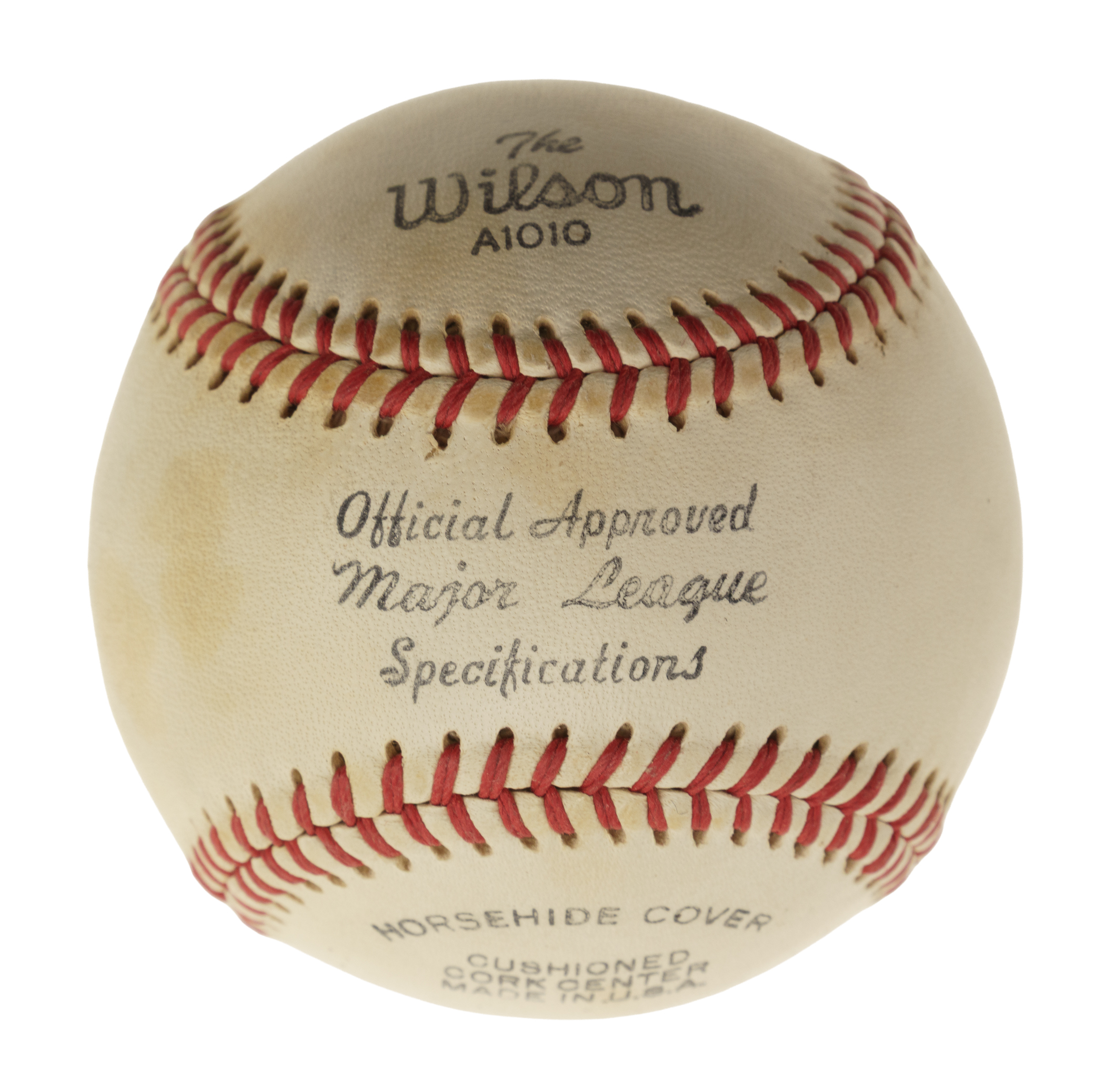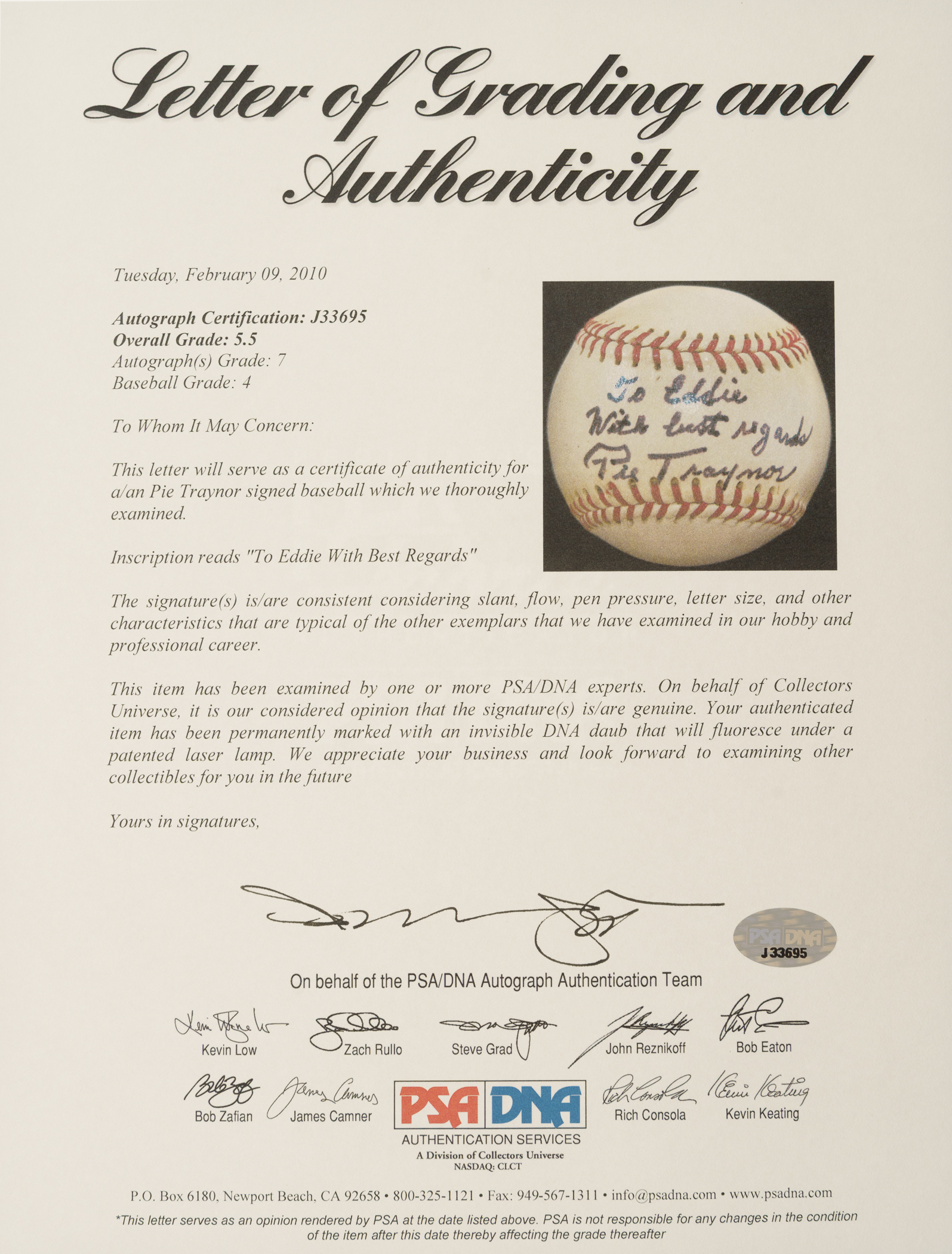 Wilson baseball inscribed by Hall of Fame third baseman Pie Traynor in black ink across the sweet spot. His inscription reads "To Eddie/With Best Regards/Pie Traynor." Pie Traynor was widely considered the finest fielding third baseman of his era. He was so adept in the field that most fans today are unaware that he finished his career with a .320 lifetime average and twice batted over .350 in a season. Traynor, who was elected to the Hall of Fame in 1948, died in 1972, years before collecting single-signed baseballs of Hall of Famers became extremely popular with collectors. As a result, Traynor single-signed balls are scarce. This is just the fourth we have ever offered, and we cannot recall having seen many others, especially high-grade examples such as this. The ball exhibits a few patches of moderate toning. Full LOA from PSA/DNA, which has graded the signature "7" and the baseball "4" for an overall grade of "5.5."