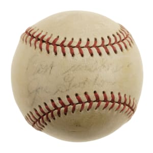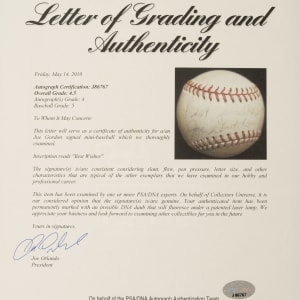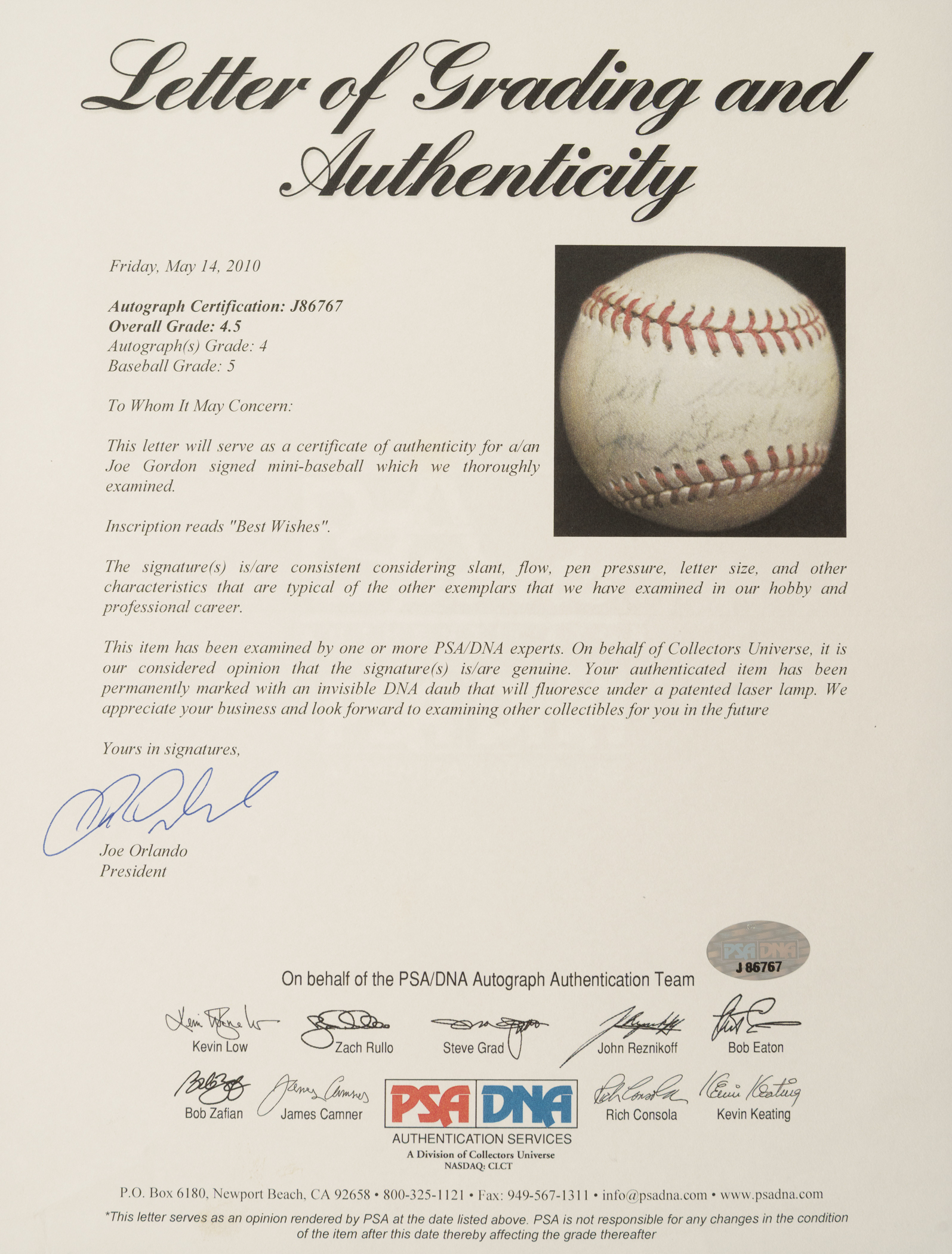 Miniature baseball insribed in black ink on the sweet spot by Hall of Fame second baseman Joe Gordon. His inscription reads “Best Wishes/Joe Gordon.” Joe Gordon single-signed balls are rare. He passed away in 1978 at the age of 63, and he wasn’t elected to the Hall of Fame until 2009. As is the case whenever a player is elected to the Hall posthumously, especially decades after his death, the supply of available signature examples (especially on single-signed balls, a very popular area of collecting) can never meet the overwhelming demand. Gordon’s election by the Veterans Committee in 2009 took most fans by surprise, and it is unlikely that many collectors had the foresight decades ago to obtain Gordon's signature alone on a baseball. Full LOA from PSA/DNA, which has graded the signature "4" and the baseball "5" for an overall grade of "4.5."