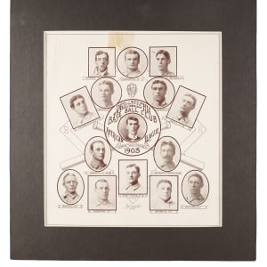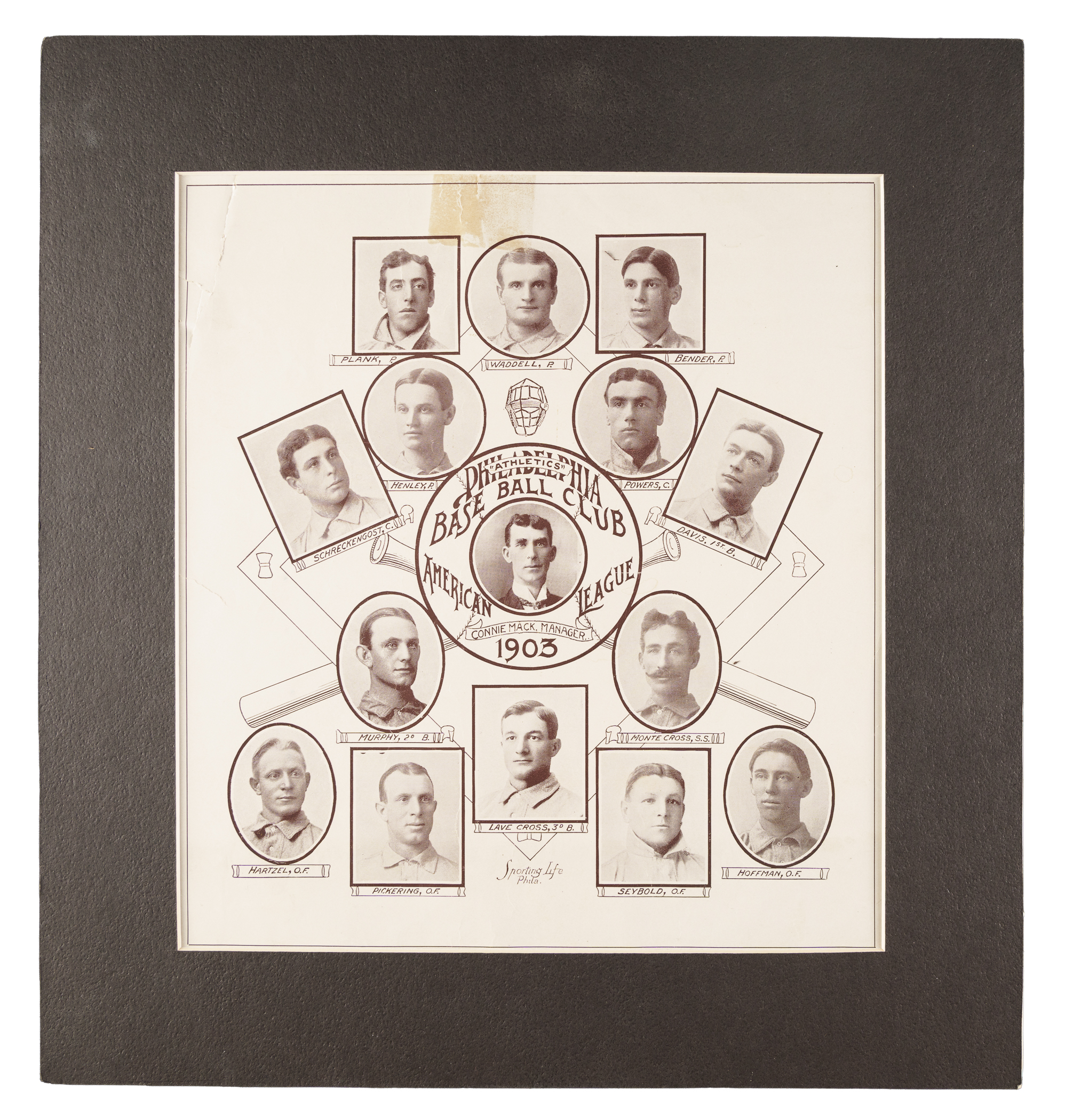 1903 Philadelphia Athletics W601 Sporting Life team composite featuring portrait images of 15 team members, including manager Connie Mack, Eddie Plank, Rube Waddell, and Chief Bender. These team composites, printed on heavy enamel paper and issued by the Sporting Life newspaper, were available to fans either by individual purchase (for ten cents) or as a complete set in a bound volume. The composite (13 x 14 inches) features a tape stain along the top, along with several edge tears and pieces missing. Poor condition overall. The piece is affixed to a thick backing and is matted to total dimensions of 14 x 15 inches. The size/weight of this item requires that there will be an additional shipping charge for this lot.