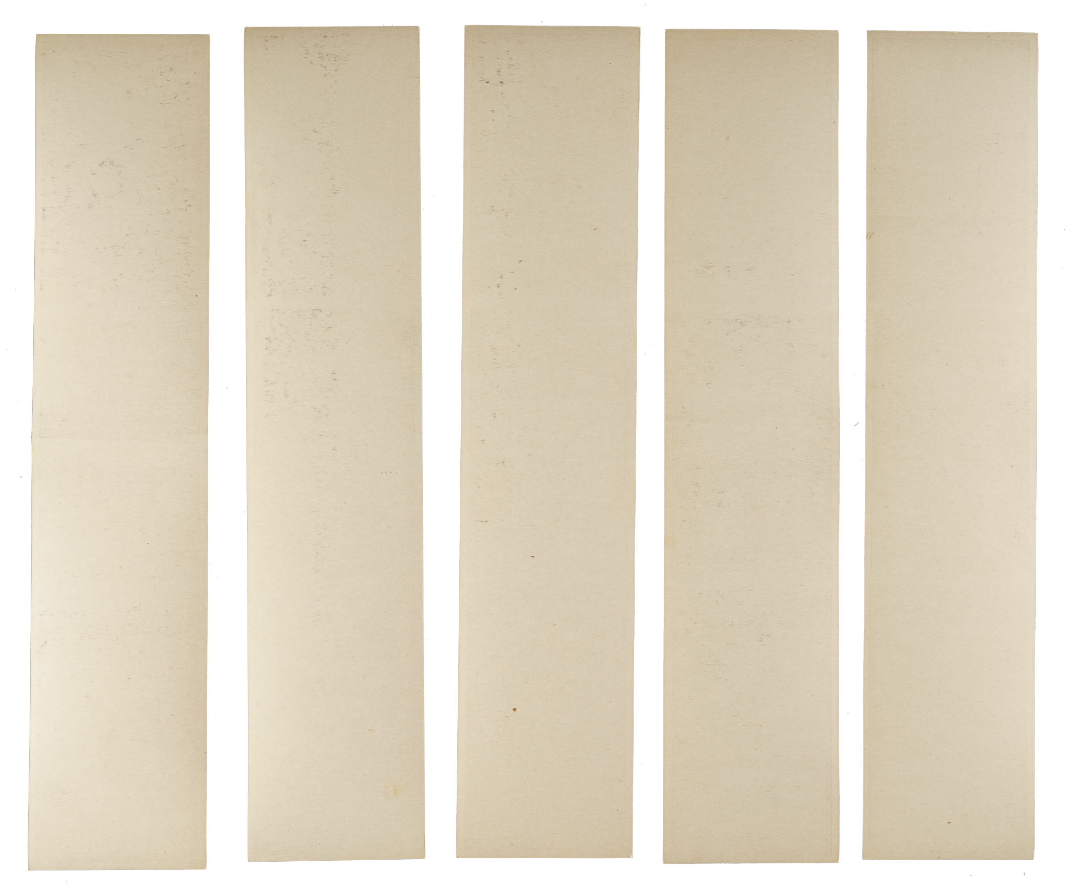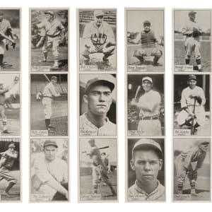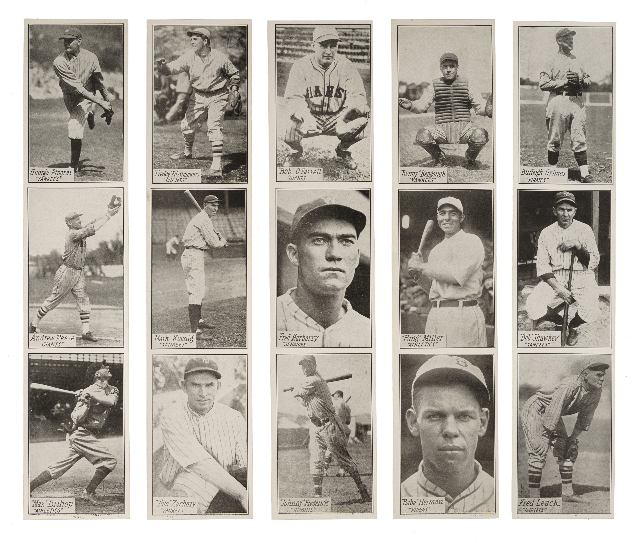 Presented is very attractive collection of five uncut three-card strips from the R315 "Portraits and Action" series. The R315 set has been referred to as the "Portraits and Action" series ever since Jefferson Burdick named it in the 1930s in his first American Card Catalog. It is unknown exactly how they were issued or whether this is a formal name provided by the issuer. The 15 players depicted on the five 3-1/4 x 15-3/4 inches strips are highlighted by Hall of Famer Burleigh Grimes. This collection consists of the following: Bengough/Miller/Herman (Gd due to horizontal crease), Fitzsimmons/Koenig/Zachary (Vg+), Grimes (HOF)/Shawkey/Leach (Ex+), O'Farrell/Marberry/Fredericks (O'Farrell card centered 80/20 L/R, otherwise Nr/Mt), and Pipgras/Reese/Bishop (Gd cue to horizontal crease). A very attractive grouping of 1928 R315s in ideal uncut-strip form. Total: 5 uncut panels.