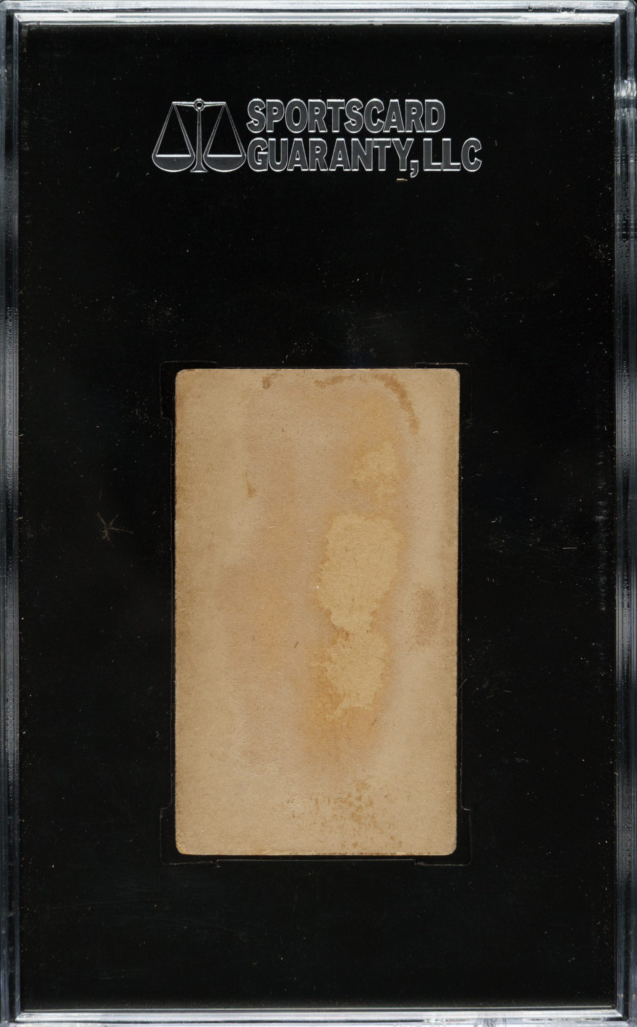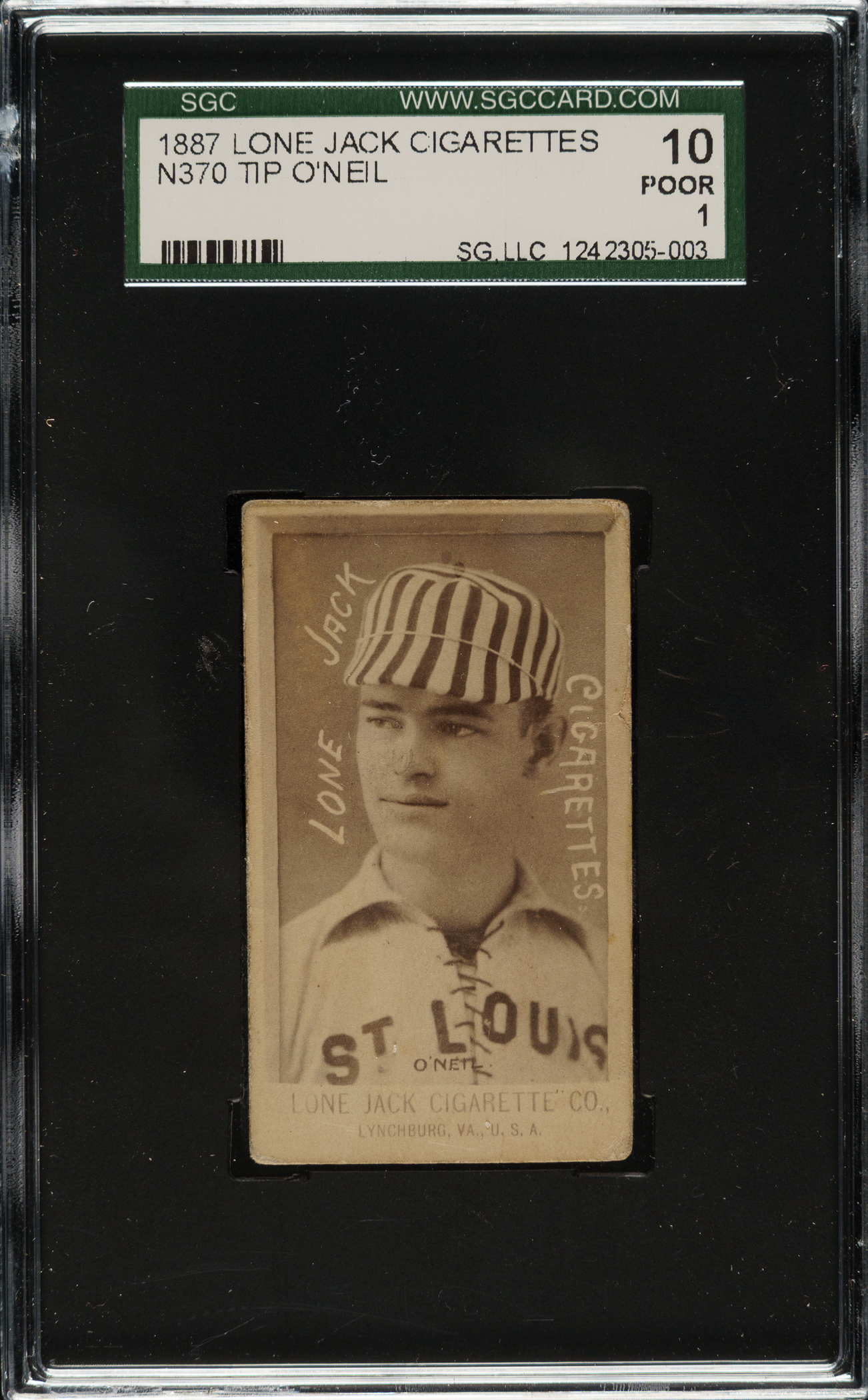 Graded POOR 10 by SGC. Exceedingly rare card of Tip O'Neill from the Lone Jack Cigarettes series. The Lone Jack set, issued by the Lone Jack Cigarette Company of Lynchburg, Virginia, features portraits of the 1886 Brownie Champs. The 13-card set actually uses the very same portraits that appear in the N172 Old Judge Brown's Champions series but with larger images cropped more closely and with advertising for Lone Jack Cigarettes surrounding the players' portraits in the background. Their unusual design and great rarity distinguish them as one of the most interesting of all 19th century baseball issues. Lone Jacks bear some similarity to Old Judges but have no direct connection to Goodwin and might have been regionally issued only in Virginia. This is a very attractive example with superb photo quality. This card is crisp and clean with just evidence of album removal on the blank reverse. Lone Jacks are so rare that the prospect of assembling a set is a virtually impossible task and even finding one example is extremely difficult. This is an attractive card from this very rare pre-1900 tobacco set.