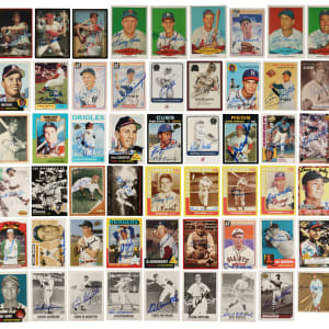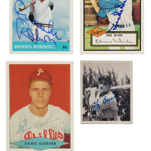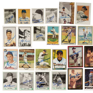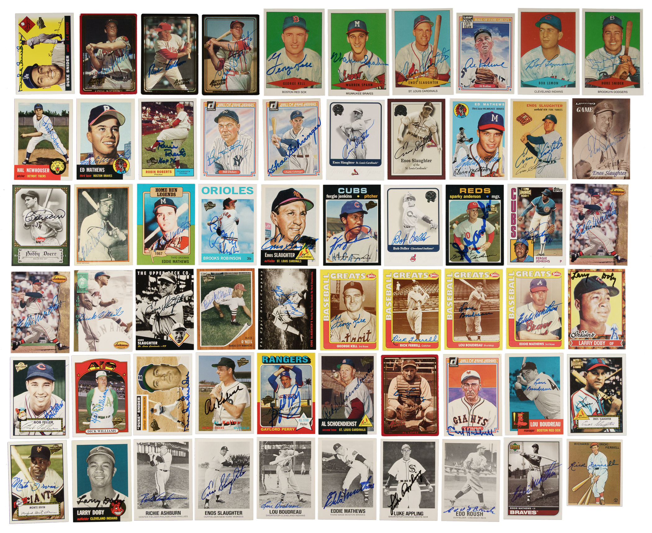 Tremendous collection of 472 modern-era baseball cards, each signed on the front by the respective player. Eighty-nine Hall of Fame players are represented in the collection, which consists of both reprint sets, as well as commemorative sets that simply feature old time stars and Hall of Famers. Some of the iconic sets from the 40s and 50s are mirrored in this collection (1940s Play Balls, '48 Bowman, '52 and '53 Topps etc.). The signatures are scripted in a variety of inks and a few cards are personalized. Condition ranges from Vg-Ex to Mint (averaging Ex-Mt), with approximately 7% lesser. Hall of Famers (89): Anderson, Appling, four Ashburn, Berra, four Boudreau, Dickey, two Doby, five Doerr, five Feller, three Ferrell, four Gehringer (one 1961 Golden Press), Hubbell, Irvin, two Jenkins, two Kaline, four Kell, four Lemon, Lopez, 10 Mathews, Newhouser, two O'Neil, Perry, Roberts (HOF 76), two B. Robinson, Roush, Schoendienst, 14 Slaughter, six Snider, three Spahn, Terry (1961 Golden Press), and D. Williams. A partial list of stars include the following: Five Bauer, Campaneris, two Cey, six Crosetti, two D. DiMaggio, 11 Erskine, Fidrych, Friend, two Garagiola, Groat, Haddix, Henrich, Kranepool, five Larsen, four McDougald, Nettles, Newcombe, Pafko, four Podres, five Richardson, three Roe, nine Rosen, five Sain, two Score, four Shantz, five Skowron, 13 Thomson (including 2001 Bowman Heritage w/ polo grounds seat relic), and Woodling. Total: 472 signed cards. Auction LOA from James Spence/JSA.