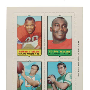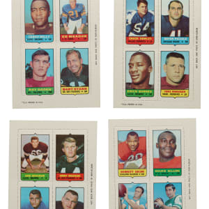 Presented is an outstanding partial set of 1969 Topps Football 4-in-1 consisting of forty-two different cards, out of sixty-six in the set. Featuring four players per panel, each card is perforated to allow for individual players to be broken out into stamp-sized pieces. The backs are blank. Included within the set are dozens of Hall of Famers and stars, including Joe Namath and Dick Butkus. Includes one duplicate #15 Namath. Condition is 5% Nr/Mt, 16% Ex to Ex-Mt, and 79% Vg to Vg-Ex. Card numbers referenced in the following grading composite are from Standard Catalog of Vintage Football Cards. Keys: Two #15 Namath (Vg+ and Vg), 21 Butkus (Vg), 26 Hanburger/Howley/Piccolo (Vg), and 31 Kelly/Starr (Vg-Ex due to light wrinkle on reverse). Missing the following twenty-four cards for completion: #1 LeBeau/Sayers, 2, 3, 9, 10, 16 Tarkenton, 18 Griese, 19, 23, 25, 28, 29, 30, 33, 34, 41 Csonka, 56, 57, 58, 60 Renfro/Unitas, 62, 64, 65, and 66. Total: 43 cards. The size/weight of this item requires that there will be an additional shipping charge for this lot.