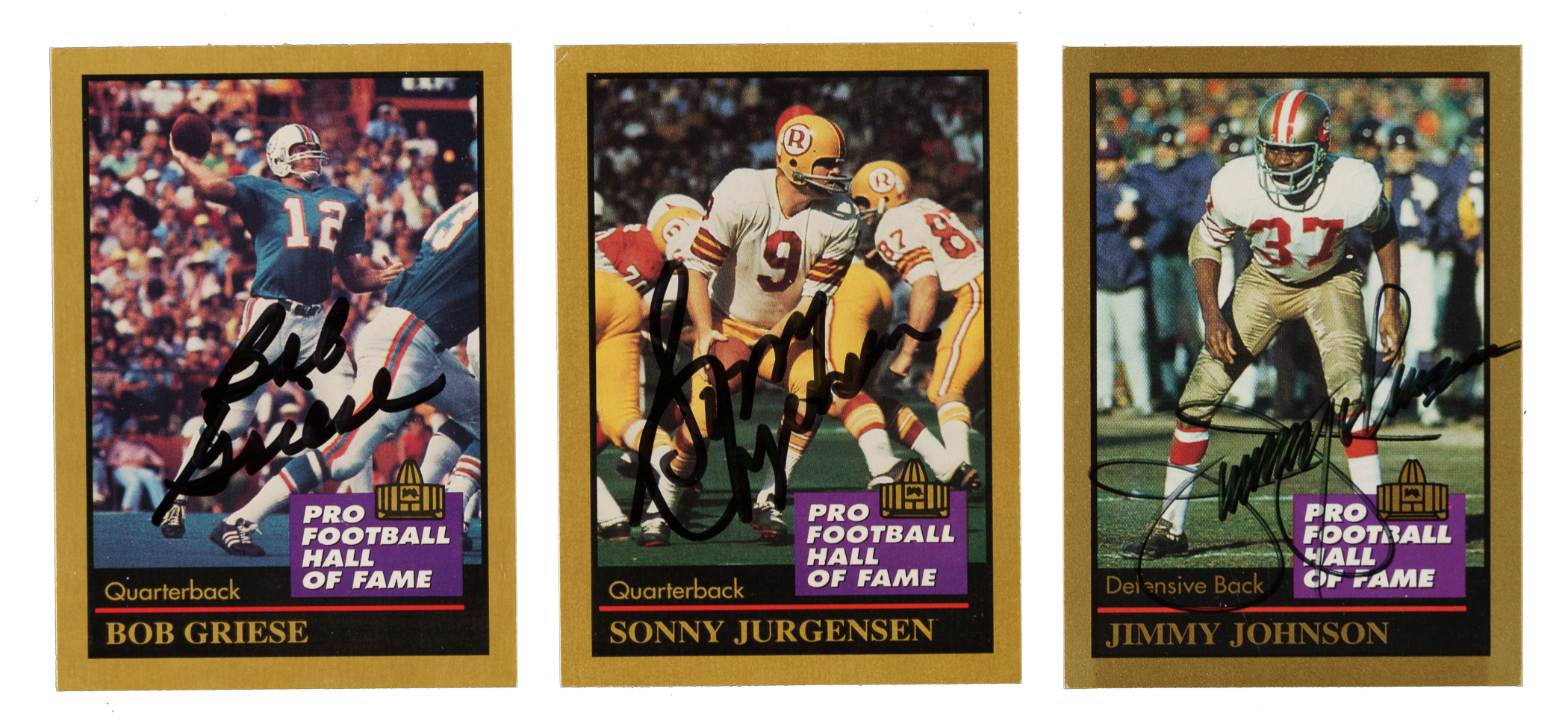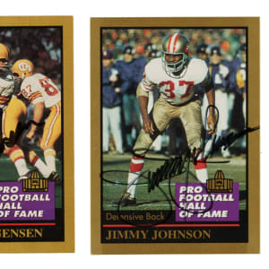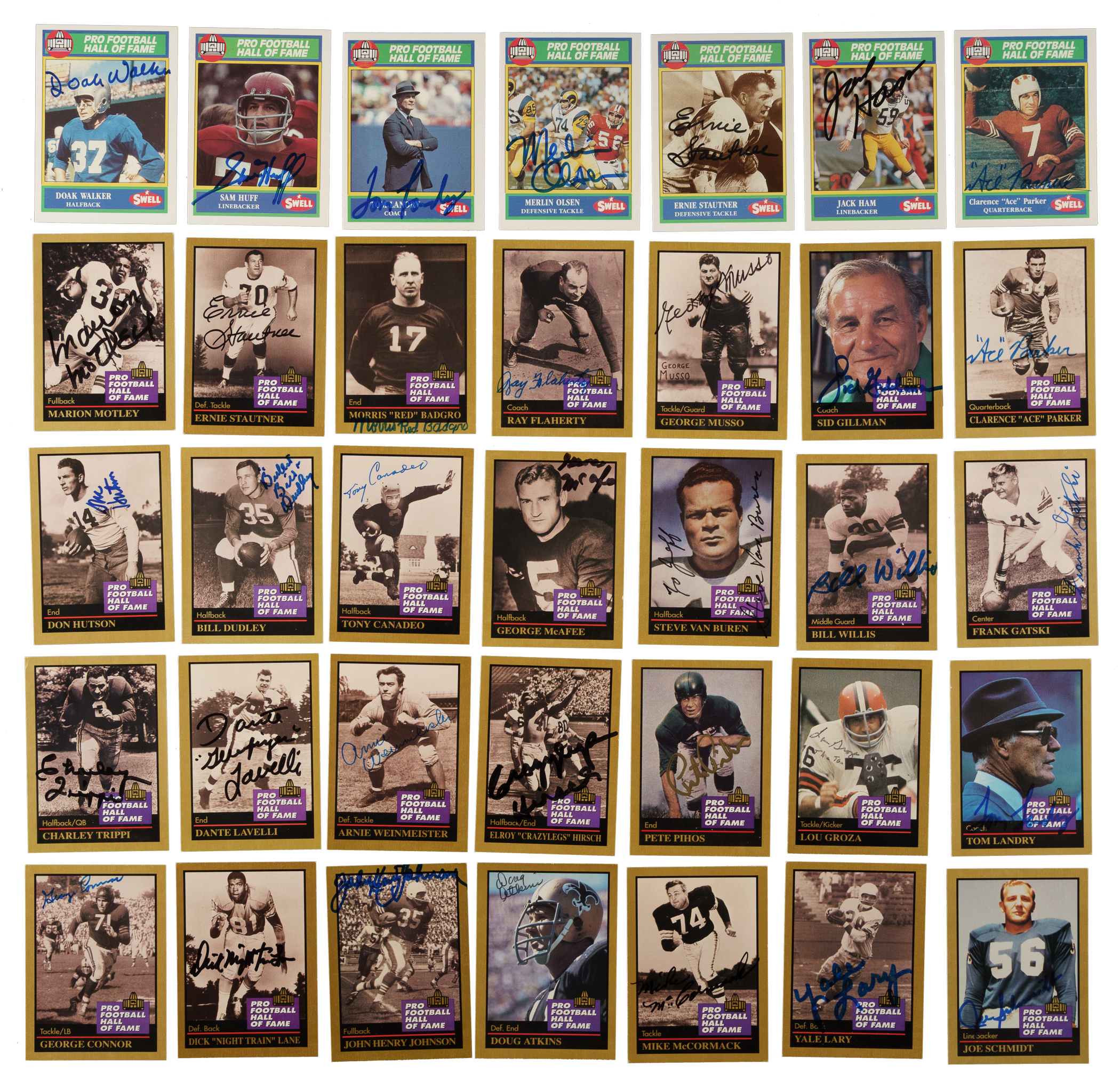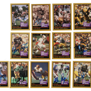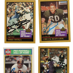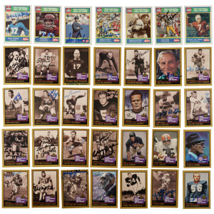 Presented is a collection of fifty-six signed 1990 Swell and 1991 Enor Pro Football Hall of Famers highlighted by Jurgensen, Ditka, and Greene. This collection consists of the following: 1) 1990 Swell (8 cards): Condition ranges from Vg-Ex to Nr/Mt (averaging Ex). Includes: #52 Stautner, 92 Parker, 116 Olsen, 118 Huff, 121 Jurgensen (Vg-Ex), 137 Walker, 143 Ham, and 151 Landry. 2) 1991 Enor Pro (47 cards): Condition ranges from Vg to Nr/Mt (averaging Vg-Ex/Ex), including one lesser. Includes: #4 Atkins, 5 Badgro, 8 Bednarik (Ex), 24 Canadeo, 29 Connor, 34 Ditka (Vg-Ex), 37 Dudley, 41 Flaherty, 44 Gatski, 47 Gillman, 50 Greene (Ex-Mt), 52 Griese (Vg-Ex+), 53 Groza, 66 Hirsch, 67 Houston, 69 Huff, 71 Hutson, 72 Johnson, 73 Jones, 75 Jurgensen (Vg-Ex), 80 Landry, 81 Lane, 82 Langer, 84 Lary, 85 Lavelli, 95 McAfee, 96 McCormack, 100 Mitchell, 103 Motley, 103b Stautner/should be 130, 104 Musso, 110 Olsen, 113 Page, 114 C. Parker, 115 J. Parker, 117 Pihos, 126 Schmidt, 128 Shell, 135 C. Taylor, 136 J. Taylor, 140 Trippi, 144 Upshaw, 146 Van Buren, 150 Weinmeister, 151 Willis, 152 Wilson, and 154 Wood. 3) 1994 Enor Pro (1 card): J. Johnson (Vg+). Total: 56 cards. The size/weight of this item requires that there will be an additional shipping charge for this lot.