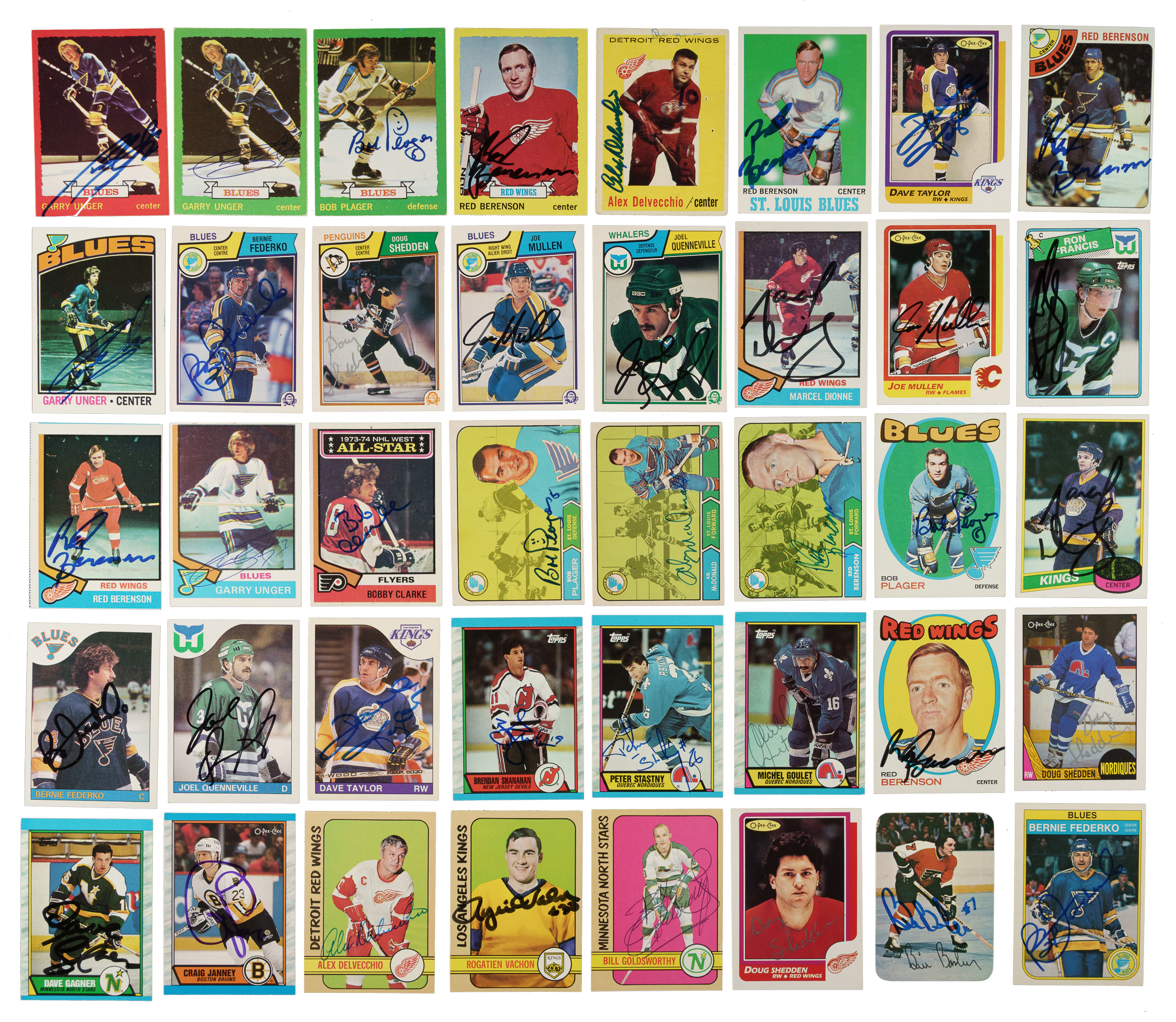 Collection of forty-four signed hockey cards consisting of various issues (mostly Topps and O-Pee-Chee) spanning from the 1950s to 1980s. The signatures are scripted on the front in various inks. Condition is 27% Nr/Mt or better, 29% Ex to Ex-Mt, and 44% Vg to Vg-Ex (including three lesser). This collection consists of the following: 1) 1959-1960 Topps (1 card): #8 Delvecchio (Pr, HOF). 2) 1963-1964 Parkhurst (1 card): #50 Delvecchio (Fr-Gd, HOF). 3) 1968-1969 Topps (1 card): #114 Berenson. 4) 1968-1969 O-Pee-Chee (2 cards): #112 Plager and 180 McDonald. 5) 1970-1971 Topps (1 card): #103 Berenson. 6) 1970-1971 O-Pee-Chee (1 card): #210 Hall (Nr/Mt-Mt, HOF). 7) 1971-1972 Topps (2 cards): #91 Berenson and 103 Plager. 8) 1972-1973 Topps (3 cards): #51 Vachon (Ex-Mt, HOF), 115 Goldsworthy, and 141 Delvecchio (Vg-Ex, HOF). 9) 1973-1974 Topps (4 cards): Two #15 Unger (one is O-Pee-Chee), 134 Plager, and 174 Berenson. 10) 1974-1975 Topps (5 cards): #19 Berenson, 72 Dionne (Gd, HOF), 135 Clarke AS (Pr, HOF), 237 Unger, and 260 Clarke (15/85 L/R, otherwise Vg-Ex, HOF). 11) 1976-1977 Topps (2 cards): #151 Robinson (Nr/Mt-Mt, HOF) and 260 Unger. 12) 1976-1977 Topps Glossy Insets (1 card): #12 Barber (HOF). 13) 1978-1979 Topps (1 card): #218 Berenson. 14) 1980-1981 Topps (1 card): #20 Dionne (Ex-Mt, HOF). 15) 1982-1983 O-Pee-Chee (1 card): #302 Federko (HOF). 16) 1983-1984 O-Pee-Chee (4 cards): #145 Quenneville, 285 Shedden, 315 Federko (HOF), and 317 Mullen (HOF). 17) 1985-1986 Topps (3 cards): #103 Quenneville, 104 Federko (HOF), and 214 Taylor (O-Pee-Chee). 18) 1986-1987 O-Pee-Chee (3 cards): #44 Mullen (HOF), 63 Taylor, and 153 Shedden. 19) 1987-1988 O-Pee-Chee (1 card): #249 Shedden. 20) 1988-1989 Topps (1 card): #52 Francis (Nr/Mt, HOF). 21) 1989-1990 Topps (4 cards): #57 Goulet (HOF), 109 Gagner, 143 Stastny (HOF), and 147 Shanahan (Ex, HOF). 22) 1989-1990 O-Pee-Chee (1 card): #190 Janney. Total: 44 signed cards. Auction LOA from James Spence/JSA.