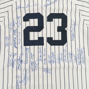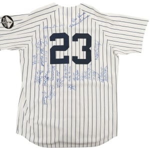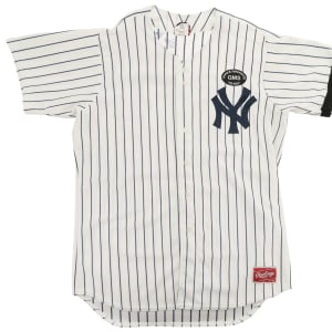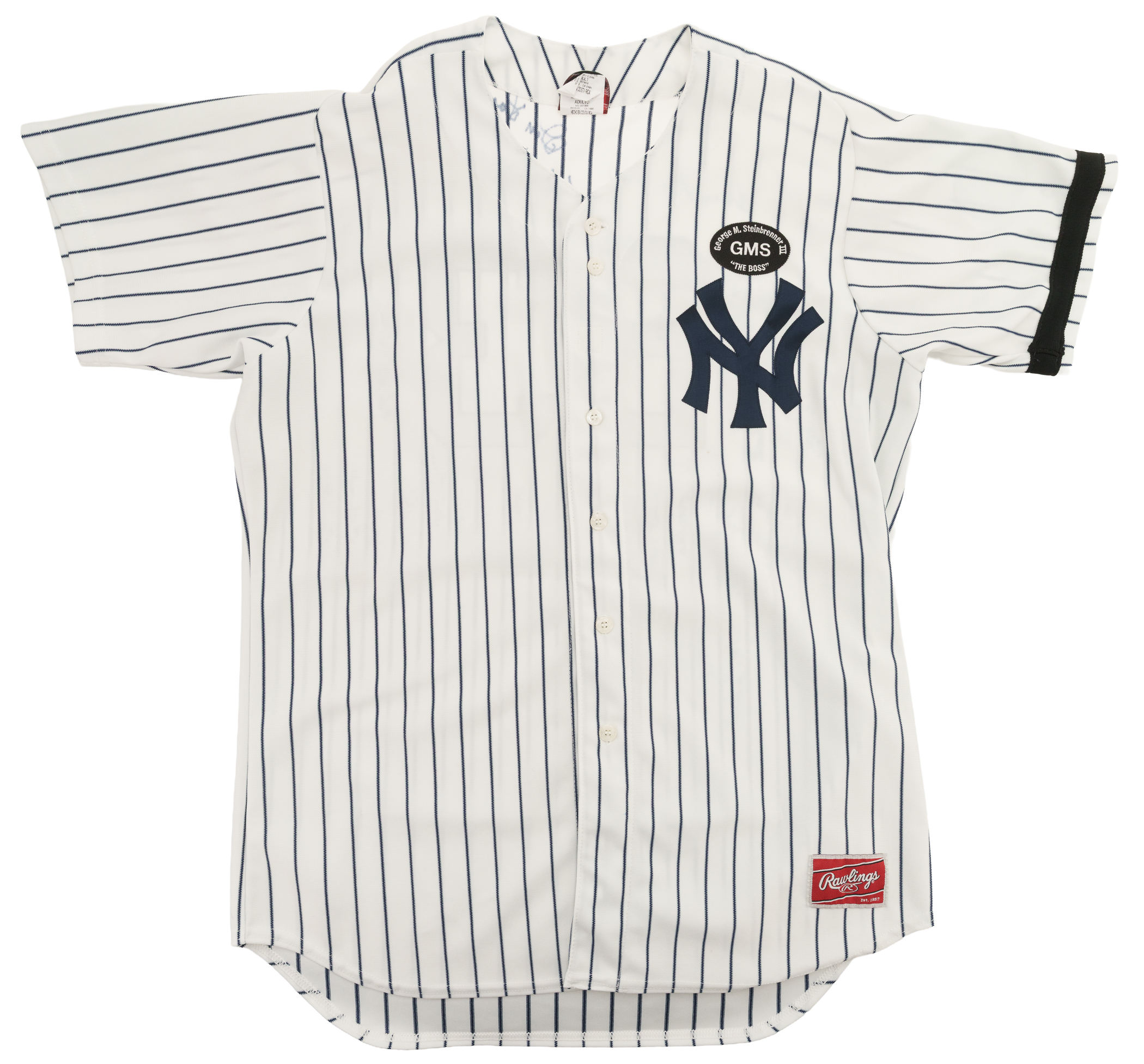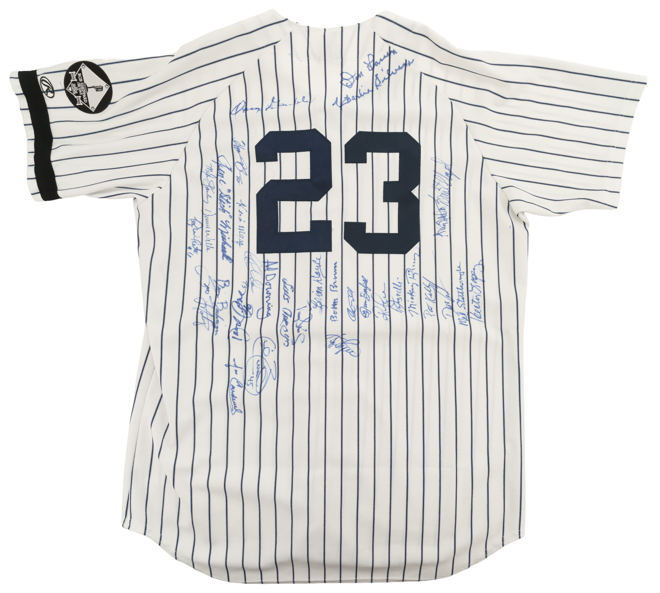 2010 New York Yankees home replica jersey signed in blue marker by thirty-one former Yankees players. Notable signatures include Don Larsen, Oscar Gamble, Charlie Silvera, Gene Michael, David Wells, Roy White, Jose Cardenal, Al Downing, Jesse Barfield, Mickey Rivers, and Mel Stottlemyre. The Rawlings jersey (size 48) features a George Steinbrenner memoriam patch along the left breast, a Bob Sheppard memoriam patch along the left sleeve, and a black armband along the left sleeve. Near Mint condition overall. Auction LOA from James Spence/JSA.