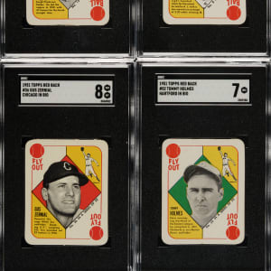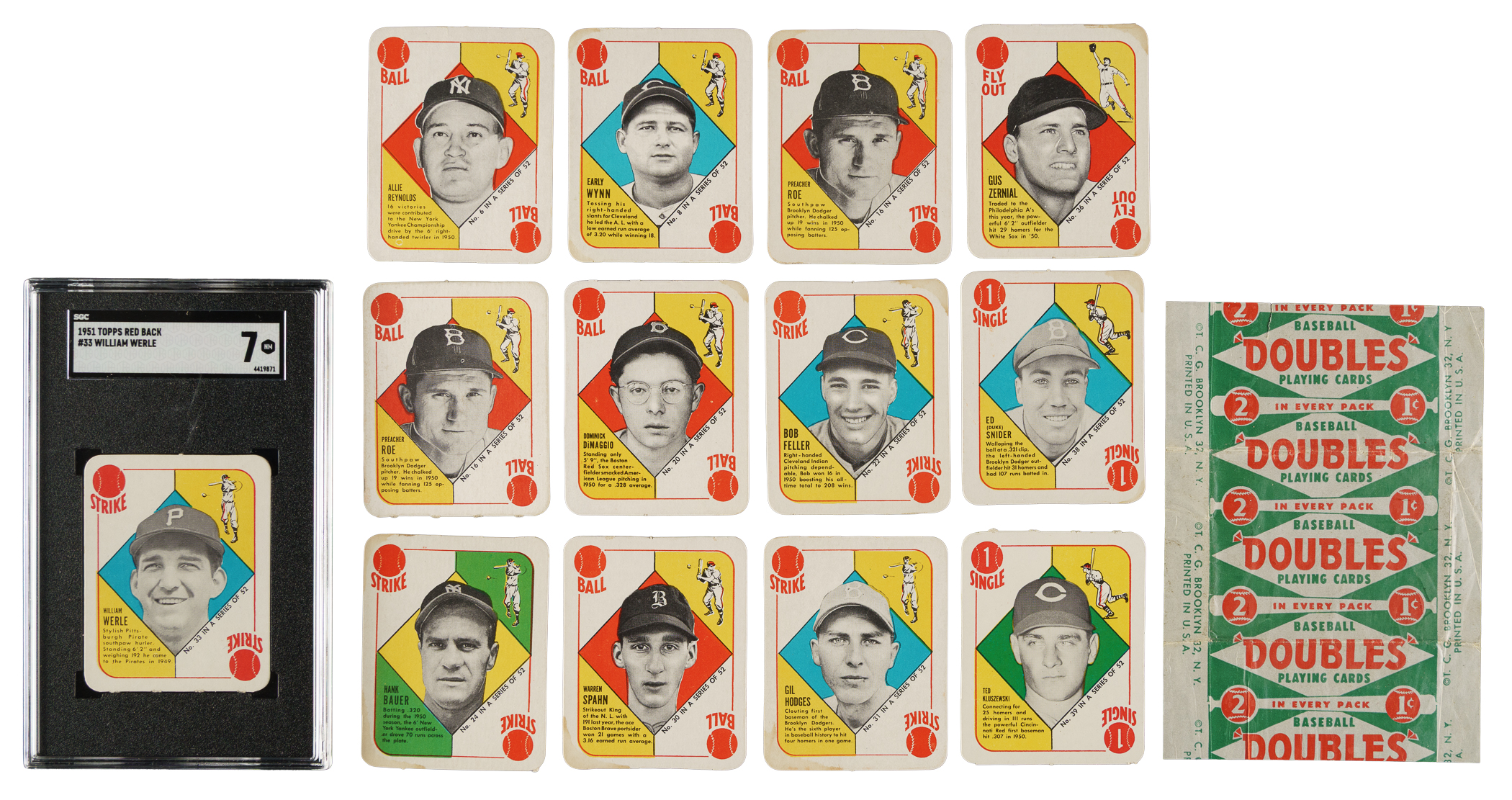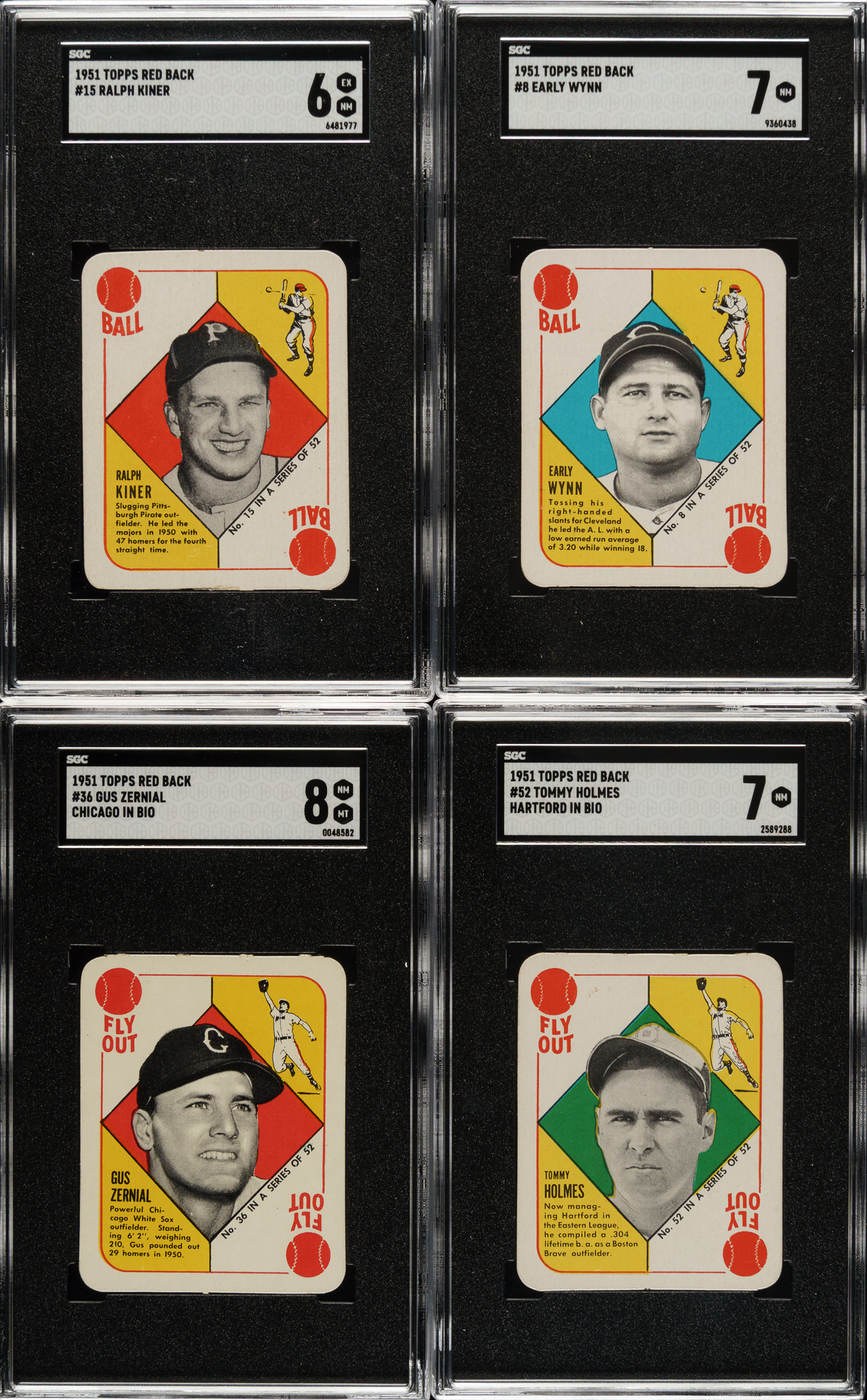 Presented is an outstanding, mostly high-grade near-complete master set of 1951 Topps "Red Backs" consisting of 50 cards out of 54 in a complete master set. The landmark "Red Backs" set is extremely significant as this was one of the first major baseball-card sets ever issued by Topps. Missing the following four cards for completion: #1 Berra, 5 Rizzuto, 50 Irvin, and 52a Holmes/Boston. Includes an original wrapper and the following sixteen duplicates: Two #4, 8 Wynn, 13, 16 Roe, 19, 23, 27, 28, 33, 34, 42, 44, 46, 47, and 51. The condition of the near set is 32% Nr/Mt to Nr/Mt-Mt, 16% Ex to Ex-Mt, and 28% Vg to Vg-Ex, and 24% lesser. The condition of the duplicates is three Ex or slightly better, eight Vg to Vg-Ex, and eight lesser. We have selected five cards for grading and encapsulation by SGC. Keys: #6 Reynolds (Vg), two 8 Wynn (NM 7 and Vg due to light staining), 15 Kiner (EX/NM 6), two 16 Roe (Ex and Vg-Ex+), 20 DiMaggio (Vg due to light staining), 22 Feller (Gd due to staining), 24 Bauer (Gd+ due to light staining), 30 Spahn (Gd due to staining), 31 Hodges (Gd due to staining), 33 (NM 7), 36a Zernial/Chicago (NM/MT 8), 36b Zernial/Philadelphia (Gd+ due to light staining), 38 Snider (Gd+ due to light staining), 39 Kluszewski (Vg), and 52b Holmes/Hartford (NM 7). The original wrapper grades Very Good due to a small tear of the top edge. The 1951 "Red Backs" Topps series is among the most significant, yet overlooked, of all early Topps cards, and in our opinion represents an excellent value. Total: 67 items (near master set of 50 cards plus 16 duplicates and a wrapper).