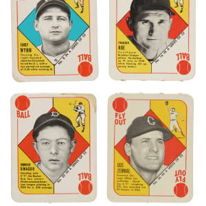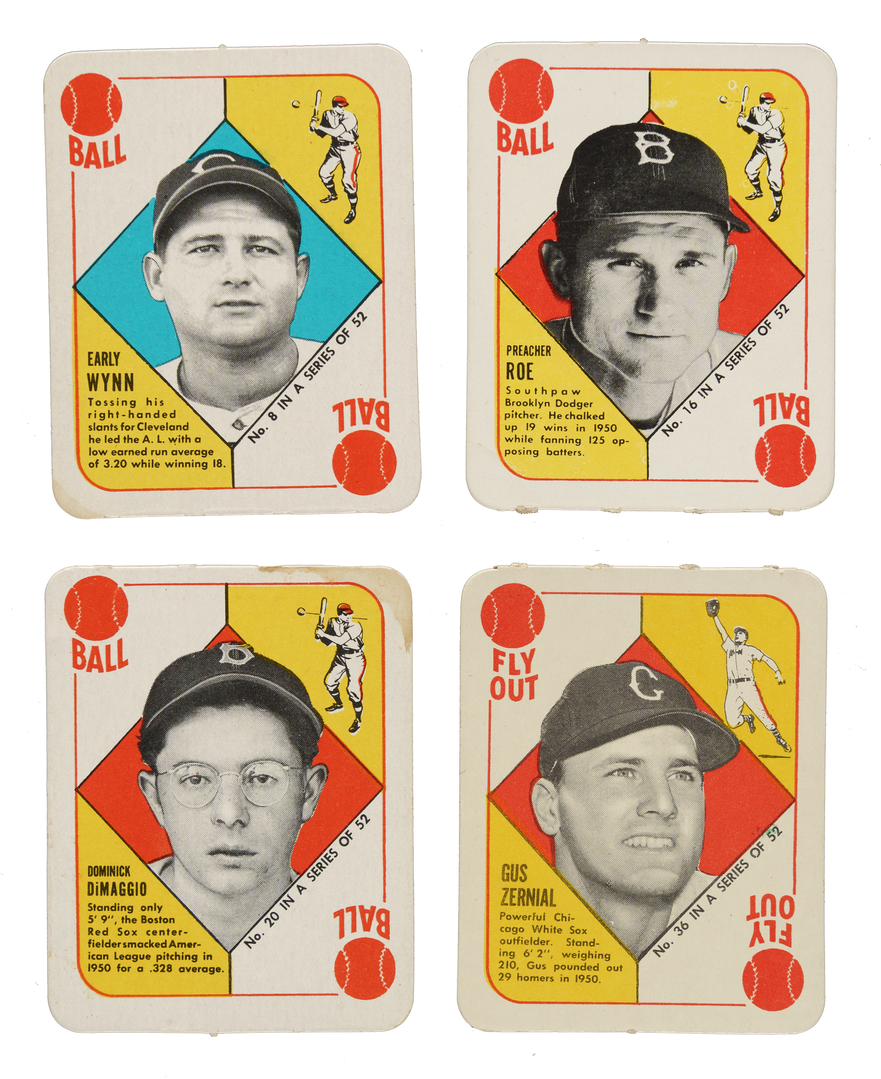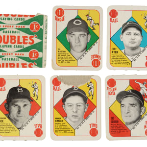 Presented is a collection of 1951 Topps "Red Backs" consisting of a partial set (35 out of 52) plus thirty-two duplicates and one original wrapper. The landmark "Red Backs" set is extremely significant as this was one of the first major baseball-card sets ever issued by Topps. Missing the following seventeen cards for completion: #1 Berra, 5 Rizzuto, 6 Reynolds, 9, 15 Kiner, 22 Feller, 24 Bauer, 25, 30 Spahn, 31 Hodges, 32, 37, 38 Snider, 41, 48, 50 Irvin, and 52 Holmes. Condition is 16% Ex-Mt to Nr/Mt, 14% Vg-Ex to Ex, 39% Gd to Vg, and 31% Pr to Fr (including one trimmed). The original wrapper grades Fr due to tear. Keys: Two #8 Wynn (Vg and Fr-Gd), two 16 Roe (Vg and Pr), two 20 D. DiMaggio (Gd and Pr), 36a Zernial/Chicago (Vg-Ex), and 39 Kluszewski (Gd+ due to staining). Duplicates (32): #3, two 4, 8 Wynn, 10, 11, 12, 13, 14, 16 Roe, 17, 18, 19, 20 DiMaggio, two 23, 26, two 27, 28, 29, 33, 34, 35, two 42, 43, 44, 46, 47, and two 51. This series represents Topps' first major effort in the baseball-card business. The 1951 "Red Backs" Topps series is among the most significant, yet overlooked, of all early Topps cards, and in our opinion represents an excellent value. Total: 67 cards (near set of 35 plus 32 duplicates).