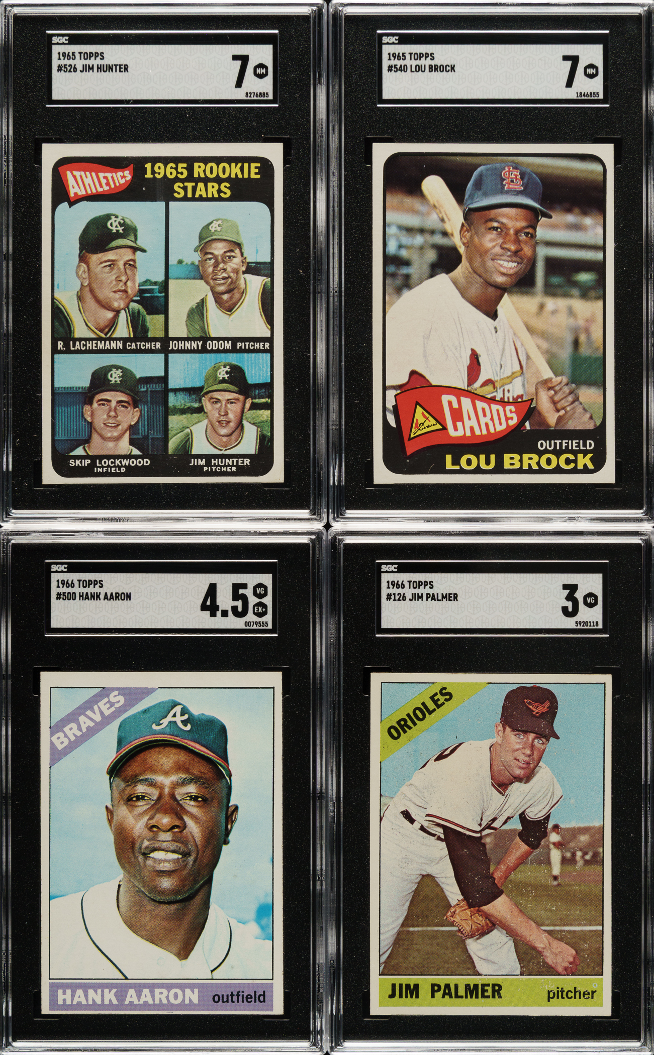 Very substantial collection of 1,175 cards from five classic 1960s Topps sets. This impressive collection is highlighted by 81 Hall of Famers, including Hank Aaron, Ernie Banks, Mickey Mantle, and the rookie cards of Joe Morgan, Catfish Hunter, Tony Perez, and Jim Palmer. We have selected four cards to be professionally graded and encapsulated by SGC. This collection consists of the following: 1) 1964 Topps (51 cards): Condition is 43% Ex (including some Ex-Mt) and 57% Vg to Vg-Ex. Keys: #543 Uecker (Vg) and 570 Mazeroski (Ex+). 2) 1965 Topps (599 cards): Condition is 18% Ex-Mt to Nr/Mt, 61% Vg-Ex to Ex, and 21% Gd to Vg (including a couple lesser, a few with a slight miscut, and fourteen trimmed). Keys: #1 AL Batting Ldrs, 2 NL Batting Ldrs, 5 AL RBI Ldrs, 6 NL RBI Ldrs, 12 NL Strikeout Ldrs, 15 Roberts, 16 Morgan RC (90/10 T/B, otherwise Vg), 50 Marichal, 62 Kaat, 74 Petrocelli RC, 95 Mazeroski, 110 Santo, 120 F. Robinson (Ex), 130 Kaline (Vg), 145 Tiant RC, 150 B. Robinson (Ex), 155 Maris (Vg-Ex), two 170 Aaron (Vg and Gd+), 176 McCovey (Gd), 187 Stengel, 193 Perry, 200 Torre, 205 Spahn (Vg-Ex+), 220 B. Williams, 236 McLain RC, 260 Drysdale (Ex), 266 Campaneris RC, 276 Wilhelm, 282 Murakami RC, 340 Oliva, 360 Cepeda, 377 Stargell (Ex-Mt), 385 Yastrzemski (Nr/Mt+), 400 Killebrew (Ex), 410 Aparicio, 461 Niekro, two 473 Blair/Johnson RC, 485 Fox, 510 Banks (Ex), 526 Hunter RC (NM 7), 540 Brock (NM 7), and 581 Perez RC (Ex). 3) 1966 Topps (318 cards): Condition is 10% Nr/Mt or better, 65% Ex to Ex-Mt, and 25% Vg to Vg-Ex (including a few lesser). Includes 22 cards from the high-number series (#523-598). Keys: #1 Mays (Fr-Gd), 36 Hunter, 50 Mantle (Fr), 70 Yastrzemski (95/5 L/R, otherwise Nr/Mt), 72 Perez (Vg), 80 Allen, 90 Aparicio, 91 Uecker, 92 Yankees Team, 99 Buc Belters, 110 Banks (Ex), 125 Brock (Ex+), 126 Palmer RC (VG 3), 130 Torre, 216 AL Batting Ldrs, 223 NL Pitching Ldrs, 255 Stargell, 390 B. Robinson (Vg+), 410 Kaline (Ex+), 420 Marichal, 430 Drysdale (Ex-Mt), two 500 Aaron (VG/EX+ 4.5 and Vg-Ex+), 510 Wilhelm, 526 Twins SP (Vg-Ex), 550 McCovey SP (80/20 T/B, otherwise Ex-Mt), and 555 Perranoski (Ex). 4) 1967 Topps (249 cards): Condition is 12% Nr/Mt or better, 56% Ex to Ex-Mt, 23% Vg to Vg-Ex, and 9% lesser (including 15 trimmed). Keys: #1 The Champs (Gd), 5 Ford (Vg), 20 Cepeda, 55 Drysdale (Ex+), two 100 F. Robinson (Ex and Vg-Ex+), 140 Stargell (Vg-Ex), 166 Mathews (Ex), 210 Gibson (Ex+), 234 NL ERA Ldrs, 236 NL Pitching Ldrs, 238 NL Strikeout Ldrs, 285 Brock (miscut centering on reverse, otherwise Ex+), 315 B. Williams (Vg-Ex+), 326 Uecker, 337 Morgan (Nr/Mt), two 361 Checklist - Clemente (Vg-Ex and marked, otherwise Ex), 369 Hunter (Ex-Mt), 456 Niekro, 500 Marichal, and 510 Mazeroski (Ex due mostly to centering). 5) 1968 Topps (23 cards): Condition is 34% Ex-Mt to Nr/Mt, 48% Vg-Ex to Ex, and 18% Vg). Keys: #80 Carew (Ex), 215 Bunning (Vg-Ex), two 384 McRae RC (Ex and Vg-Ex), 385 Hunter (Vg+), and 450 Kaat (Vg+). This is a very impressive and sizable collection of cards from these classic sets with scores of stars and Hall of Famers. Total: 1,240 cards. The size/weight of this item requires that there will be an additional shipping charge for this lot.