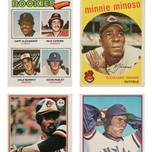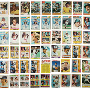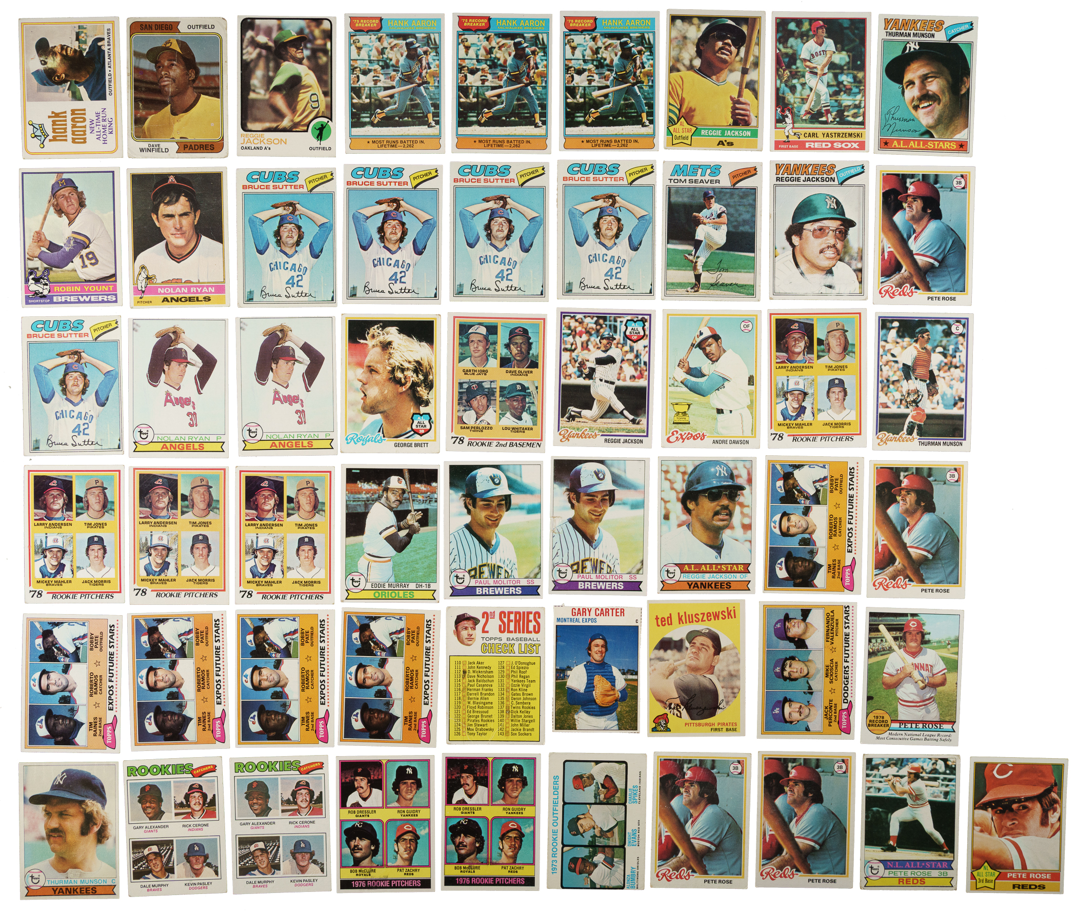 Very substantial shoebox collection of 2,235 Topps, Kellogg's, Bazooka, and Post Cereal baseball cards, spanning the years 1959 to 1982 and highlighted by 469 Hall of Famers, including Nolan Ryan, George Brett, and Johnny Bench. This collection consists of the following: 1) 1959 Topps (209 cards): Condition is 5% Nr/Mt, 31% Ex to Ex-Mt, 52% Vg to Vg-Ex, and 12% lesser. Keys: #35 Kluszewski (Ex) and 80 Minoso (Gd). 2) 1961 Post Cereal (43 cards): Condition ranges from Gd to Ex (averaging Vg/Vg-Ex). Consists entirely of hand-cut "box" variations. Keys: #10 McDougald (Vg-Ex), 90 Bauer (Vg+), and two 163 Roach (Vg-Ex and Vg). 3) 1962 Post Cereal (10 cards): Condition is four Gd to Vg and six Pr to Fr. Includes: #13, 14, 24, 27, 40, 48, 67, 76, 89, and 182. 4) 1963 Fleer (1 card): #28 (Fr). 5) 1963 Post Cereal (5 cards): #35 (Vg), 44 (Gd), 55 (Gd), 157 (Gd), and 194 (Fr-Gd). 6) 1964 Topps Giants (2 cards): #25 Torre (Vg) and 54 (Vg+). 7) 1965 Topps (188 cards): Condition is 10% Ex to Ex-Mt (including a couple Nr/Mt), 72% Vg to Vg-Ex, and 18% lesser. Includes thirty high-numbers (#371-598). 8) 1967 Topps (156 cards): Condition ranges from Pr to Ex (averaging Vg), with a couple Ex-Mt. 9) 1970 Kellogg's 3-D (4 cards): #9 (Pr-Fr), 22 Aparicio (Gd), 37 B. Williams (Fr), and 68 (Fr-Gd). 10) 1971 Kellogg's 3-D (3 cards): #6 Perry (Pr), 49 (Pr-Fr), and 51 Gibson (Pr). 11) 1971 Bazooka - Unnumbered: Gaston (Vg), Hundley (Fr), McDowell (Ex), Melton (Vg), and Petrocelli (Pr due to tape). 12) 1972 Kellogg's 3-D (2 cards): #19 (Ex) and 53 Stargell (Ex). 13) 1973 Topps Near-Complete Set (545/609) Plus Two Duplicates: Condition is 13% Ex to Ex-Mt (including a few Nr/Mt), 73% Vg to Vg-Ex, and 14% lesser. Keys: #10 Sutton, 67 K Ldrs - Ryan/Carlton, 80 Oliva, 84 Fingers, 85 Simmons, 115 Santo, 170 Killebrew, 180 Jenkins, 190 Gibson, 199 Blyleven, 200 B. Williams, 230 Morgan, 255 Jackson (Vg+), 275 Perez, 300 Carlton, 310 Allen, 320 Brock, 370 Stargell (Pr-Fr due to pen mark), 450 Torre, 530 Kaat and 614 Evans RC (Gd). 14) 1974 Topps (308 cards, including 74 from the Traded Series) Plus Complete Team Checklists (24): Condition is 10% Nr/Mt or better, 38% Ex to Ex-Mt, 44% Vg to Vg-Ex, and 8% lesser. Condition of the team checklists is 12% Ex or better, 29% Vg to Vg-Ex, and 59% lesser (including eleven marked). Keys: #1 Aaron (Vg), 10 Bench (Vg), 40 Palmer, 55 F. Robinson, 60 Brock, 70 Allen, 80 Seaver, 85 Morgan, 87 Jenkins, 98 Blyleven, two 215 Kaline, 350 Gibson, 456 Winfield RC (Pr), and 542 Gossage (Vg-Ex). 15) 1975 Kellogg's 3-D (7 cards): Condition is Nr-Mt-Mt to Mint overall, with two lesser due to cracks. Includes: #8, 13, 14, 24, 40, 43, and 50. 16) 1976 Topps (121 cards): Condition is 12% Nr/Mt or better, 39% Ex to Ex-Mt, 41% Vg to Vg-Ex, and 8% lesser. Keys: Three #1 Aaron RB (Ex-Mt and two Ex), 10 Brock, 98 Eckersley RC (Vg-Ex), five 150 Garvey, 160 Winfield, 185 Parker, 230 Yastrzemski, 240 Rose (Vg), two 270 Stargell, 316 Yount, 330 Ryan (Gd), 340 Rice, 345 Ruth ATAS (Vg+), two 355 Carlton, 365 Fisk, nine 400 Carew, two 405 Fingers, two 420 Morgan, five 450 Palmer, 480 Schmidt (Gd), 500 Jackson (Vg), two 520 McCovey, five 525 B. Williams, 542 Hernandez, two 592 Randolph RC (Vg-Ex and Pr), and two 599 Guidry RC (both Vg-Ex+). 17) 1976 Kellogg's (3 cards): #9 (Gd), 21 (Nr/Mt-Mt+), and 50 (Nr/Mt-Mt+). 18) 1977 Topps (165 cards): Condition is 8% Nr/Mt or better, 37% Ex to Ex-Mt, 45% Vg to Vg-Ex, and 10% lesser. Keys: #6 K Ldrs - Ryan/Seaver, 70 Bench (Vg), two 110 Carlton, five 120 Carew, 140 Schmidt (Vg), five 144 Sutter RC (Nr/Mt-Mt, Ex-Mt, two Vg, and Gd), 150 Seaver, 170 Munson, two 231 Brett RB, 285 B. Robinson, two 355 Brock, two 390 Winfield, four 460 Stargell, three 476 Murphy RC (70/30 L/R, otherwise Nr/Mt and two Vg), three 480 Yastrzemski, three 525 Eckersley, seven 547 McCovey, 580 Brett (Vg-Ex+), 600 Palmer, two 635 Yount, and 650 Ryan (Vg). 19) 1977 Kellogg's 3-D (2 cards): #1 (Ex) and 42 (Gd). 20) 1978 Topps (139 cards): Condition is 22% Ex to Ex-Mt (including some Nr/Mt), 64% Vg to Vg-Ex, and 14% lesser. Includes one Topps Burger King and four O-Pee-Chee cards. Keys: Ten #10 Niekro, twenty-seven 15 Perez, four 20 Rose (Ex, two Vg, and Gd), five 34 McCovey, 36 Murray RC (Vg-Ex), 60 Munson, two 72 Dawson, 100 Brett (Vg), five 120 Carter, two 170 Brock, 173 Yount, 200 Jackson, three 206 K Ldrs - Ryan/Niekro, two 330 Morgan, two 325 Sutter, two 510 Stargell, 530 Winfield, 540 Carlton, 560 Carew, three 686 Perry, four 703 Morris RC (two Vg-Ex and two Vg), and 704 Whitaker RC (Vg-Ex). 21) 1978 Kellogg's 3-D (7 cards): Condition is three Nr/Mt or better, Vg-Ex, Vg, Gd, and Fr due to cracking. Includes: Two #10, 18, two 36 John, 47, and 53 Blyleven (Gd due to crack). 22) 1979 Topps (192 cards): Condition is 20% Nr/Mt or better, 36% Ex to Ex-Mt, 36% Vg to Vg-Ex, and 8% lesser. Includes two Topps Burger King cards. Keys: Eleven #20 Morgan, two 24 Molitor (Vg and Pr), two 25 Carlton, five 30 Winfield, seven 50 Garvey, 55 Stargell, eight 100 Seaver, two 115 Ryan (Vg-Ex and Vg+), 200 Bench (Ex+), two 215 McCovey, 310 Munson, three 320 Yastrzemski, two 340 Palmer, three 369a Wills/Blue Jays, five 369b Wills/Rangers, five 409 Wilson RC, fourteen 417 Ryan/Johnson All-Time Ldrs, four 457 Sutter, 610 Schmidt (Gd), two 640 Murray (Ex and Vg-Ex), 650 Rose (Pr-Fr), two 665 Brock, twenty-six 670 Hunter, 680 Fisk, and three 700 Jackson. 23) 1979 Kellogg's 3-D (15 cards): Condition is ten ranging from Ex-Mt to Nr/Mt-Mt, five lesser. Includes: #14, 16, 20 Molitor (Nr/Mt-Mt), 23, 24, 27, 30 Lynn, 32, 38, 39 Griffey Sr., 40, 41 Evans, 44, 48, and 55. 24) 1979 Hostess (1 card): #24 Carter (Vg-Ex). 25) 1980 Topps (49 cards): Condition ranges from Vg to Nr/Mt-Mt (averaging Ex+). Includes: #1 Brock/Yastrzemski HL, two 70 Carter, 121, twelve 140 Gossage, 200 Rice, 230 Winfield, 232 Trammell, 245 Niekro, two 250 Kaat, 280 Perry, 290 Garvey, three 335 McCovey, 390 Jenkins, two 406 Molitor, two 440 Sutton, two 591, 600 J