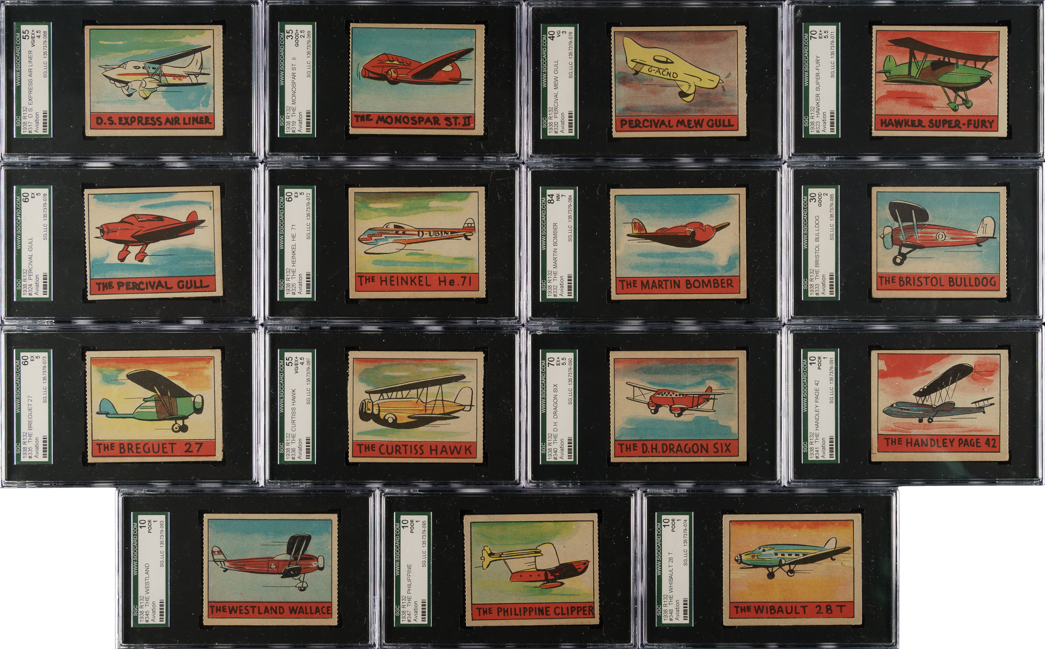 Presented is a collection of nineteen 1938 R132 "Series of 48 - Aviation" trading cards, each graded and encapsulated by SGC. This collection consists of the following: NM/MT 88 (1 card): #326. NM 84 (3 cards): #329, 332, and 337. EX/NM 80 (1 card): #318. EX+ 70 (2 cards): #323 and 340. EX 60 (3 cards): #324, 325, and 335. VG/EX+ 55 (2 cards): #317 and 336. VG 40 (1 card): #320. GOOD+ 35 (1 card): #319. GOOD 30 (1 card): #333. POOR 10 (4 cards): #341, 345, 347, and 348. Total: 19 cards. The size/weight of this item requires that there will be an additional shipping charge for this lot.