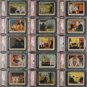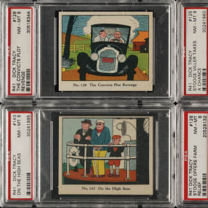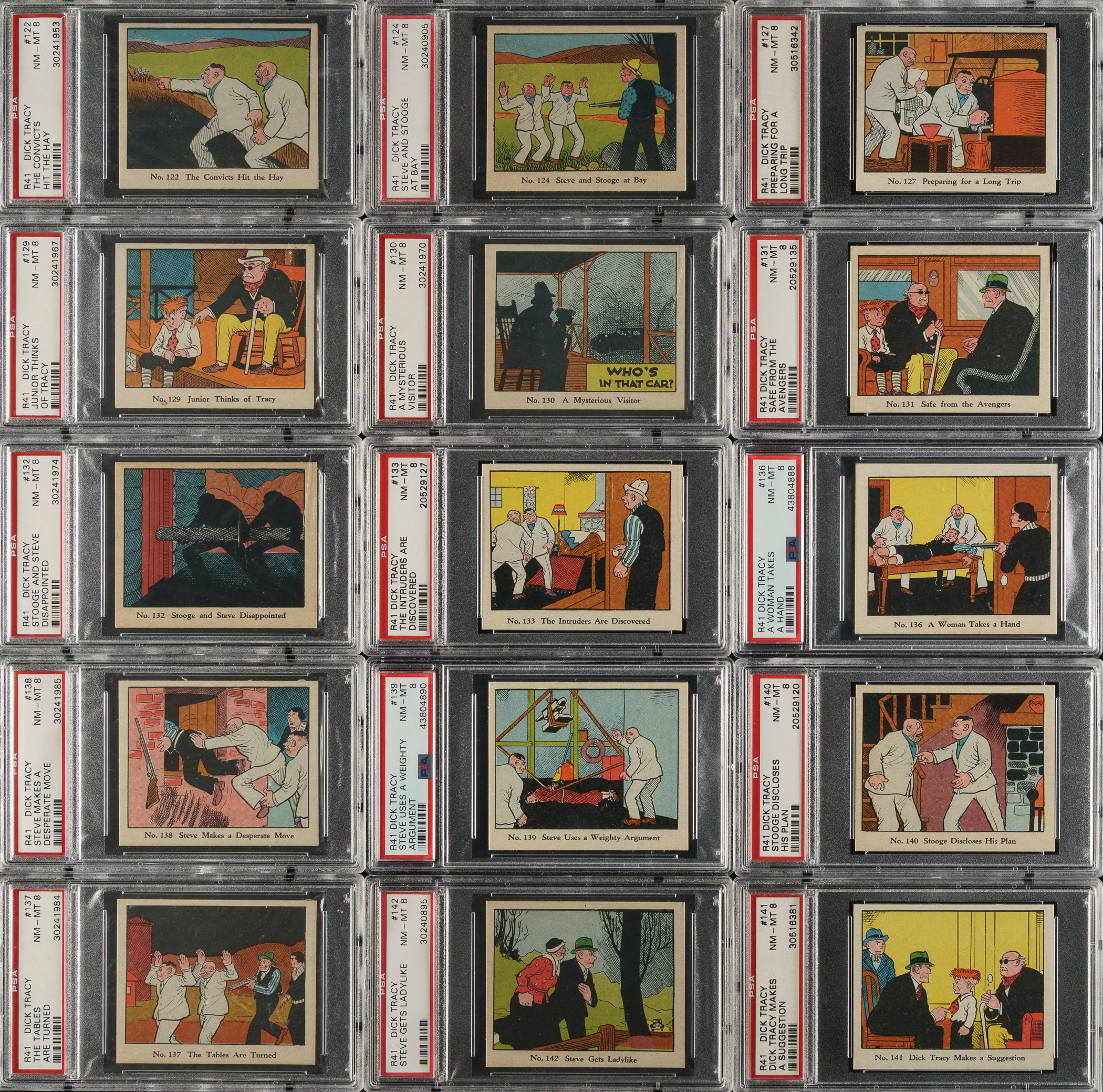 Collection of nineteen 1935 R41 "Dick Tracy Caramels" cards, each graded NM-MT 8 and encapsulated by PSA. This collection consists of the following: #122, 124, 125, 126, 127, 128, 129, 130, 131, 132, 133, 136, 137, 138, 139, 140, 141, 142, and 143. Total: 19 cards. The size/weight of this item requires that there will be an additional shipping charge for this lot.