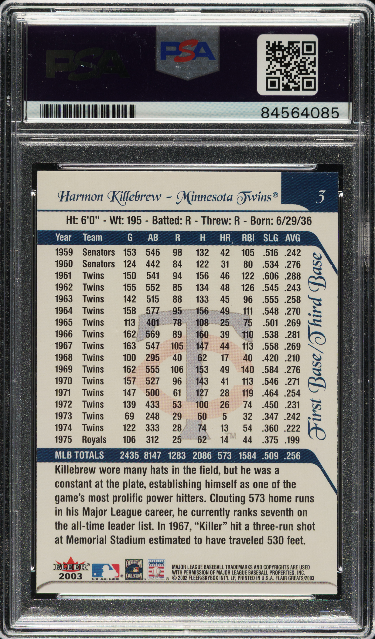 PSA/DNA has encapsulated the card, grading the signature Authentic. Minnesota Twins Hall of Famer Harmon Killebrew.