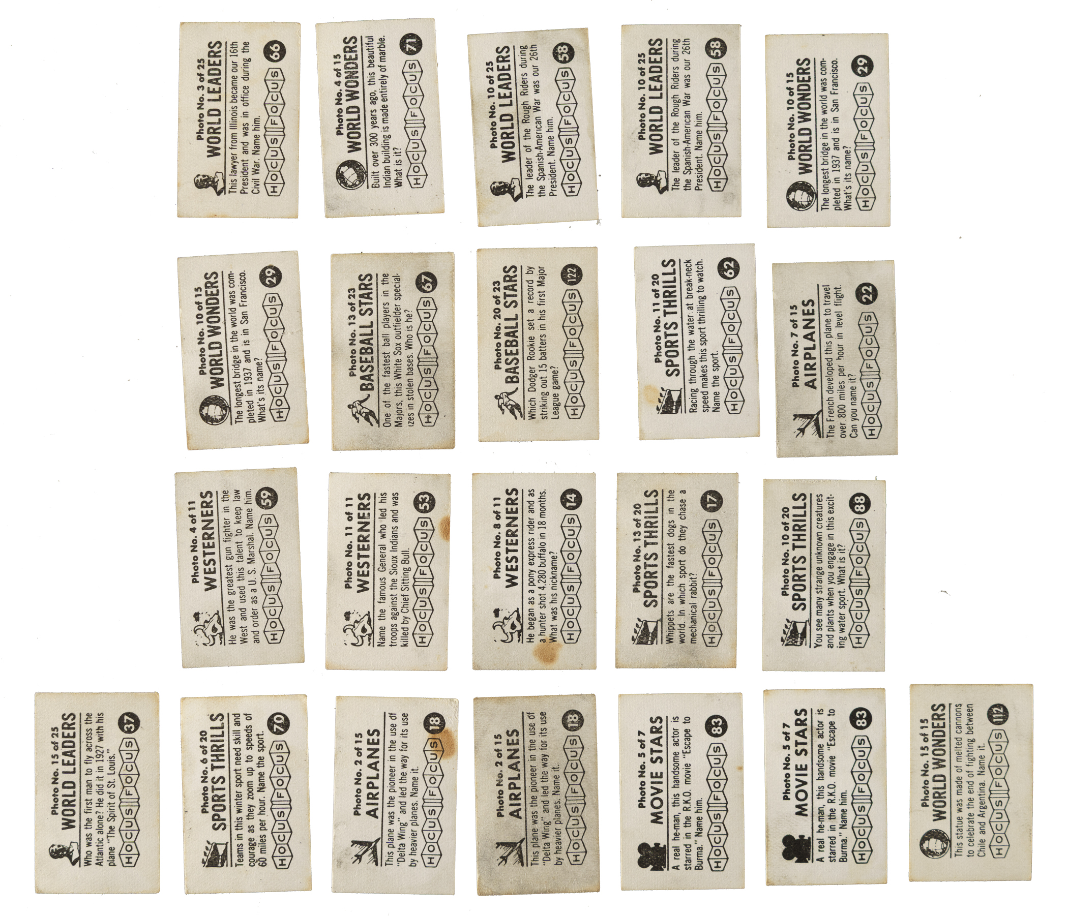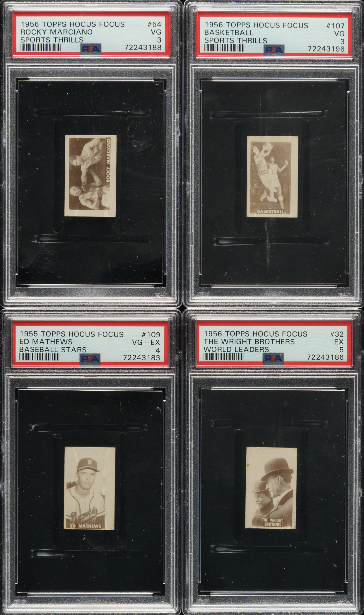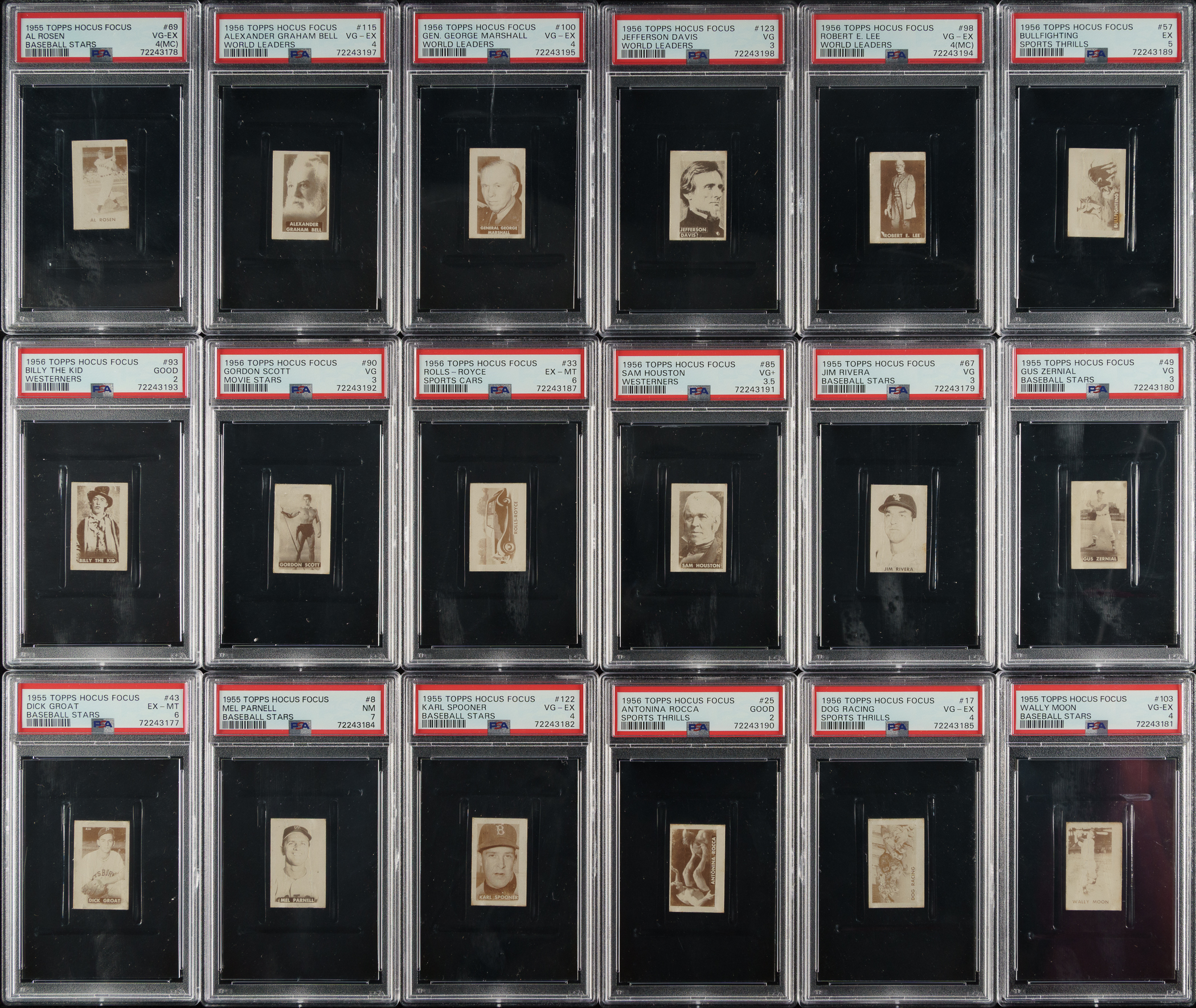 Presented is an impressive 44-card collection of 1956 Topps "Hocus Focus," including eight (plus two duplicates) out of the 23 baseball players featured in the set. This fascinating set, issued by Topps in 1956, is a multi-themed issue including sports stars, historical figures, movie stars, and famous landmarks. These "self-developing" cards (1 x 1-5/8 inches) are somewhat similar in design to the 1948 "Magic Photos" series because when issued they had blank fronts: the sepia photos on the fronts could be developed by youngsters exposing them to the sun. The self-developing process produced very inconsistent results, and many cards that have survived have photos that are very poorly developed. The photo quality of this assemblage is better than the norm, with the majority having adequate contrast and detail. Twenty-two cards have been professionally graded and encapsulated by PSA. PSA Grading Composite: NM 7 (1 card): #8 Parnell. EX-MT 6 (2 cards): #33 and 43 Groat. EX 5 (2 cards): #32 Wright Brothers and 57. VG-EX 4 (8 cards): #17, 69 Rosen (MC), 98 (MC), 100, 103 Moon, 109 Mathews, 115 Graham Bell, and 122 Spooner. VG+ 3.5 (1 card): #85. VG 3 (6 cards): #49 Zernial, 54 Rocky Marciano, 67 Rivera, 90, 107 Basketball, and 123. GOOD 2 (2 cards): #25 and 93 Billy the Kid. Also includes the following 22 unencapsulated cards: #14, 17, two 18, 22, two 29, 37 Lindbergh, 53 Custer, two 58 T. Roosevelt, 59, 62, 66 Lincoln, 67 Rivera, 70, 71, two 83 Robert Ryan, 88, 112, and 122 Spooner. The condition of the unencapsulated balance is 18% Vg-Ex, 59% Gd to Vg, and 23% lesser. This is a rare opportunity to acquire a very attractive collection of this fascinating and scarce vintage-card issue, which has always been somewhat overlooked by collectors, perhaps because of its unusual self-developing design and small dimensions. Total: 44 cards. The size/weight of this item requires that there will be an additional shipping charge for this lot.