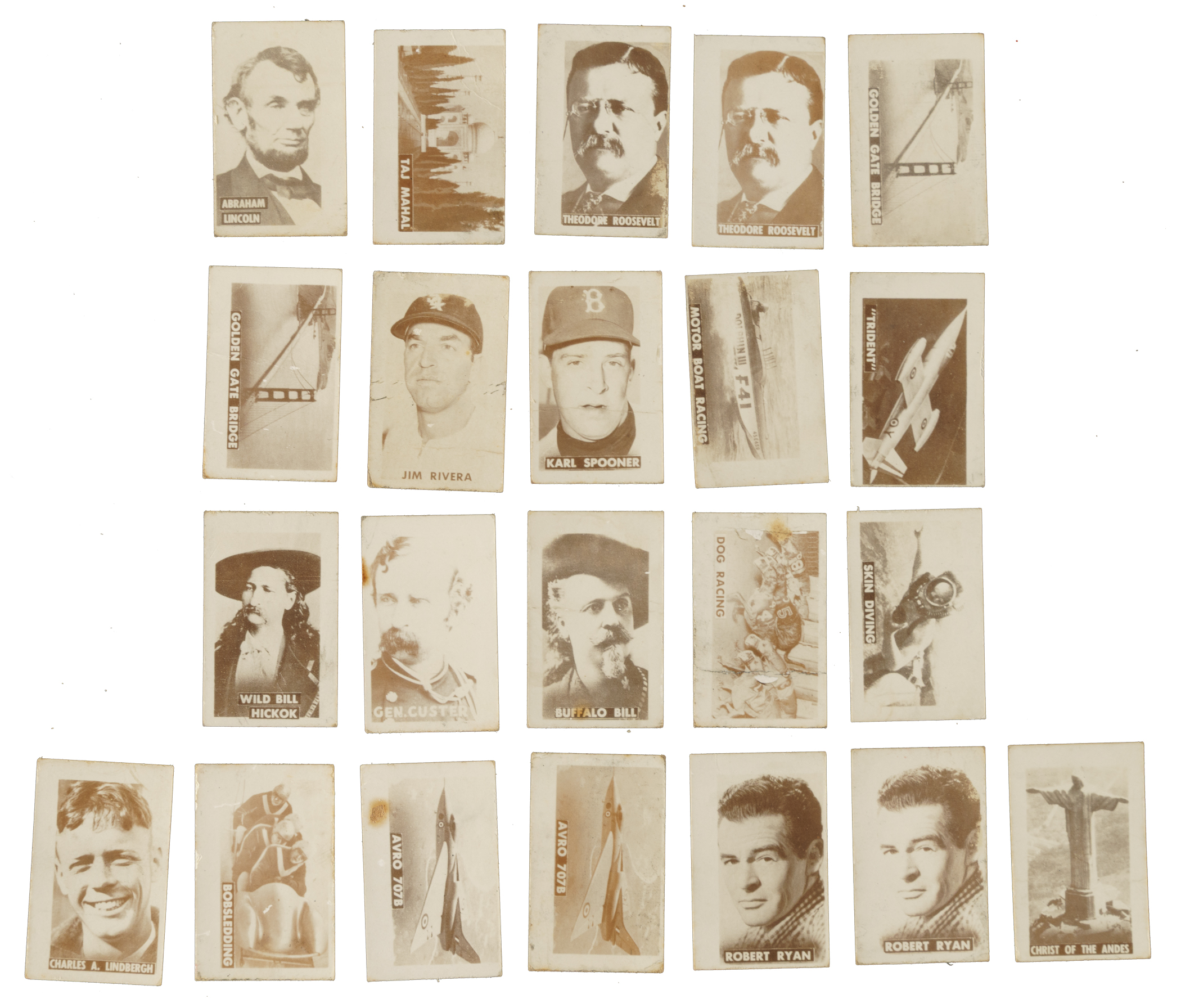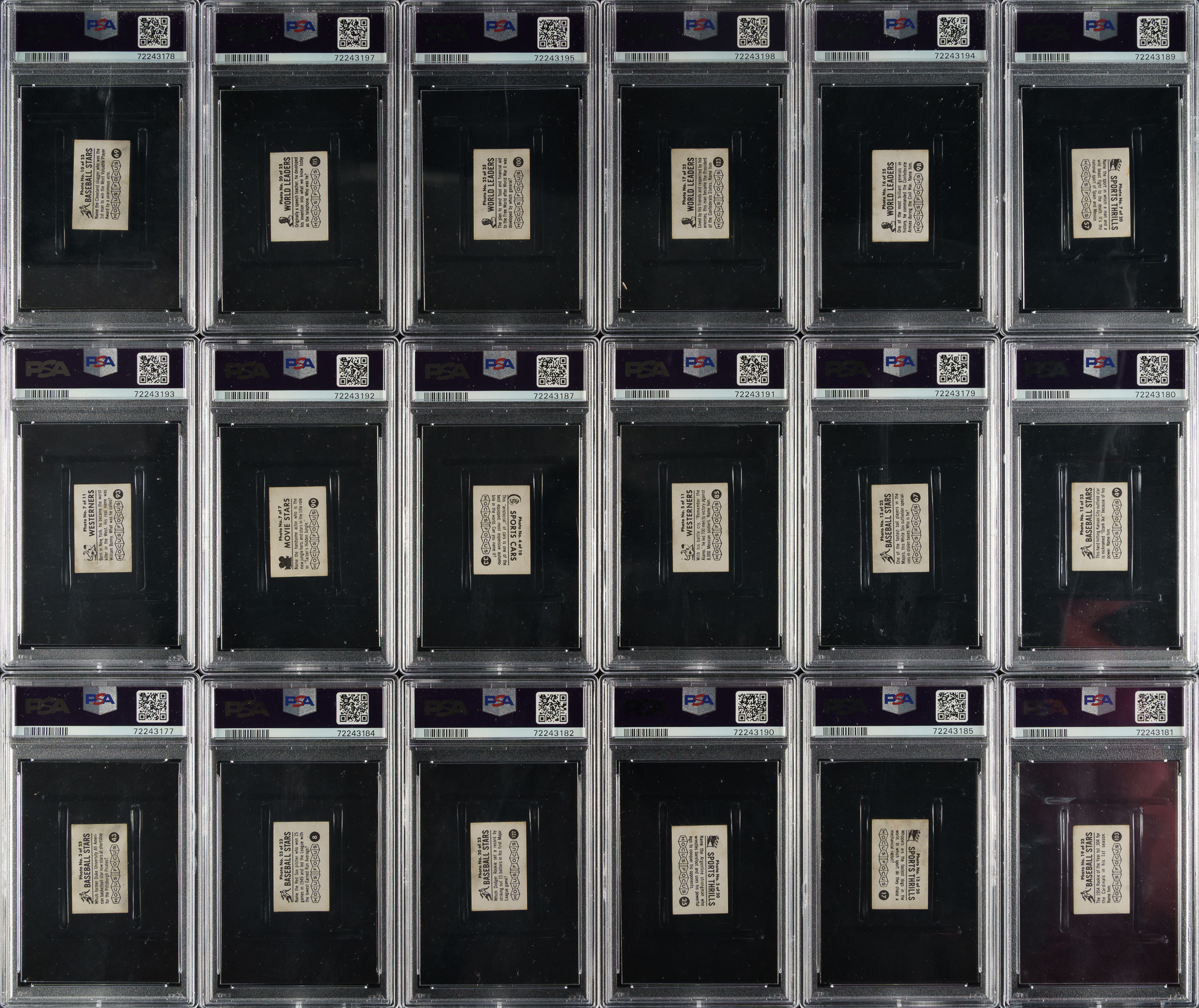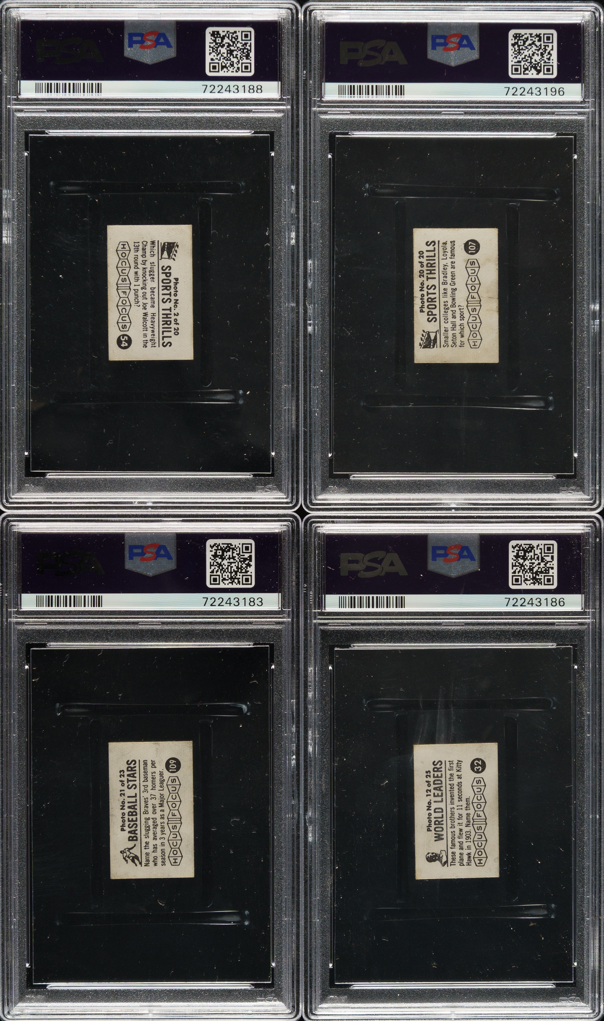 Presented is an impressive 44-card collection of 1956 Topps "Hocus Focus," including eight (plus two duplicates) out of the 23 baseball players featured in the set. This fascinating set, issued by Topps in 1956, is a multi-themed issue including sports stars, historical figures, movie stars, and famous landmarks. These "self-developing" cards (1 x 1-5/8 inches) are somewhat similar in design to the 1948 "Magic Photos" series because when issued they had blank fronts: the sepia photos on the fronts could be developed by youngsters exposing them to the sun. The self-developing process produced very inconsistent results, and many cards that have survived have photos that are very poorly developed. The photo quality of this assemblage is better than the norm, with the majority having adequate contrast and detail. Twenty-two cards have been professionally graded and encapsulated by PSA. PSA Grading Composite: NM 7 (1 card): #8 Parnell. EX-MT 6 (2 cards): #33 and 43 Groat. EX 5 (2 cards): #32 Wright Brothers and 57. VG-EX 4 (8 cards): #17, 69 Rosen (MC), 98 (MC), 100, 103 Moon, 109 Mathews, 115 Graham Bell, and 122 Spooner. VG+ 3.5 (1 card): #85. VG 3 (6 cards): #49 Zernial, 54 Rocky Marciano, 67 Rivera, 90, 107 Basketball, and 123. GOOD 2 (2 cards): #25 and 93 Billy the Kid. Also includes the following 22 unencapsulated cards: #14, 17, two 18, 22, two 29, 37 Lindbergh, 53 Custer, two 58 T. Roosevelt, 59, 62, 66 Lincoln, 67 Rivera, 70, 71, two 83 Robert Ryan, 88, 112, and 122 Spooner. The condition of the unencapsulated balance is 18% Vg-Ex, 59% Gd to Vg, and 23% lesser. This is a rare opportunity to acquire a very attractive collection of this fascinating and scarce vintage-card issue, which has always been somewhat overlooked by collectors, perhaps because of its unusual self-developing design and small dimensions. Total: 44 cards. The size/weight of this item requires that there will be an additional shipping charge for this lot.