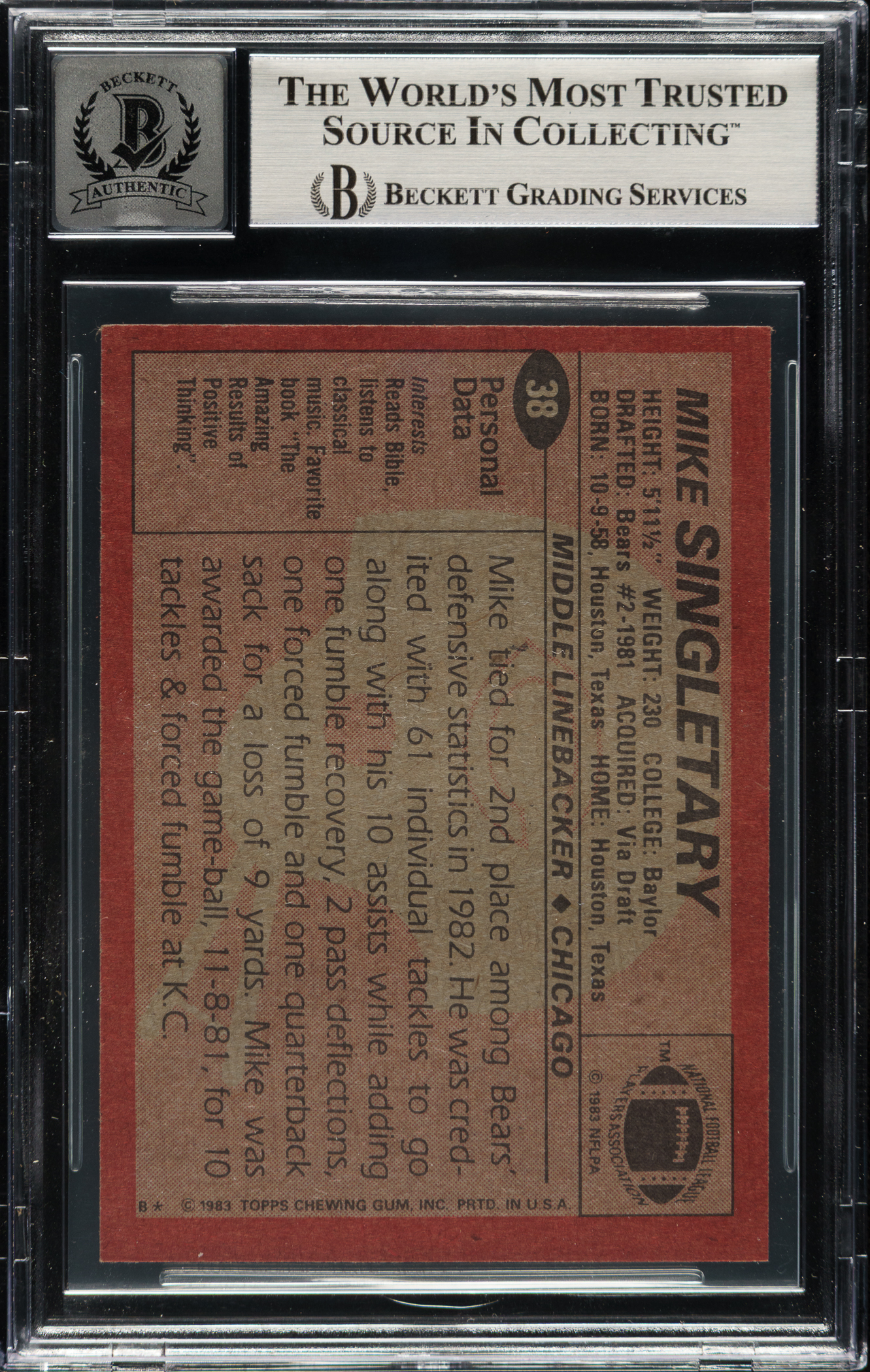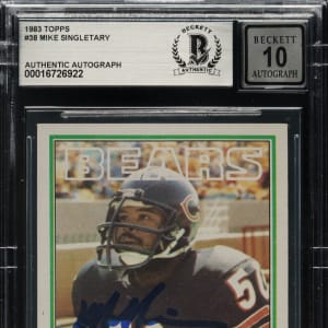 BGS has encapsulated the card, grading the signature GEM MINT 10. Chicago Bears football Hall of Famer Mike Singletary.