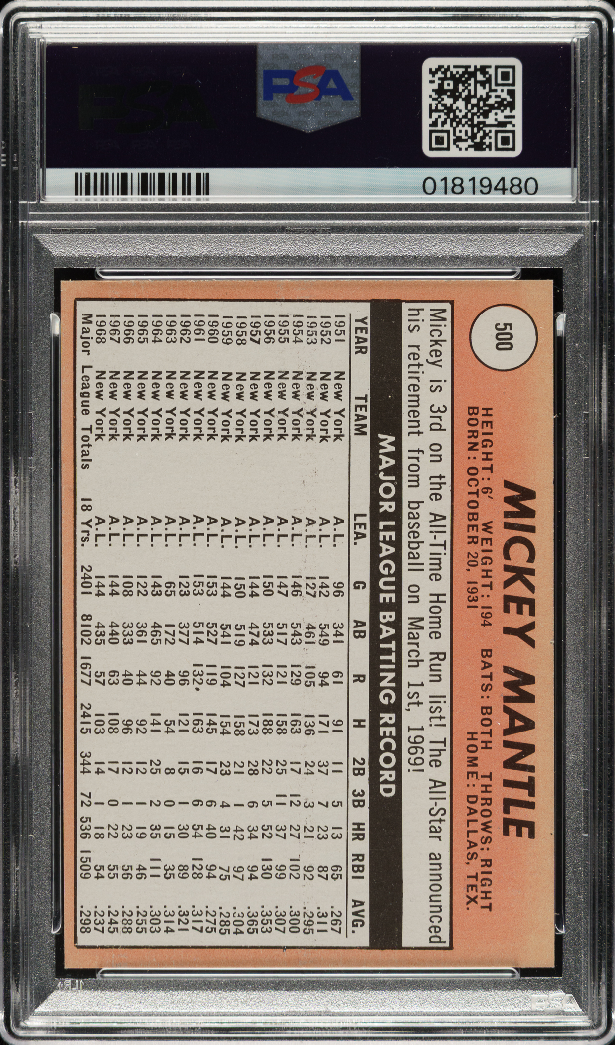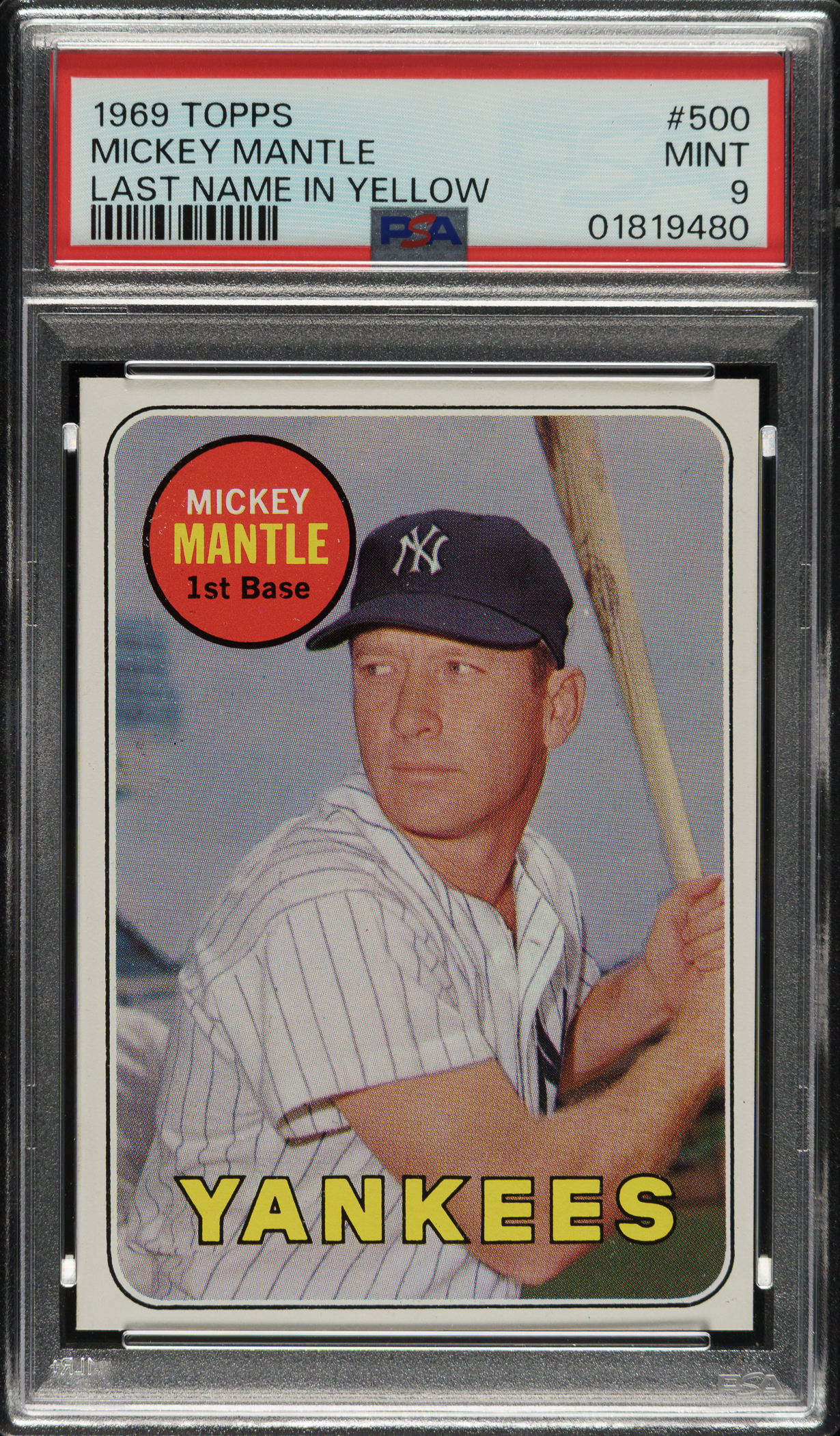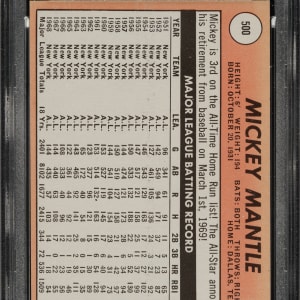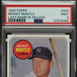Graded MINT 9 by PSA. Magnificent ultra-high-grade example of Mickey Mantle from the 1969 Topps set. Bright, crisp, and clean with brilliant colors, a strong image, and four sharp corners. Clean reverse. A quick look at the PSA Population Report shows that an astounding 13,329 examples of this card have been graded. Of these, only two examples have ever graded GEM MINT 10. This is a spectacular example of Mantle's final card and one of the key cards of the 1960s.