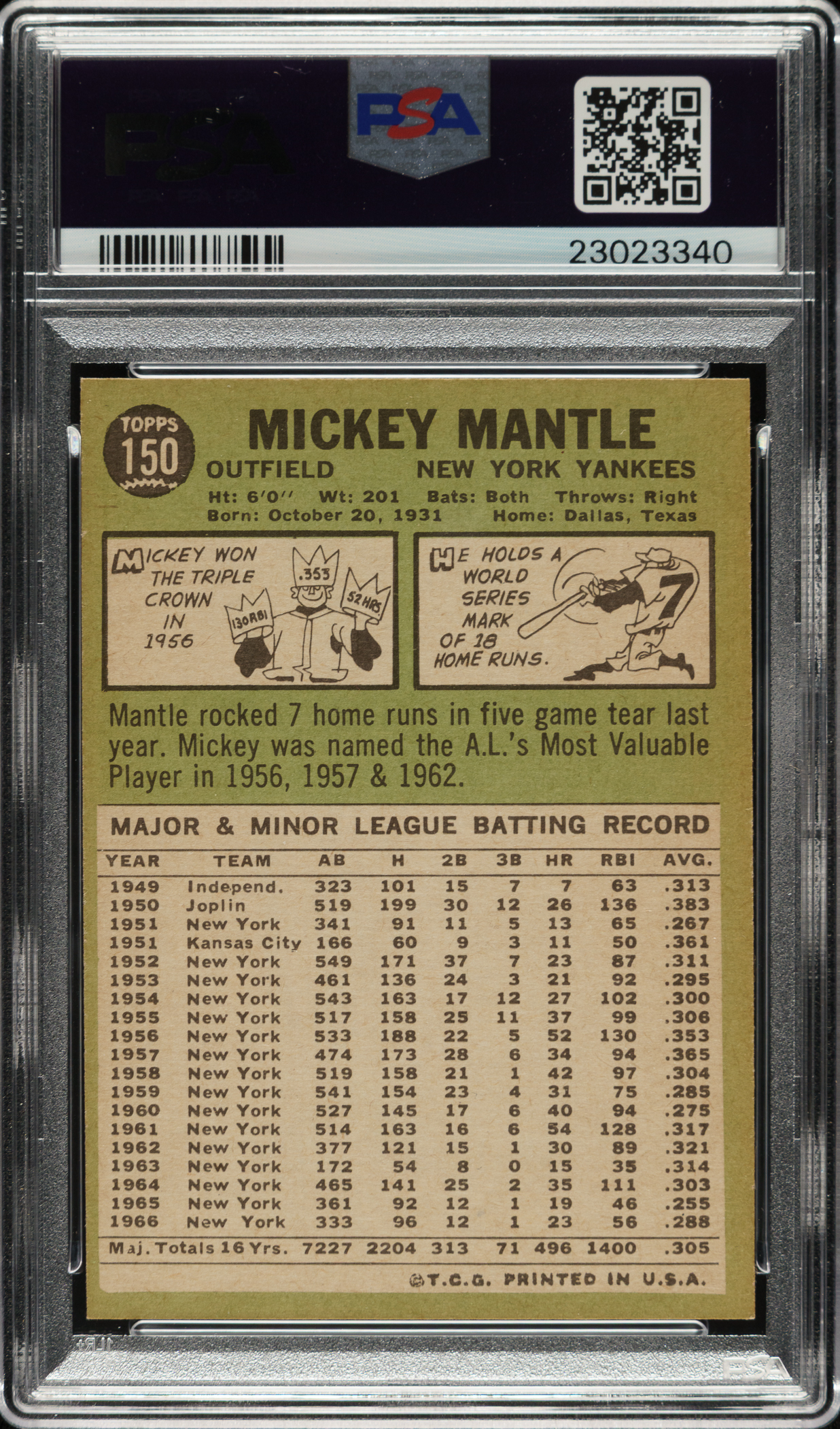 Graded MINT 9 by PSA. Stunning ultra-high-grade example of the key card from the 1967 Topps set: #150 Mickey Mantle. This card displays bright colors, superb image clarity, and sharp corners. A quick look at the PSA Population Report shows that an astounding 13,003 examples of this card have been graded to date. Of these, only two examples has ever graded GEM MINT 10. This is a highly-graded PSA card that would fit perfectly in any world-class Mickey Mantle or 1967 Topps collection.