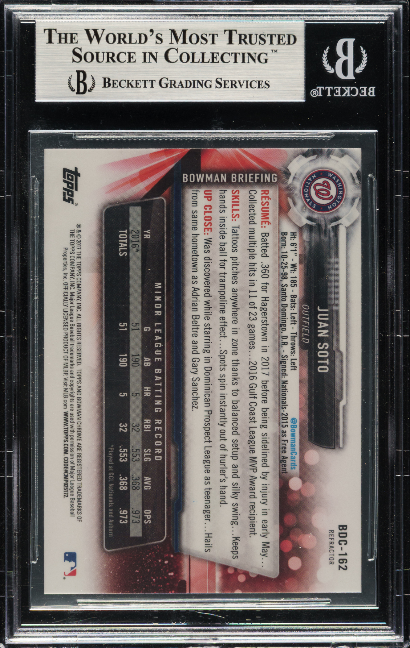 Beckett has encapsulated the card, grading the signature Authentic. Washington Nationals.