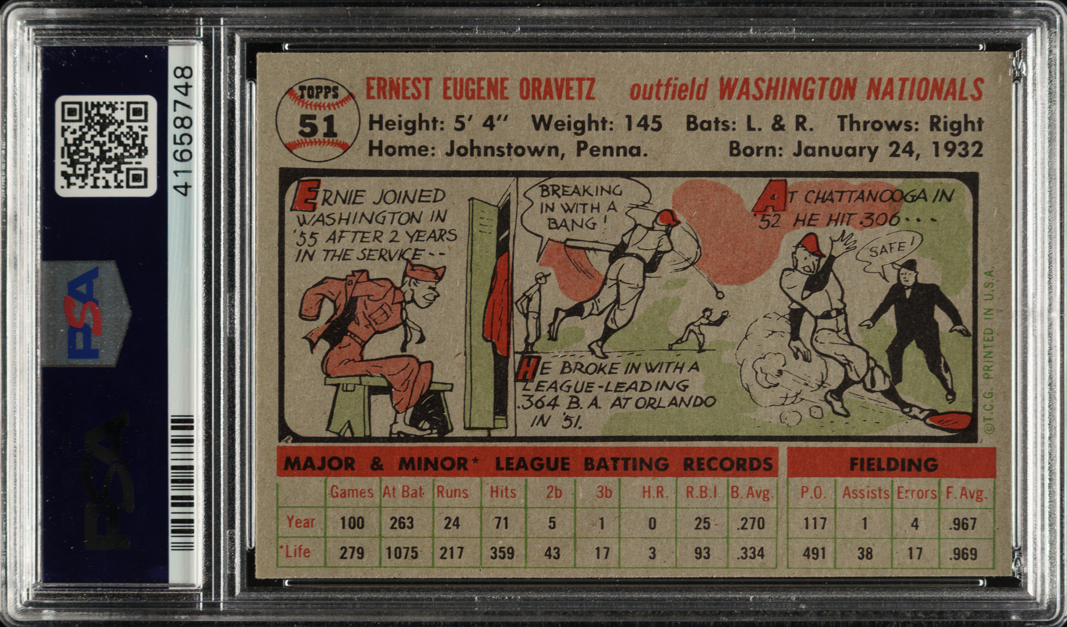 Lot # 2717: 1956 Topps #51 Ernie Oravetz Gray Back PSA MINT 9