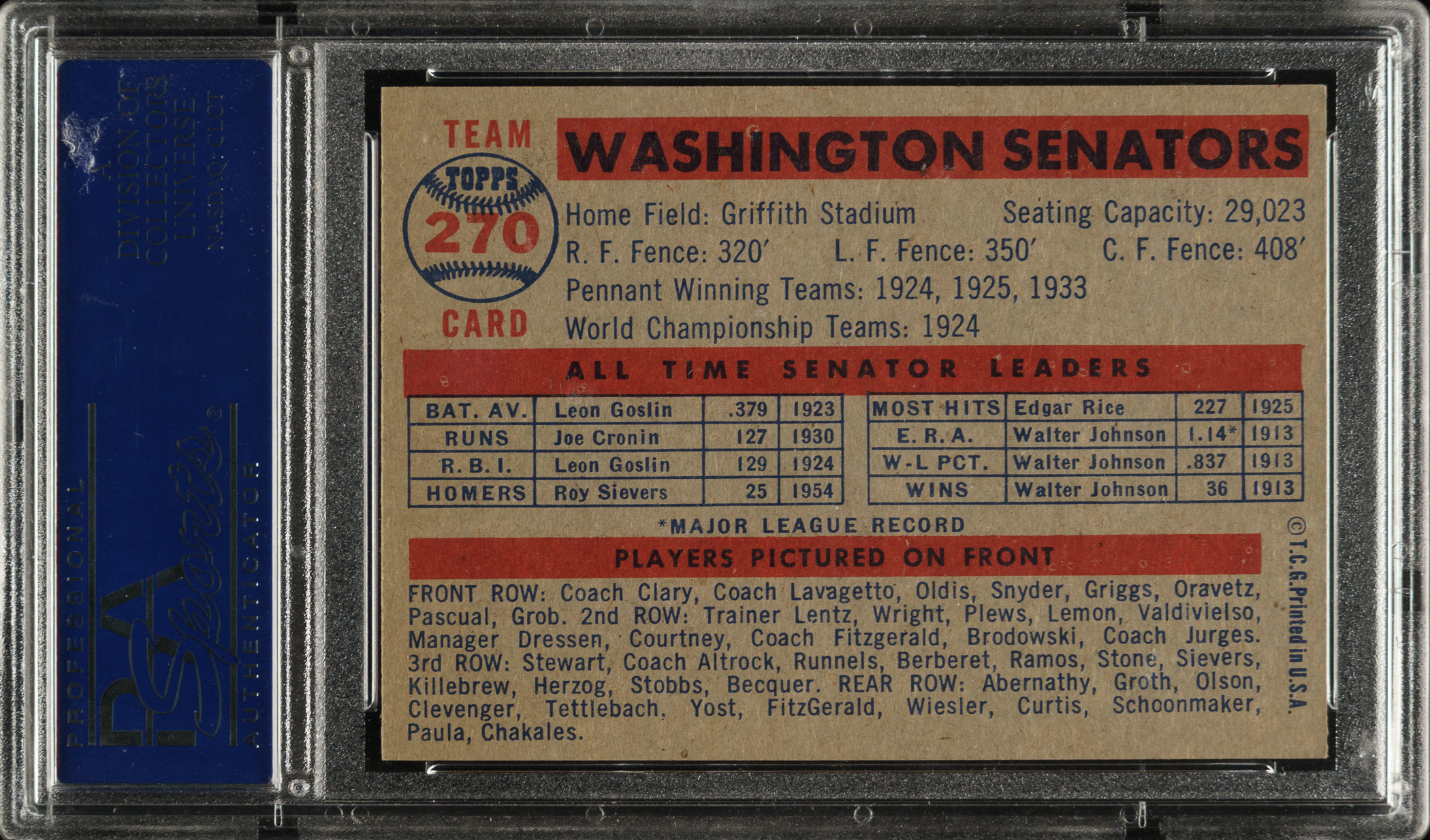 Lot # 2747: 1957 Topps #270 Washington Senators Team PSA NM-MT 8