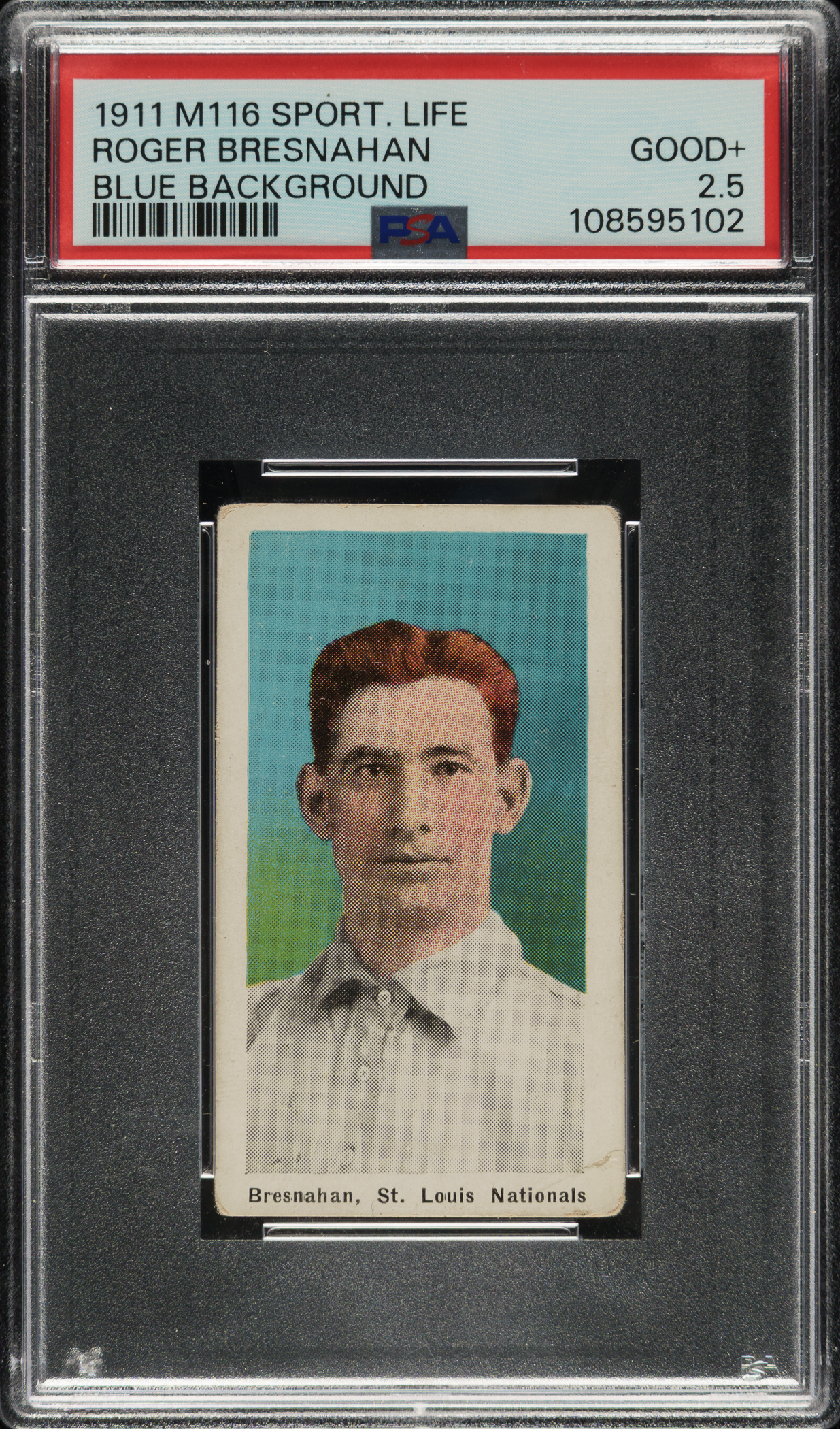 Lot # 1524: 1910-1911 M116 Sporting Life Roger Bresnahan Blue Background PSA GOOD+ 2.5