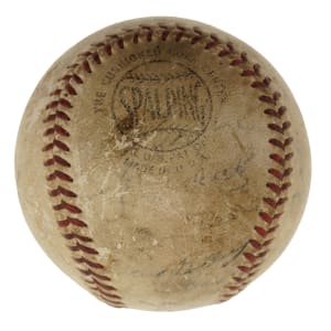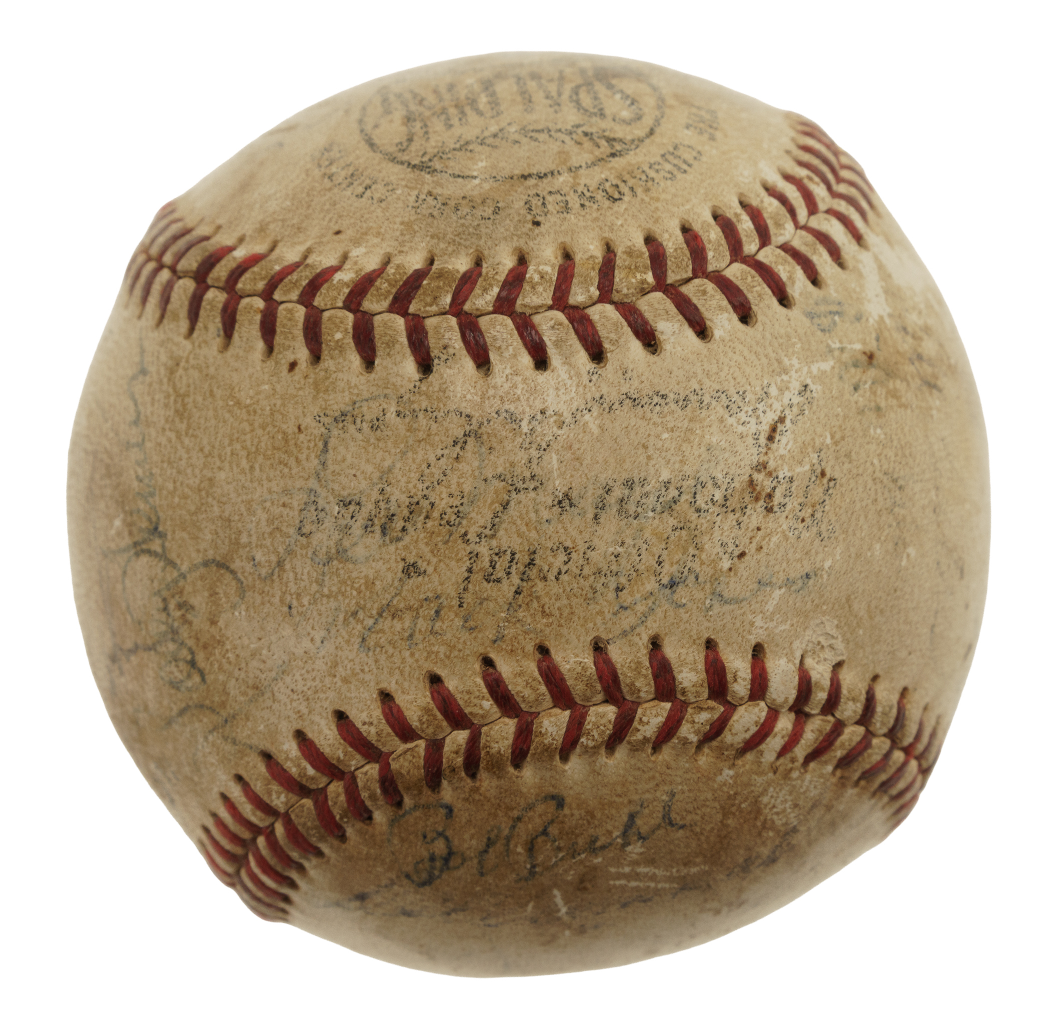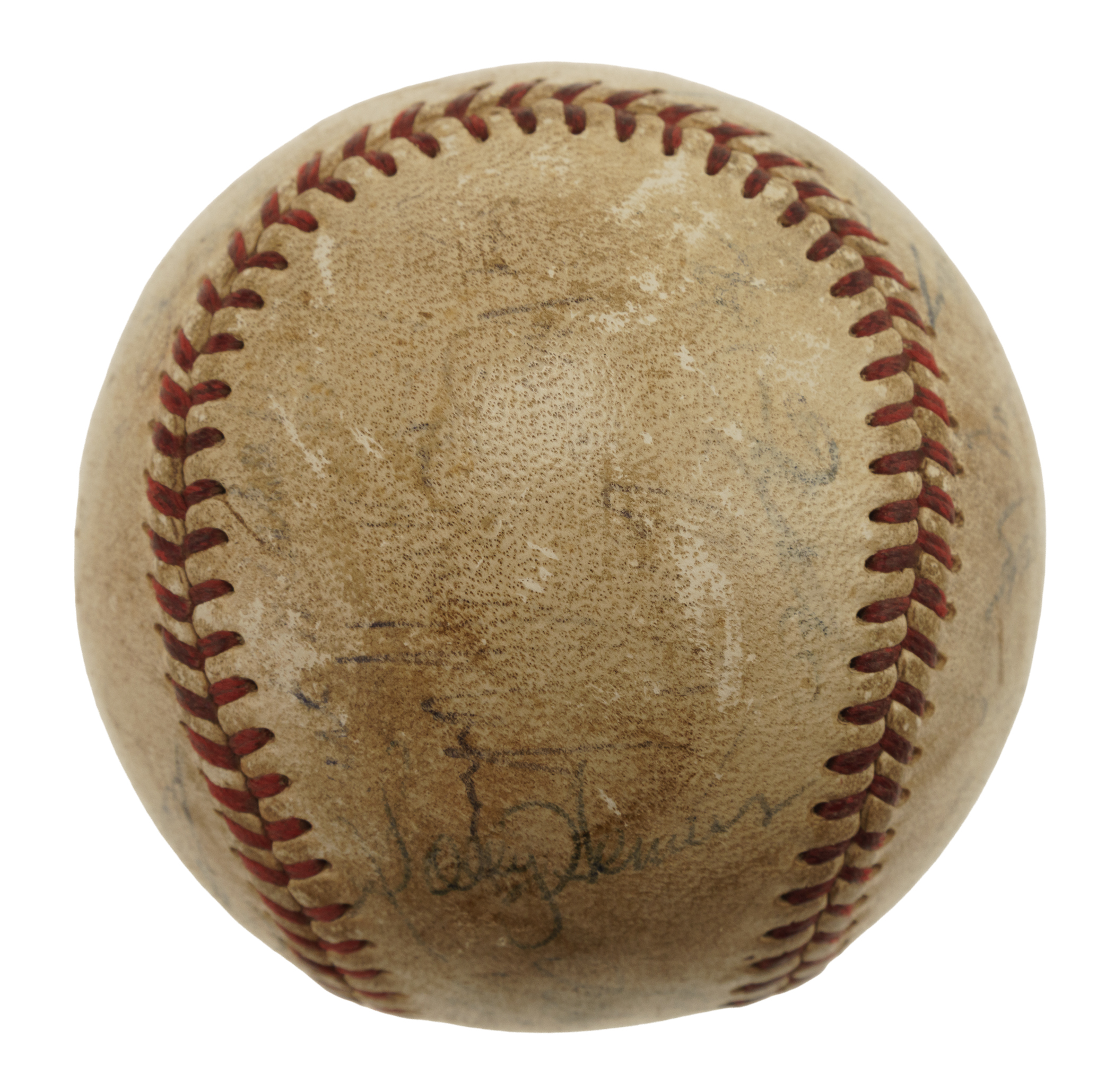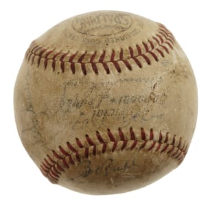 Official National League baseball (Giles) signed by Hall of Fame manager Casey Stengel in blue ink on the sweet spot. While the ball displays several other signatures, they are illegible due to a combination of being faded and the ball's condition. The ball is soiled throughout and exhibits several surface abrasions. Fair condition overall. Auction LOA from James Spence/JSA.