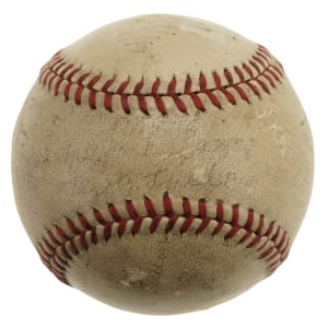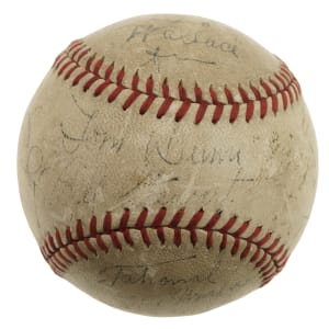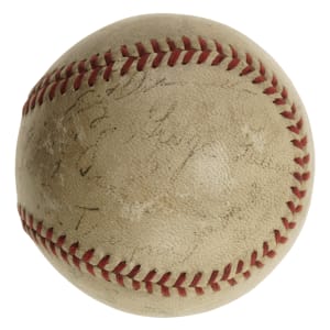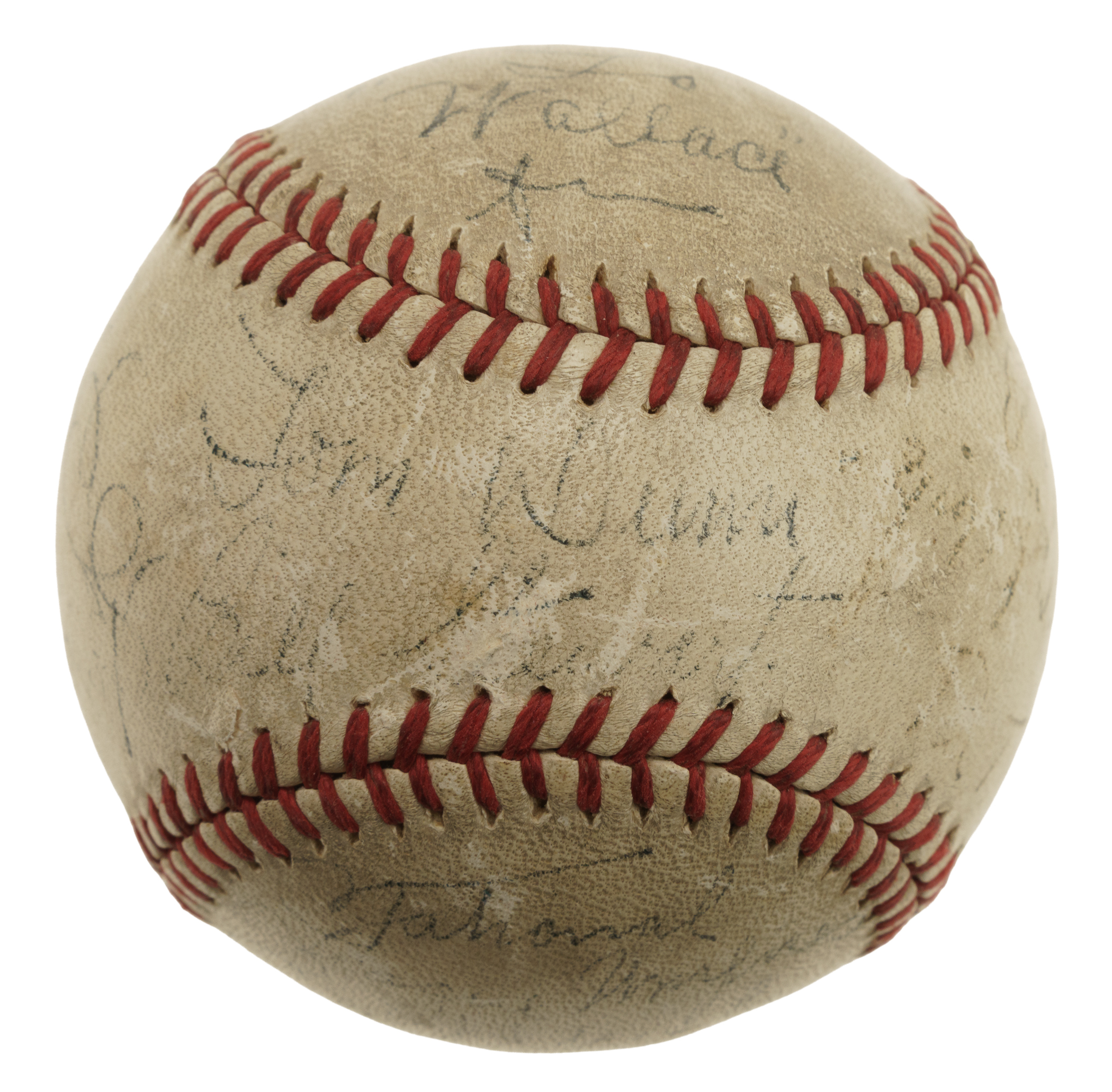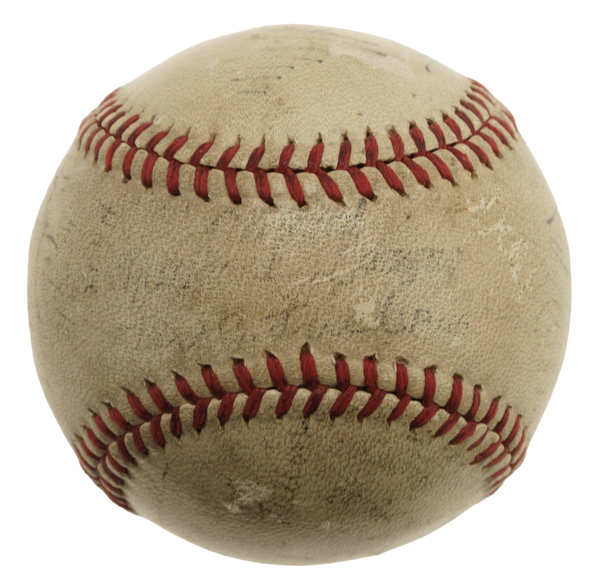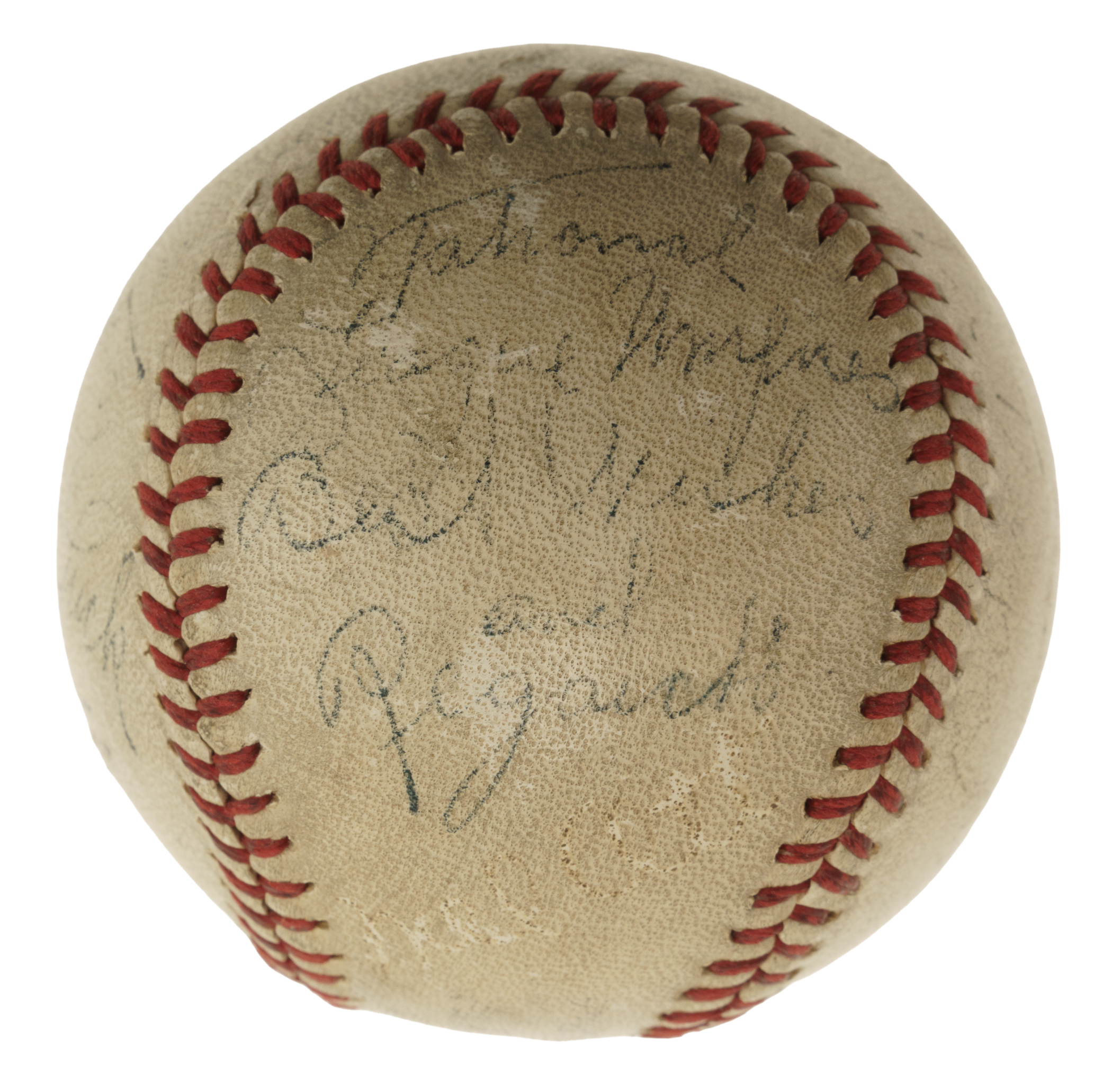 Red-stitched baseball signed in black ink by Pie Traynor and Llyod Waner. Per James/Spence/JSA, the ball also features an extremely faint Mel Ott signature. Multiple other signatures/ and notations are also present. The ball is soiled throughout and exhibits several surface abrasions. Fair condition overall. Auction LOA from James Spence/JSA.