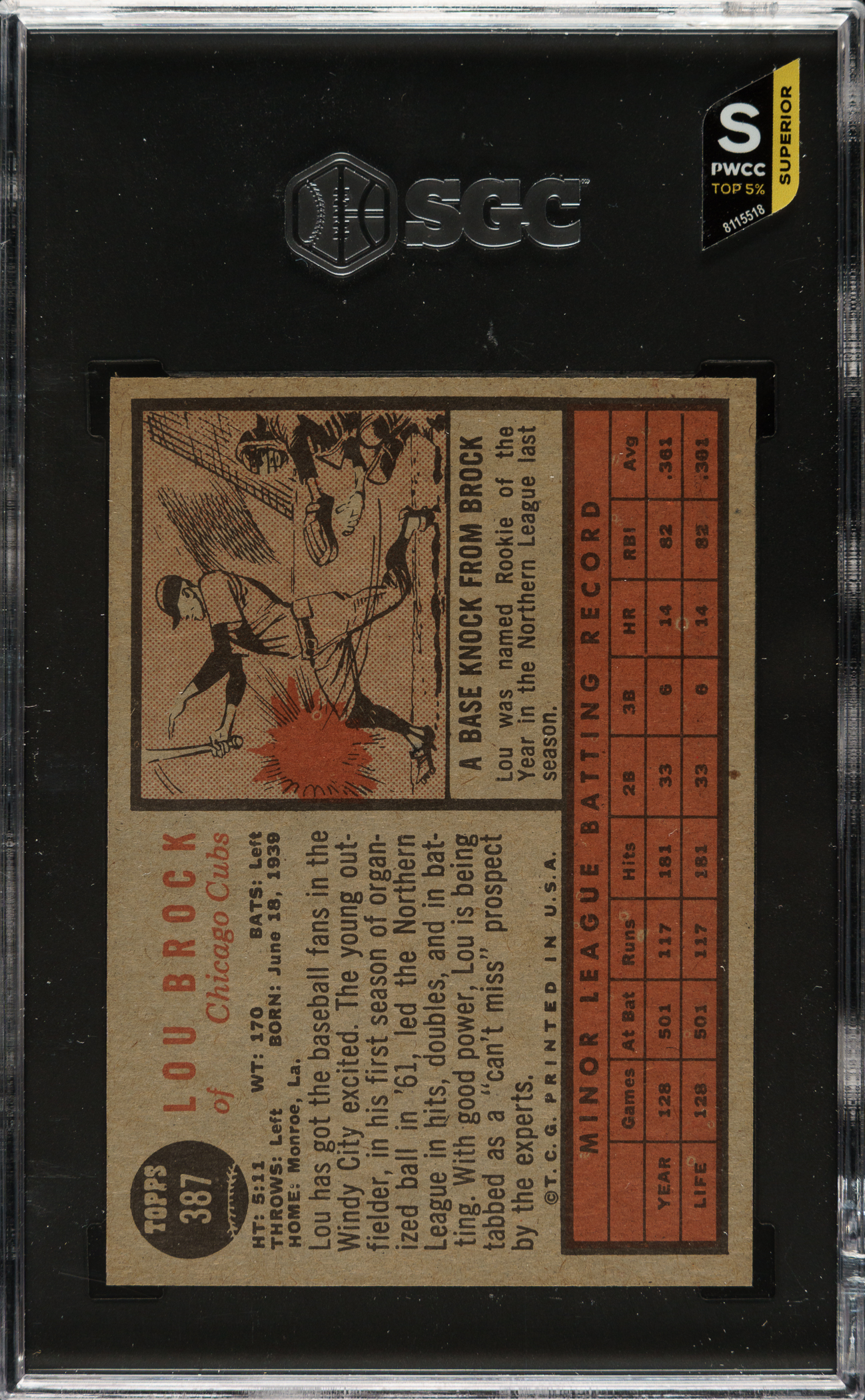 Graded NM+ 7.5 by SGC. Chicago Cubs Hall of Famer Lou Brock.