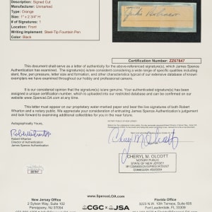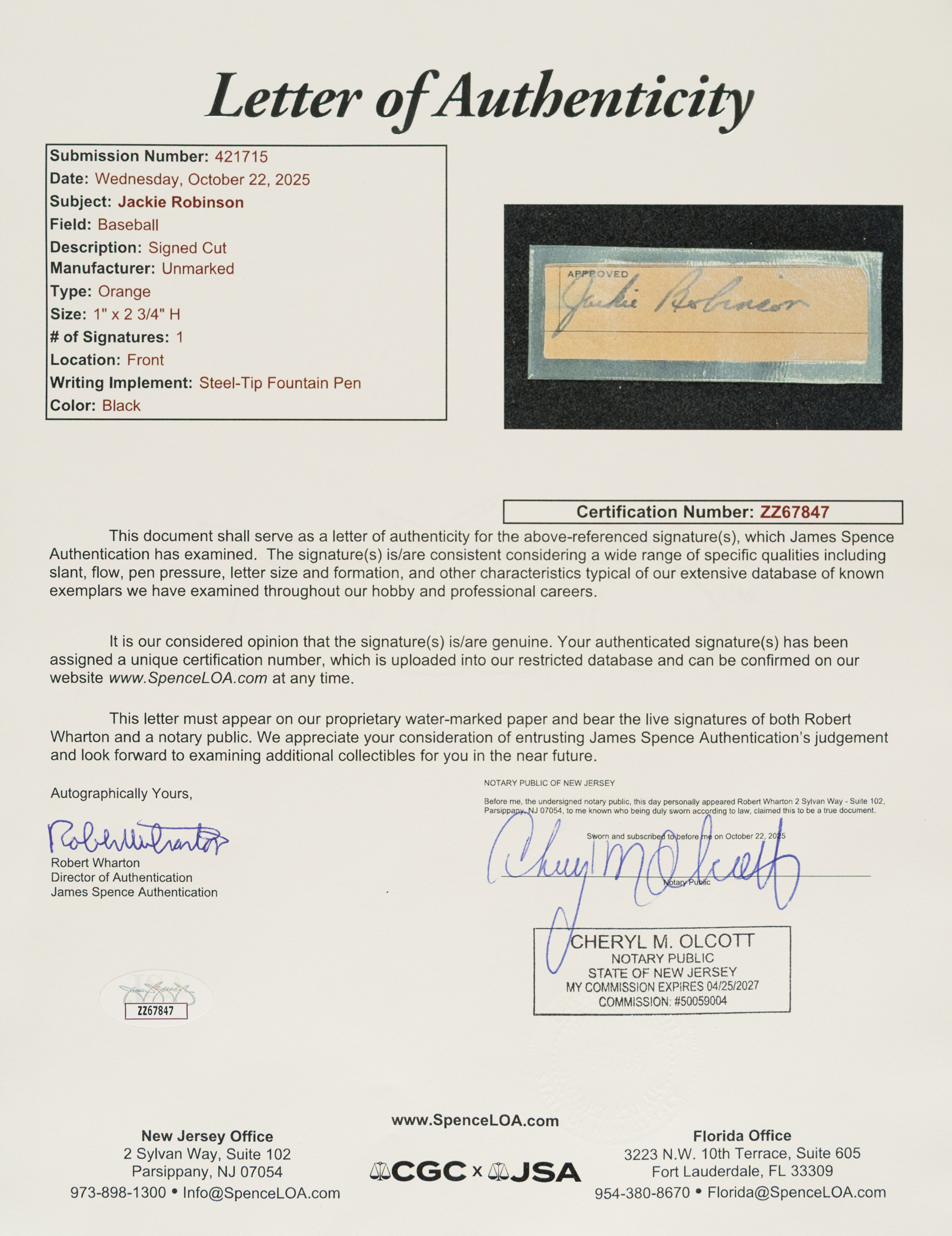 Cut signature of Brooklyn Dodgers Hall of Famer Jackie Robinson. Signed by Robinson in black ink along a portion of a document. The cut (2.5 x .75 inches) is laminated but otherwise in Excellent condition overall. Full LOA from James Spence/JSA.