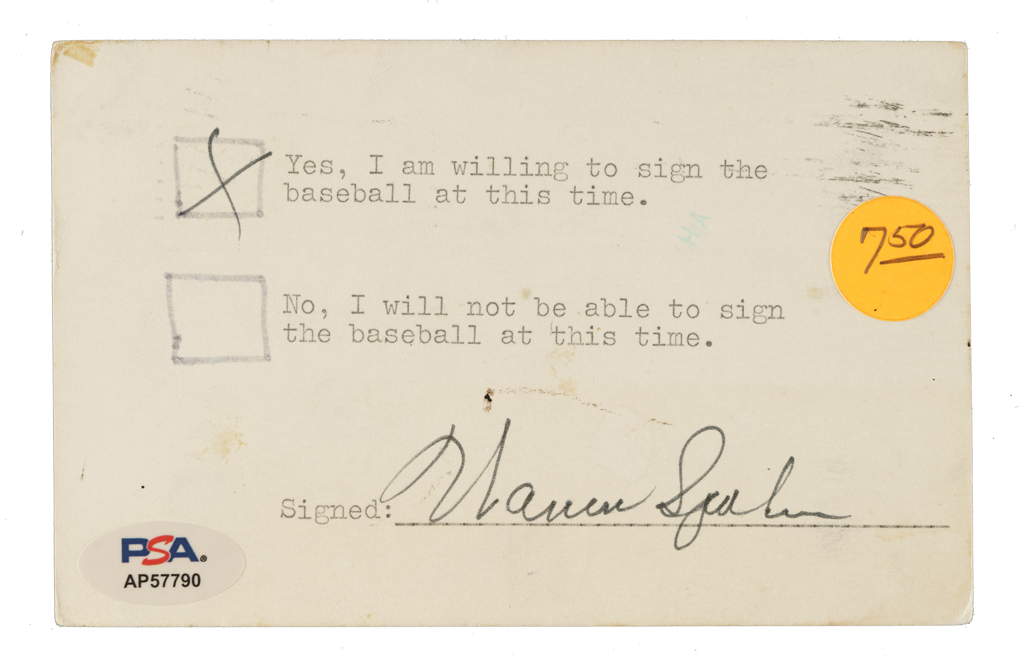 Milwaukee Braves Hall of Famer Warren Spahn cut signature. Total dimensions: 3-1/2 x 5-1/2 Inches. PSA/DNA certification sticker is affixed to the cut.
