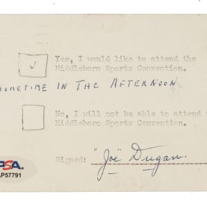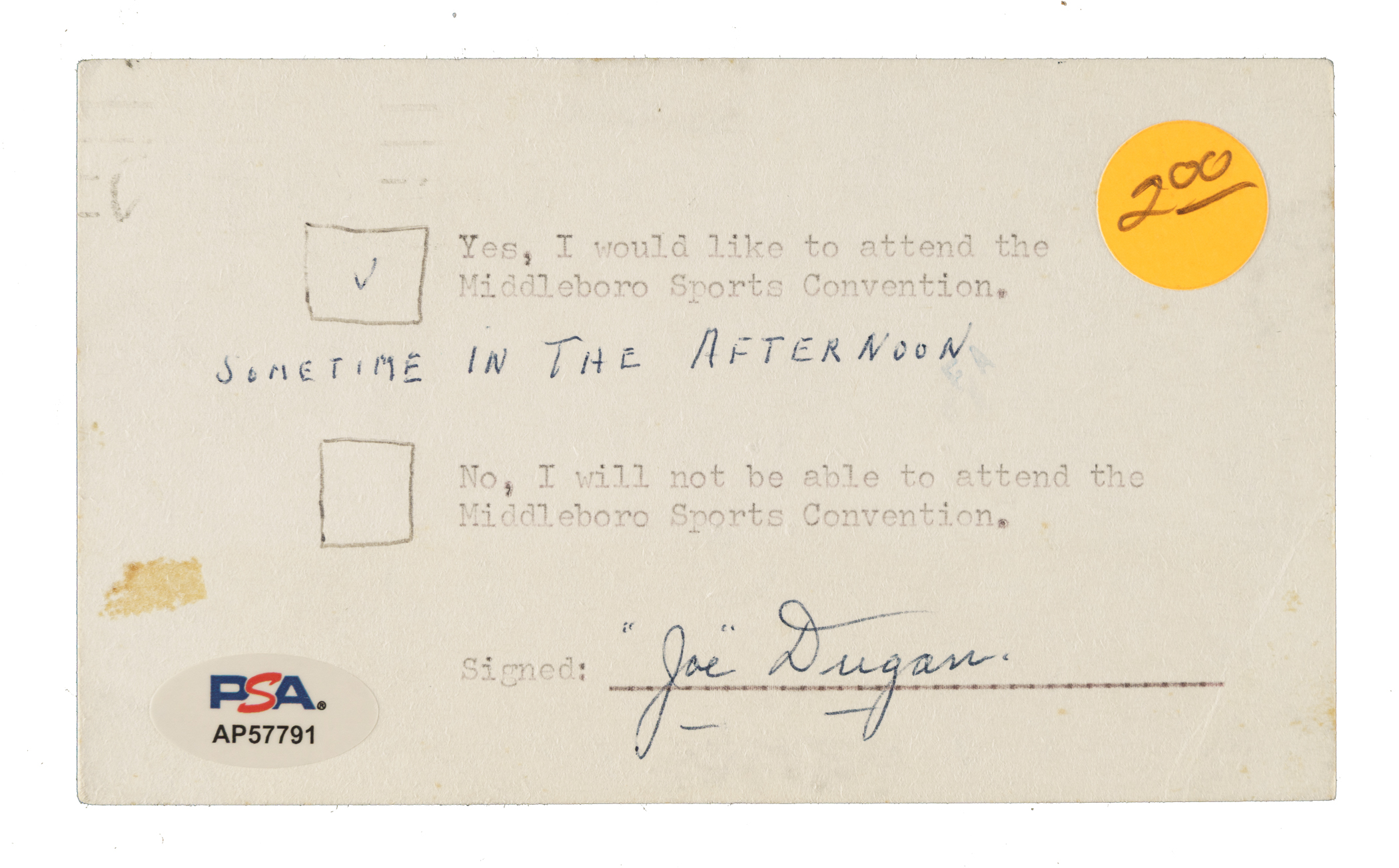 New York Yankees Joe Dugan cut signature. Total dimensions: 3-1/4 x 5-1/2 Inches. PSA/DNA certification sticker is affixed to the cut.