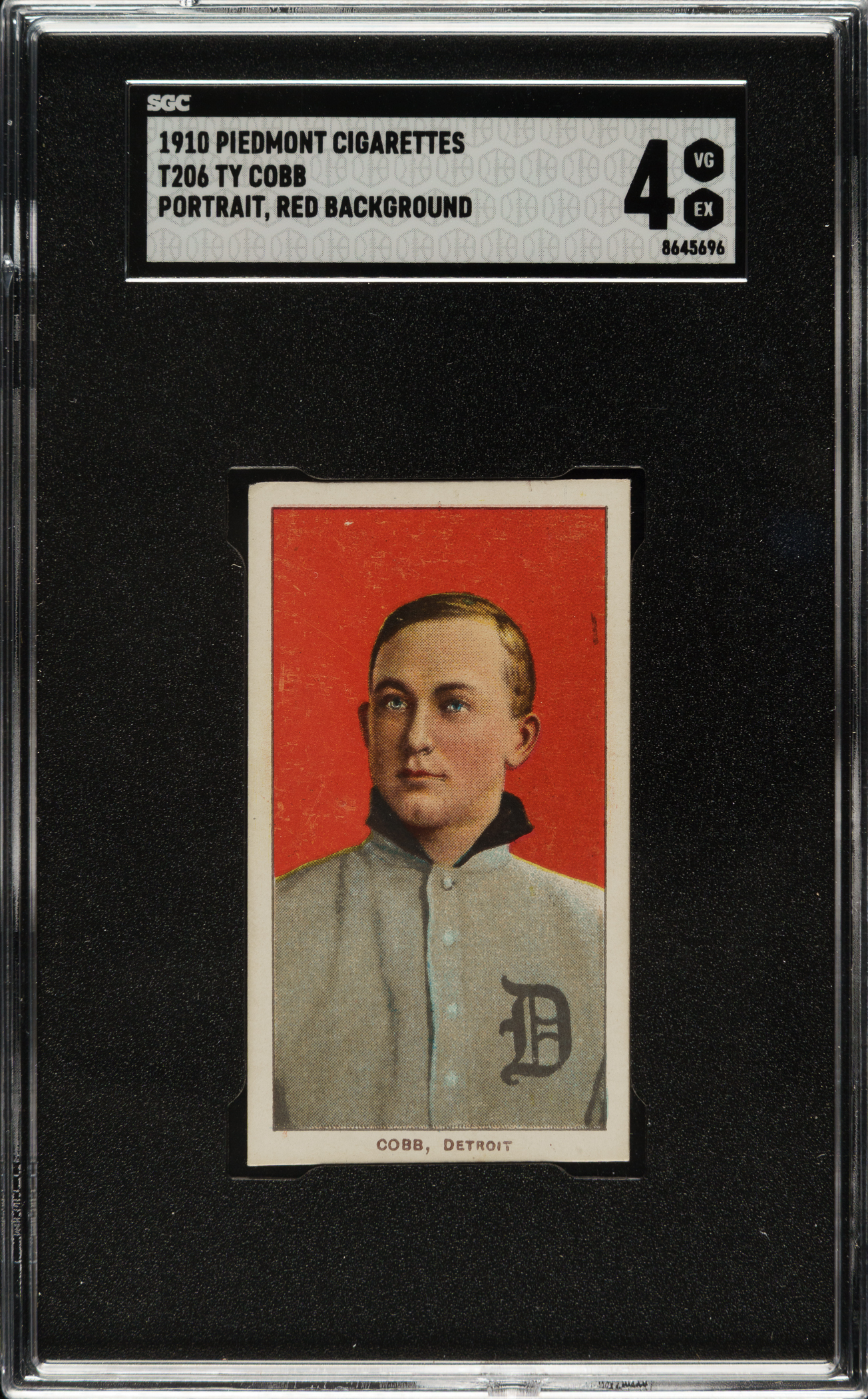 Graded VG/EX 4 by SGC. Outstanding mid-grade example of one of Detroit Tigers Hall of Famers Ty Cobb's iconic cards. The red-background pose has long been considered one of the classics of the T206 set and of all vintage cards. This well-centered example features a brilliant red background, outstanding registration, and light corner wear. Boldly printed Piedmont 350 advertising reverse. The red-background Cobb portrait is one of the key cards of the set, and this example would be a highlight in any high-quality T206, Hall of Famer, or Ty Cobb card collection.