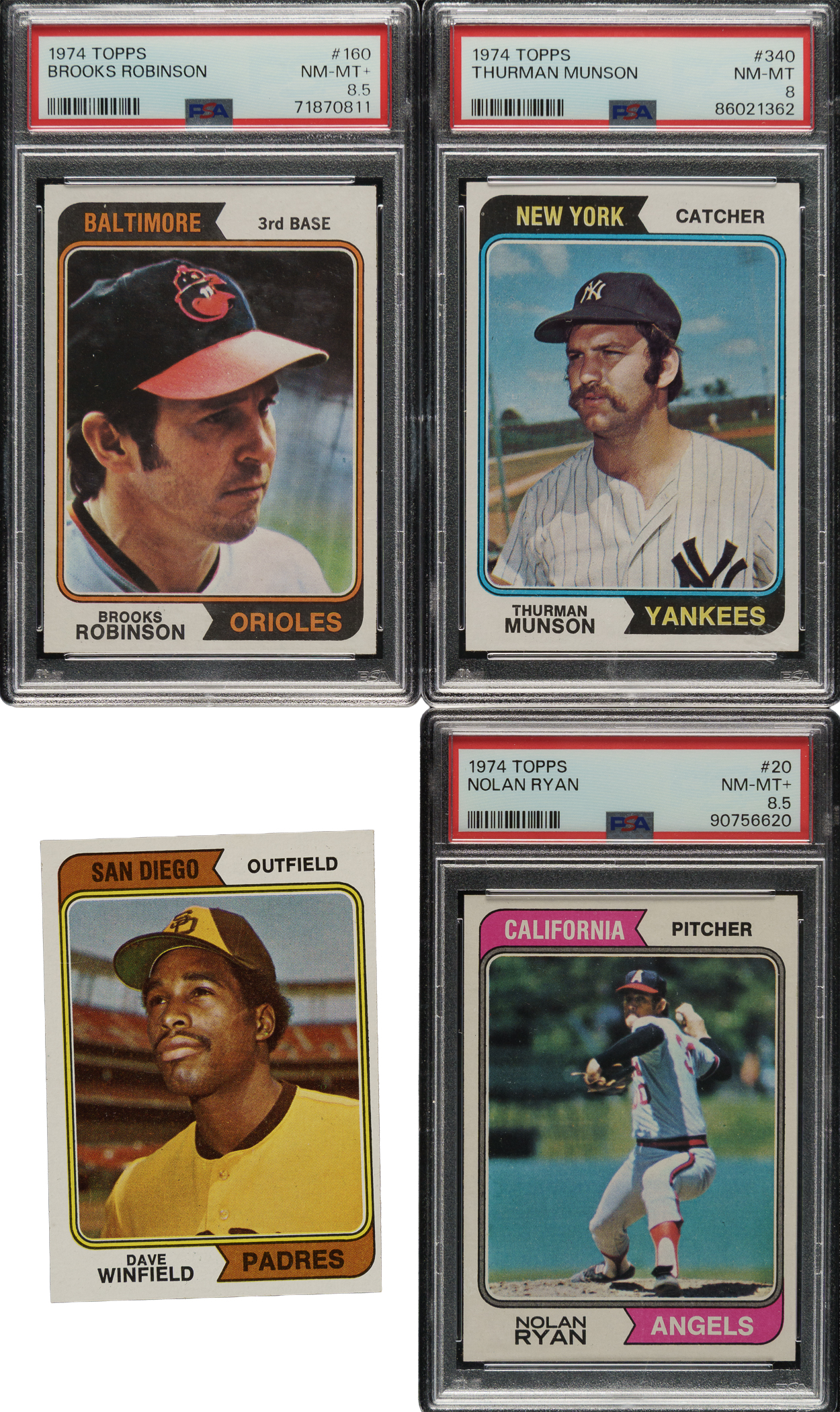 This is an outstanding high-grade complete set of 1974 Topps baseball cards plus complete 44-card traded series. Condition is 35% Nr/Mt to Nr/Mt-Mt (including a few higher), 53% Ex to Ex-Mt, and 12% Vg to Vg-Ex. Three cards have been professionally graded and encapsulated by PSA. Keys: #1 Aaron (Ex-Mt), 10 Bench (Vg-Ex), 20 Ryan (NM-MT+ 8.5), 130 Jackson (Vg-Ex+), 160 B. Robinson (NM-MT+ 8.5), 252 Parker RC (Ex-Mt+), 283 Schmidt (smoothed out corners from storage in screwdown holder, otherwise Nr/Mt), 300 Rose (Ex+), 340 Munson (NM-MT 8), 456 Winfield RC (Ex due to centering), and 598 Griffey Sr. RC (Ex-Mt). Condition of the traded series is 5% Nr/Mt, 38% Ex to Ex-Mt, and 57% Vg to Vg-Ex (including a few lesser). This is a superior, mostly high-grade 1974 Topps complete set (plus traded series) with numerous highlights. Total: 704 cards. The size/weight of this item requires that there will be an additional shipping charge for this lot.